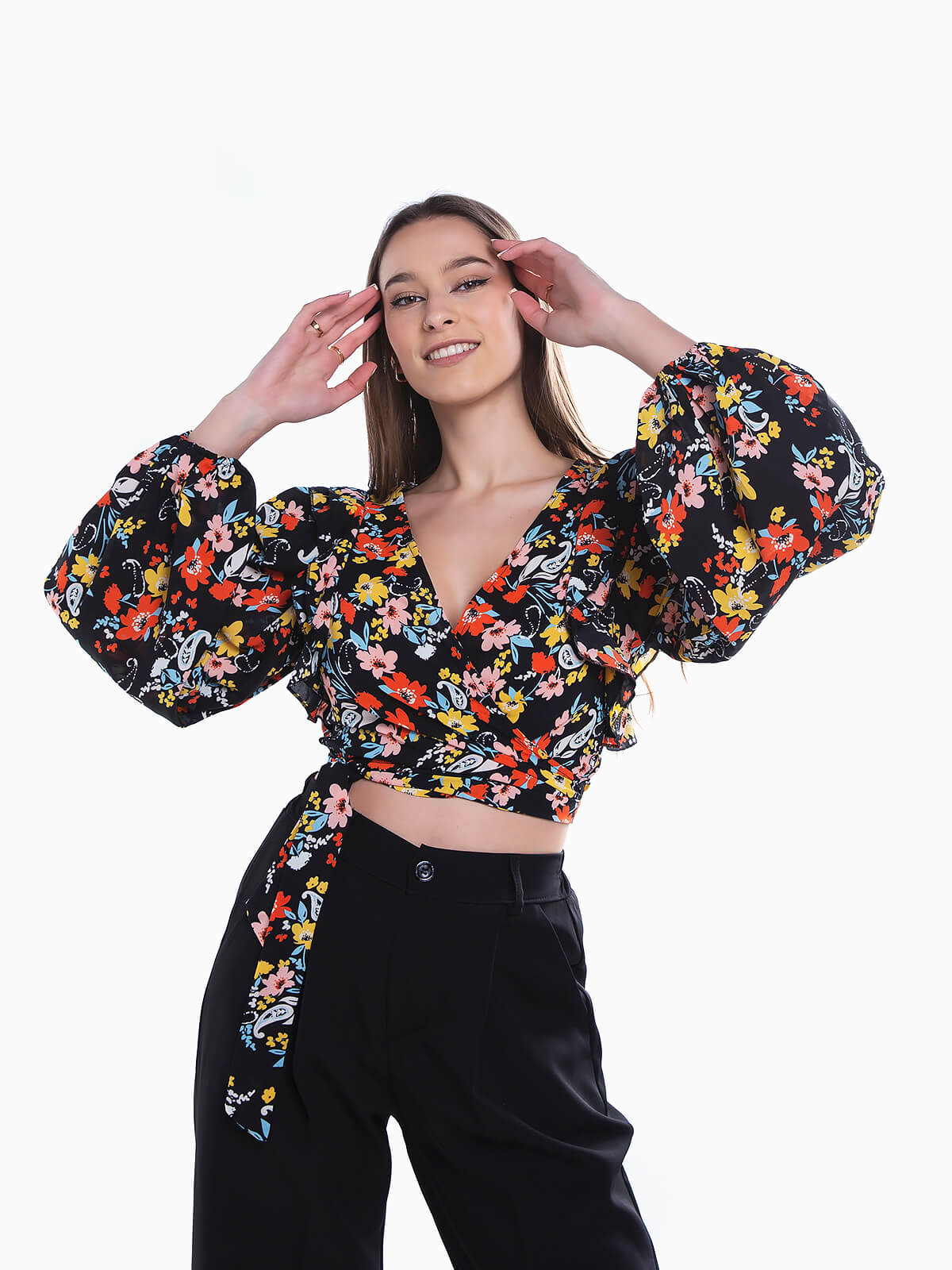 Blusa cropped de cor preta às flores para senhora. Blusa em tecido fluído com decote de trespasse. Folhos nos ombros. Manga comprida. Punhos elásticos.