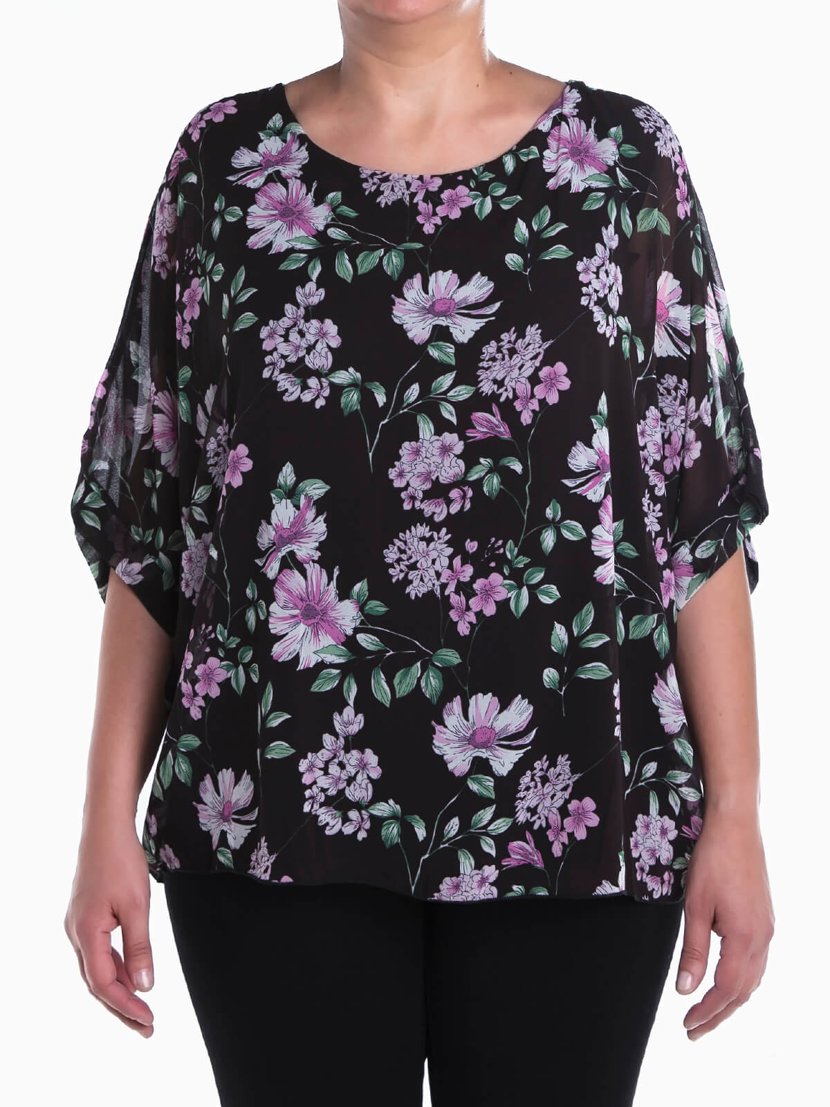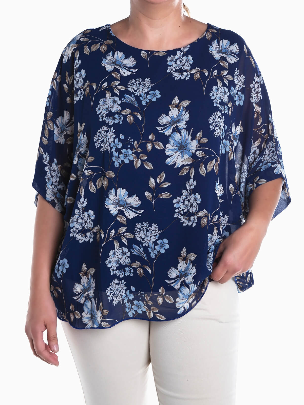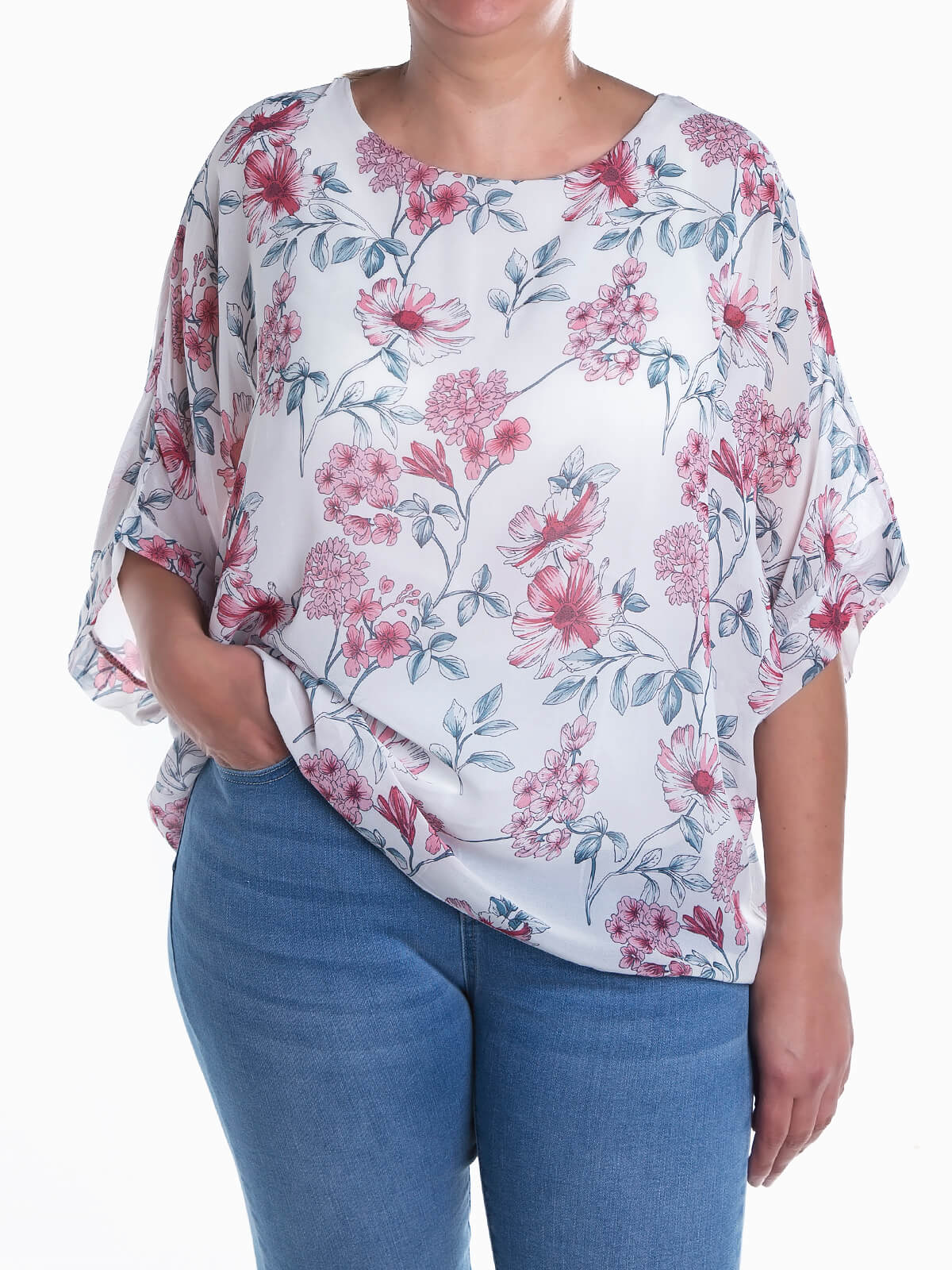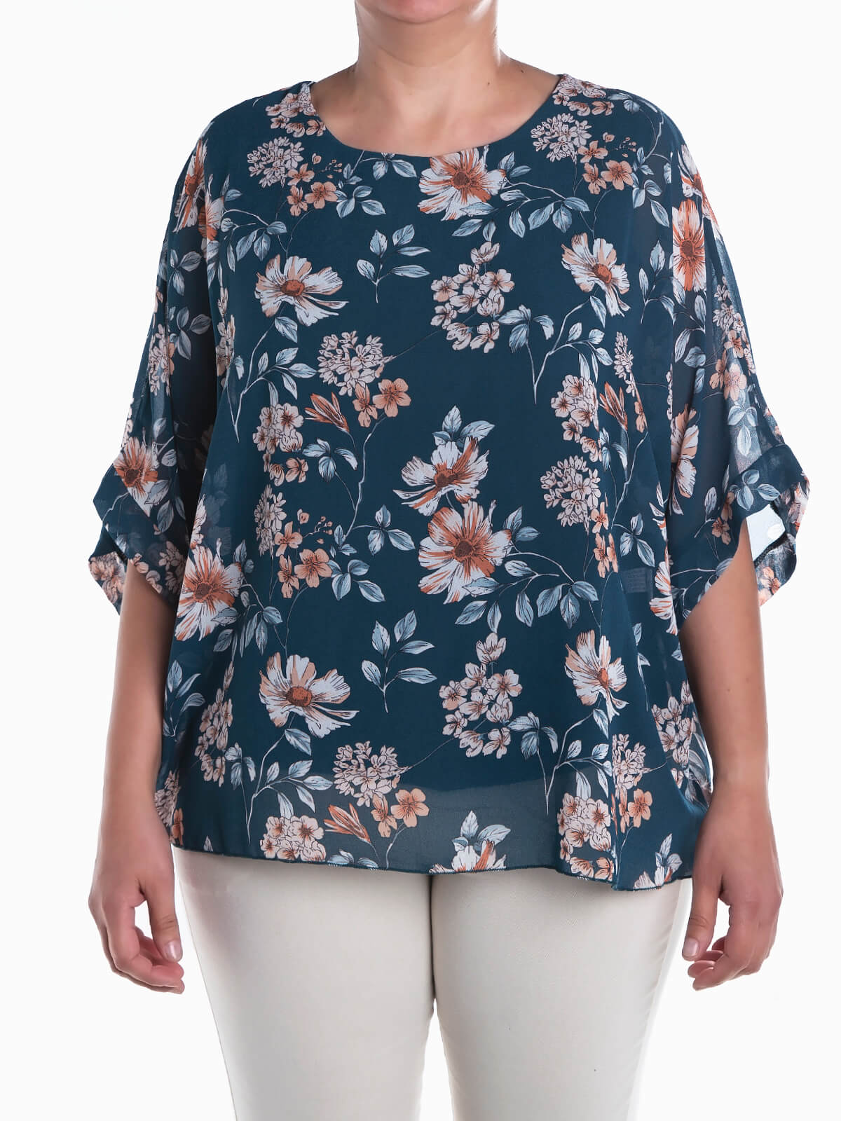 Blusa estampado floral com manga 3/4 para senhora. Blusa fluída com interior forrado e decote redondo.