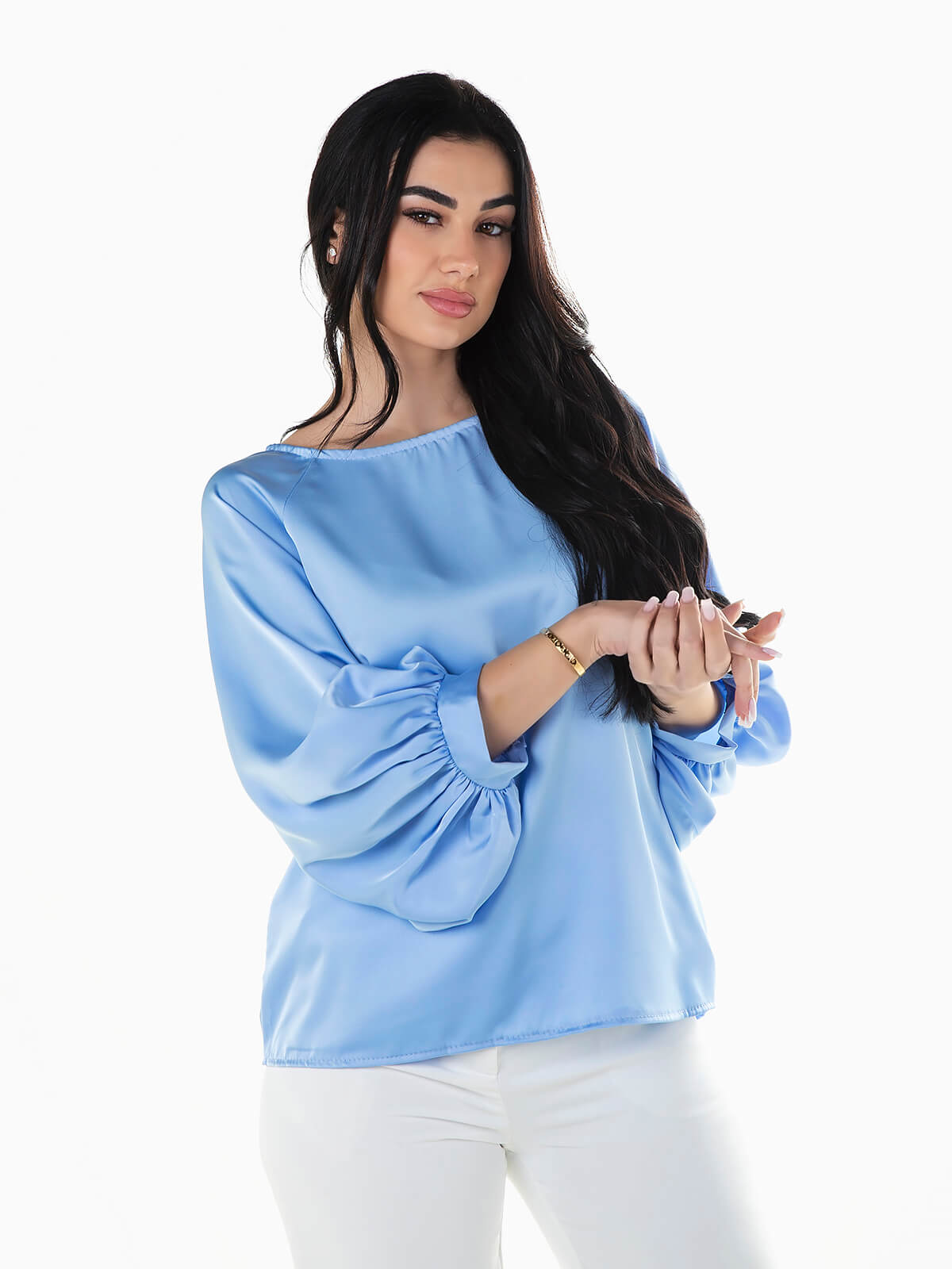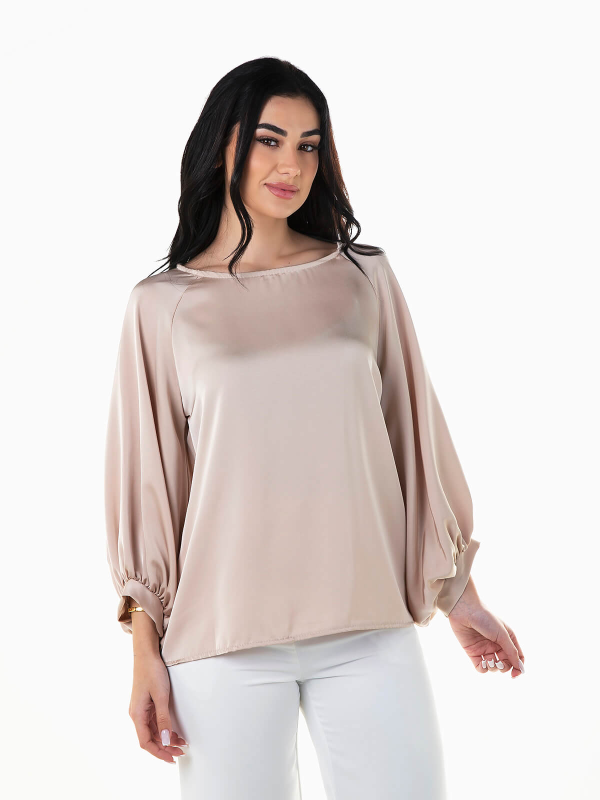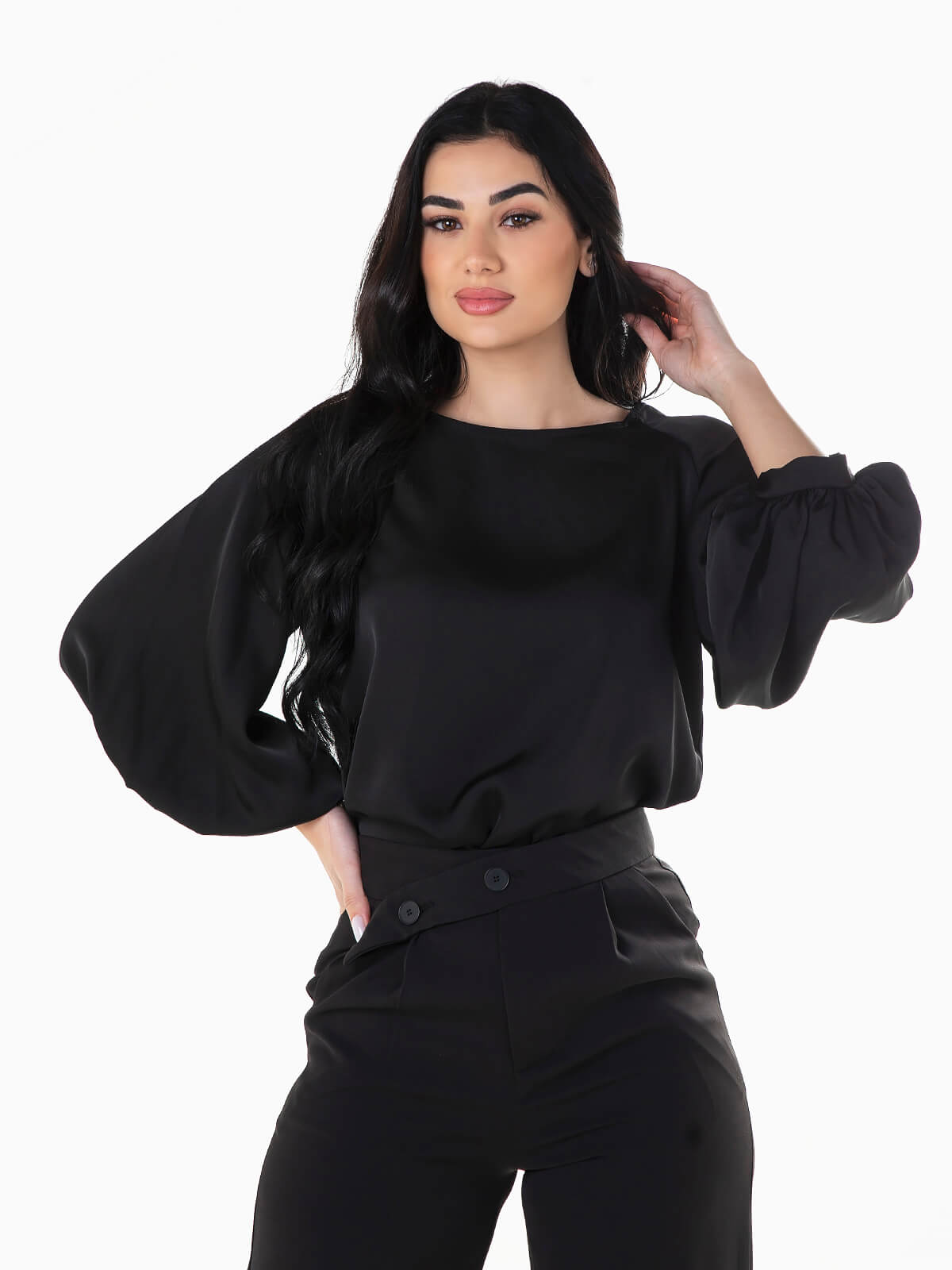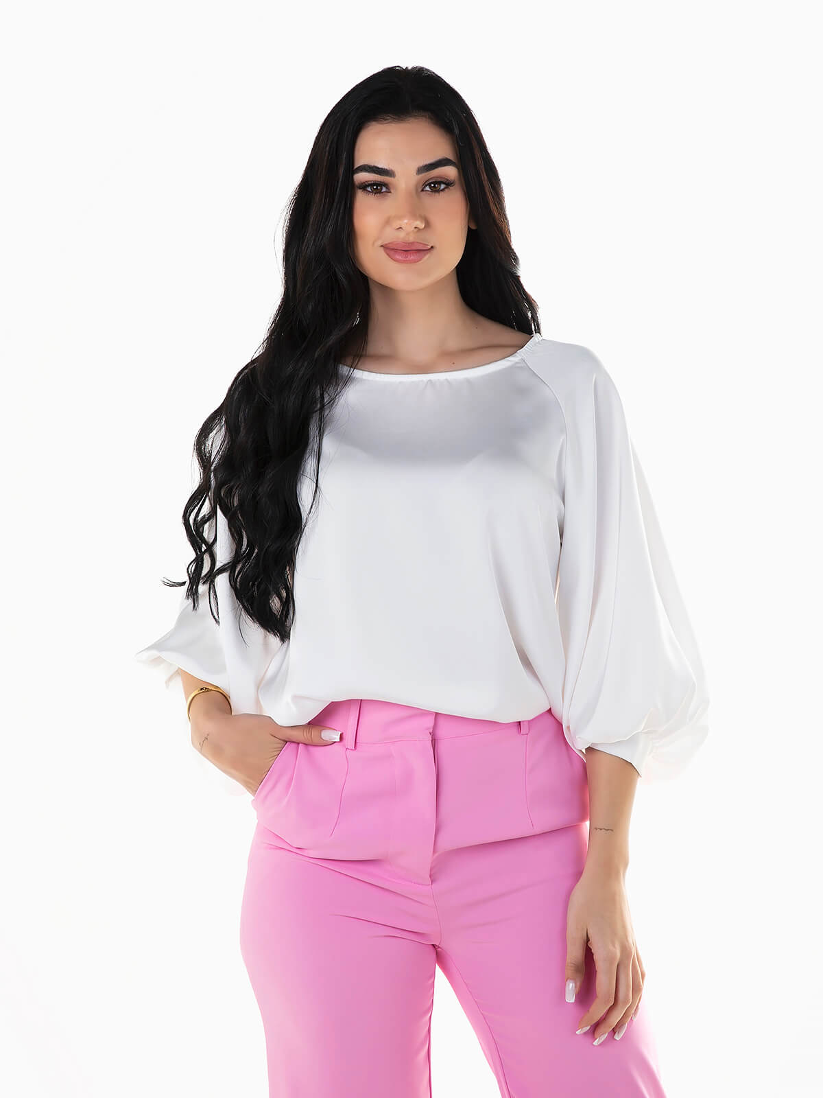Blusa fluída acetinada com manga raglan abalonada para senhora. Blusa com decote barco e aperto posterior de botão.
