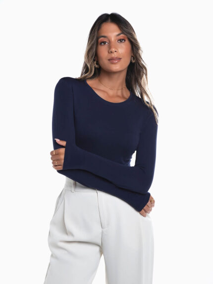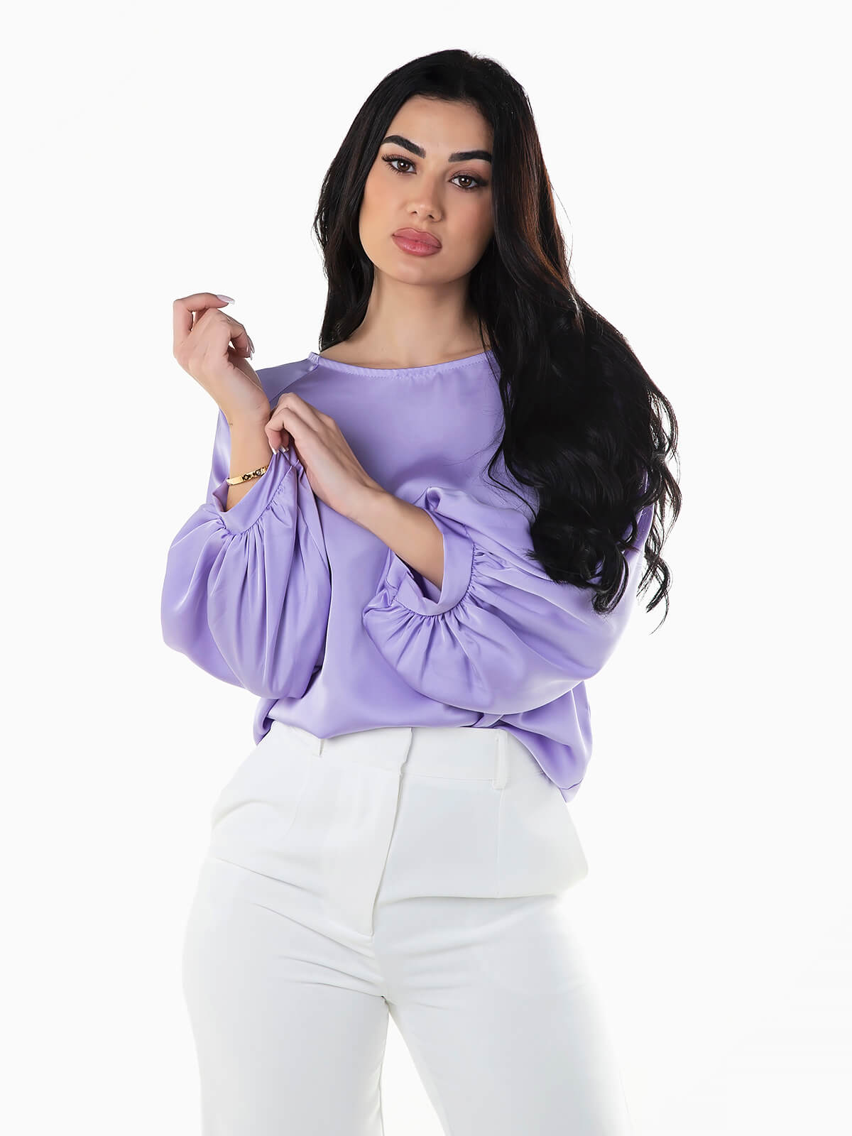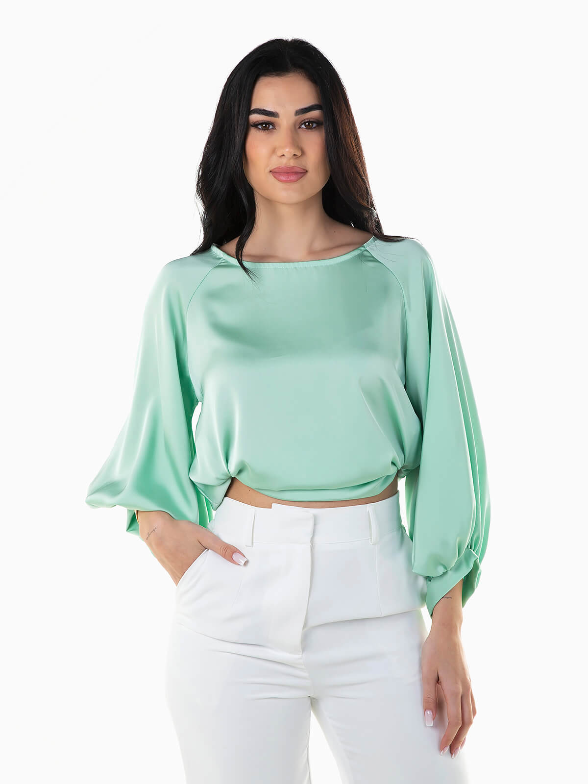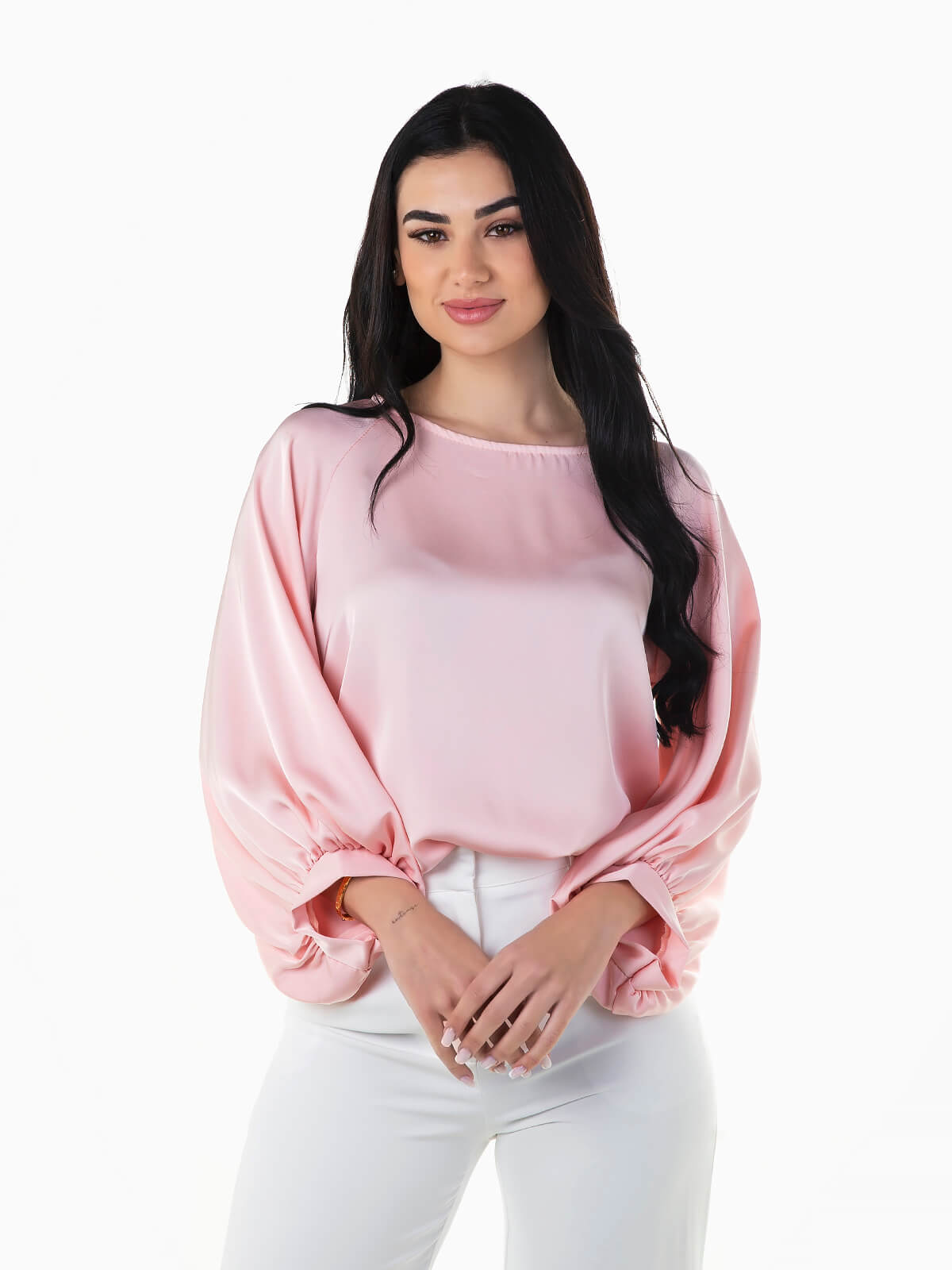 Blusa fluída acetinada com manga raglan abalonada para senhora. Blusa com decote barco e aperto posterior de botão.