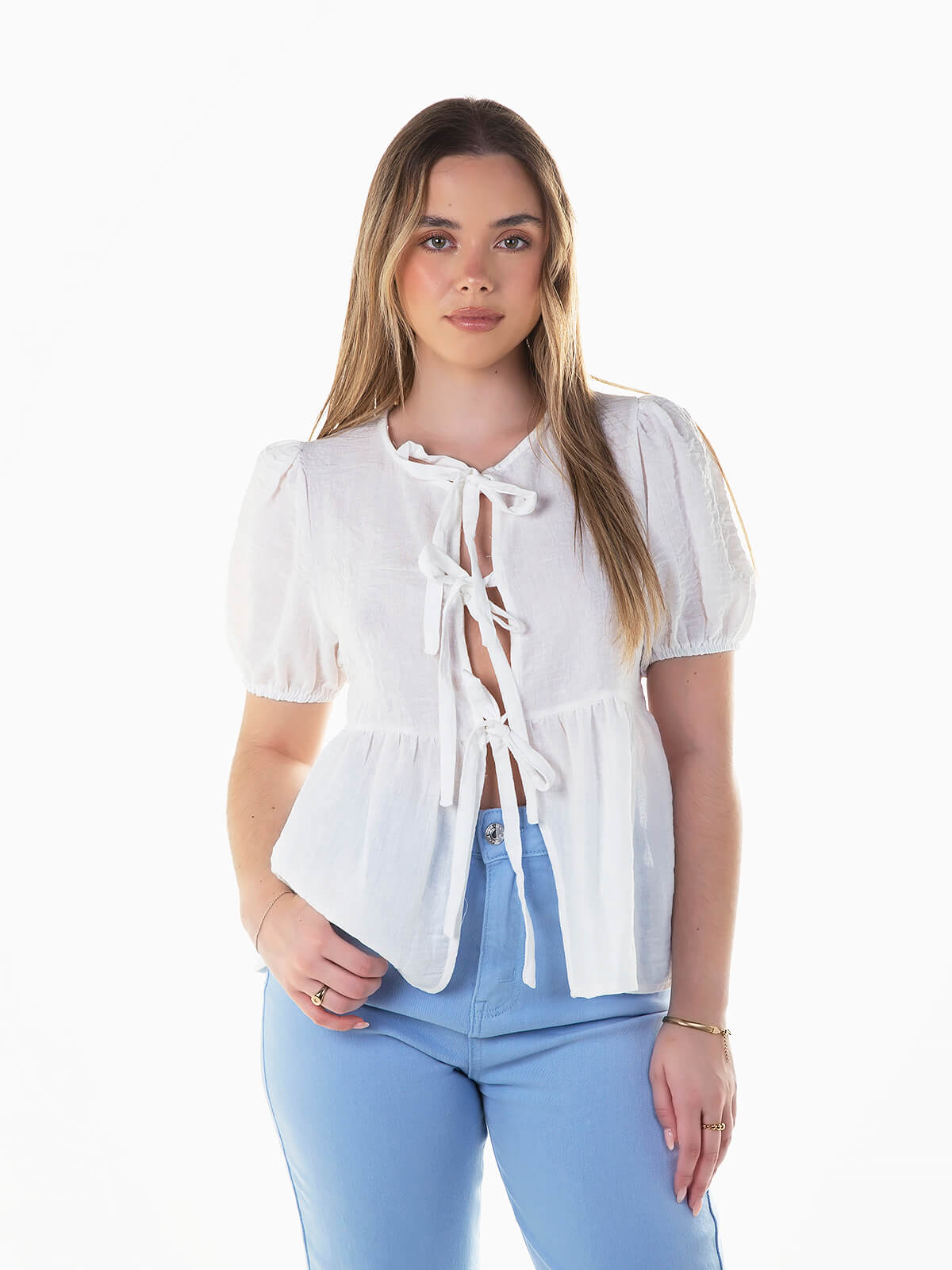 Blusa de tecido fluído com abertura de três pares de atilhos na frente. Decote redondo e manga curta abalonada a terminar com elástico. Costura franzida na cintura.