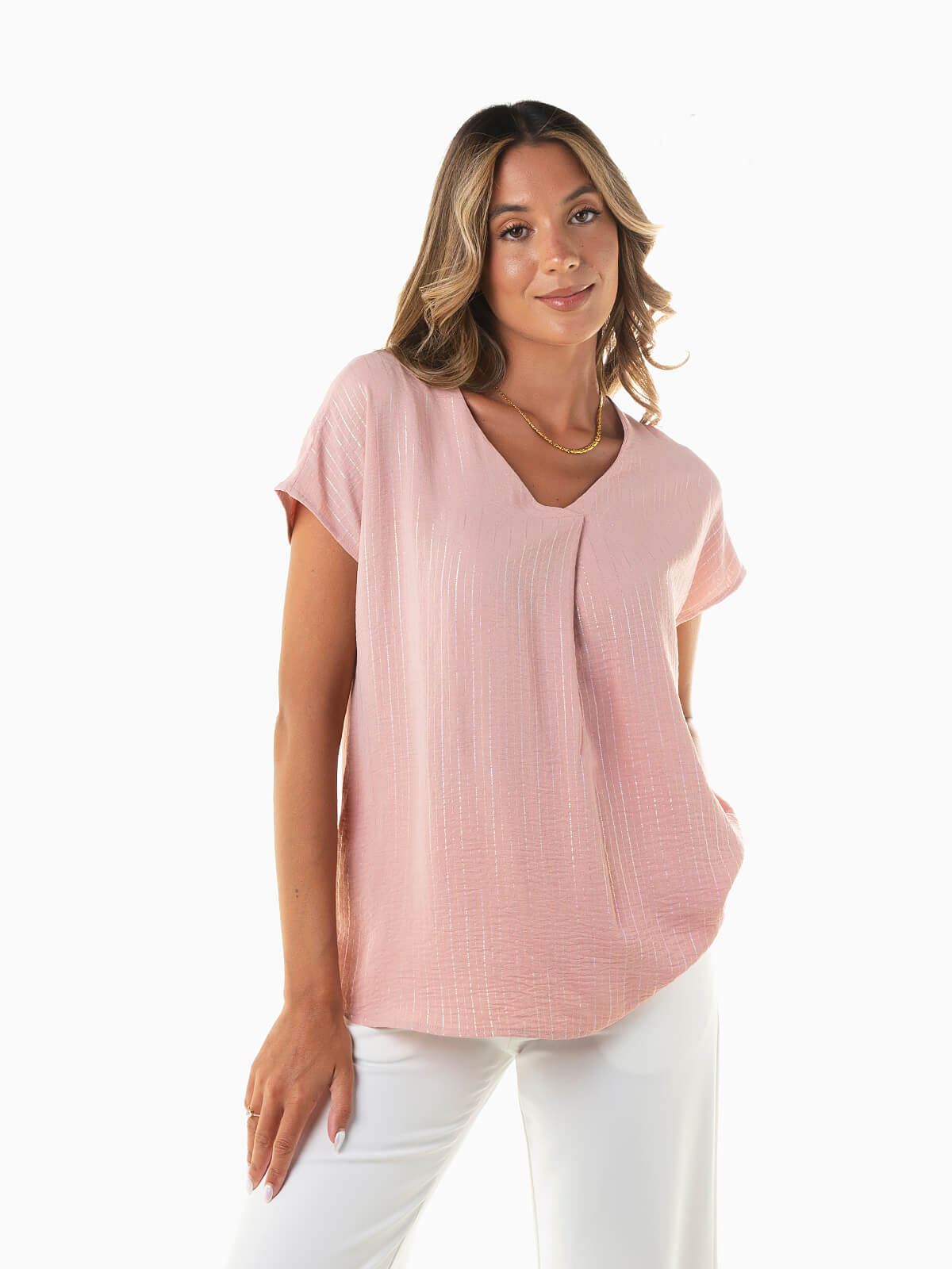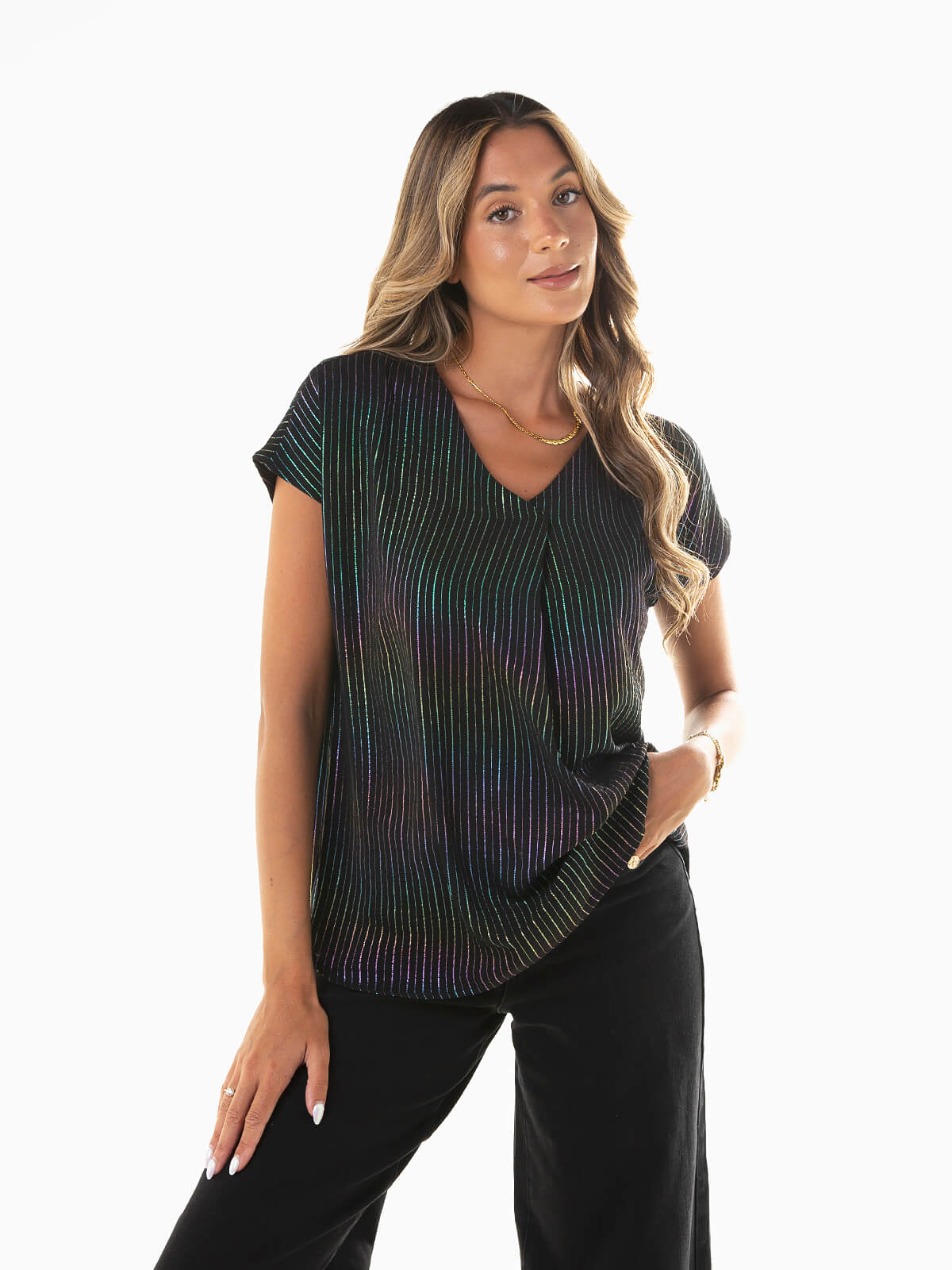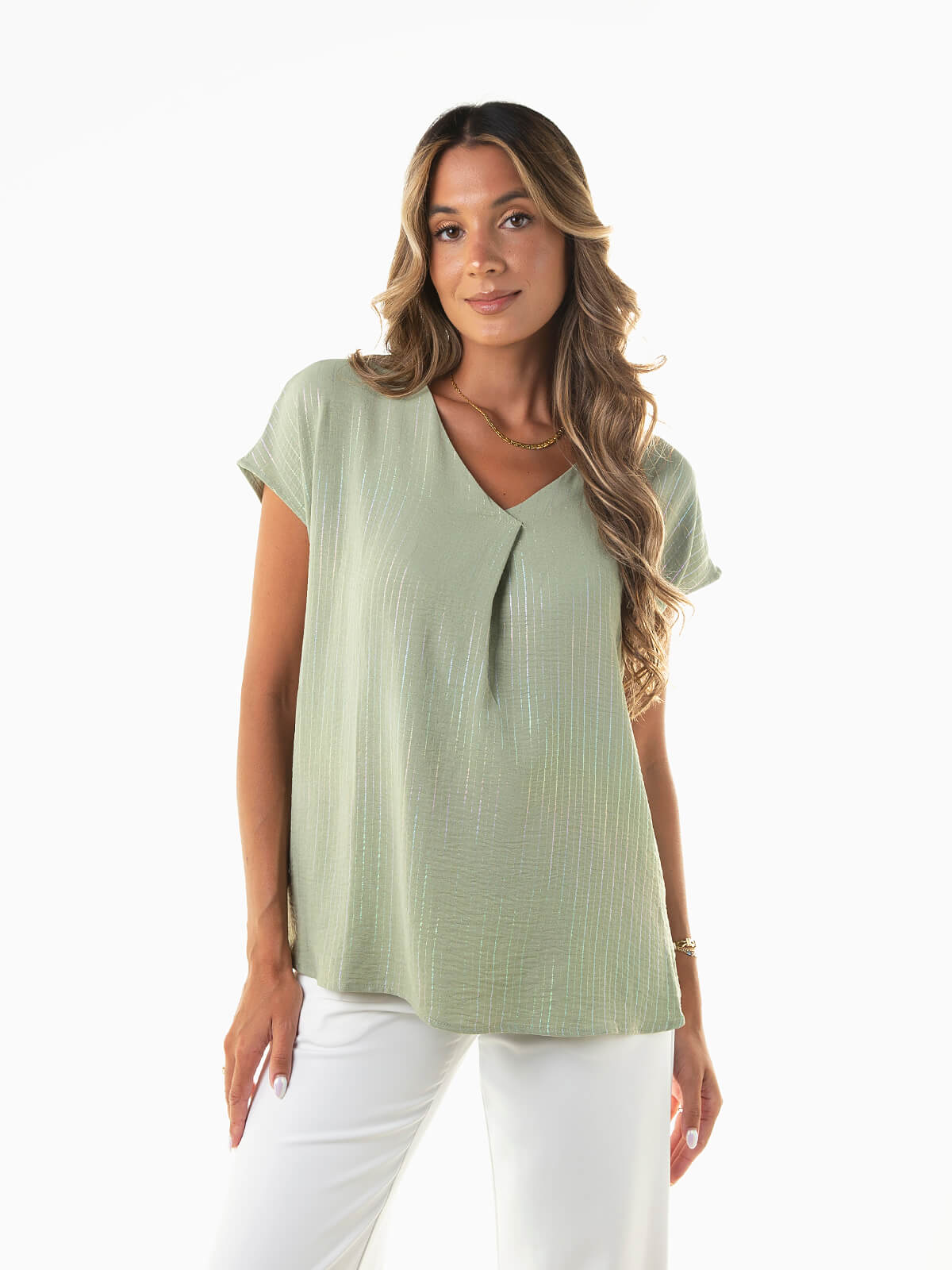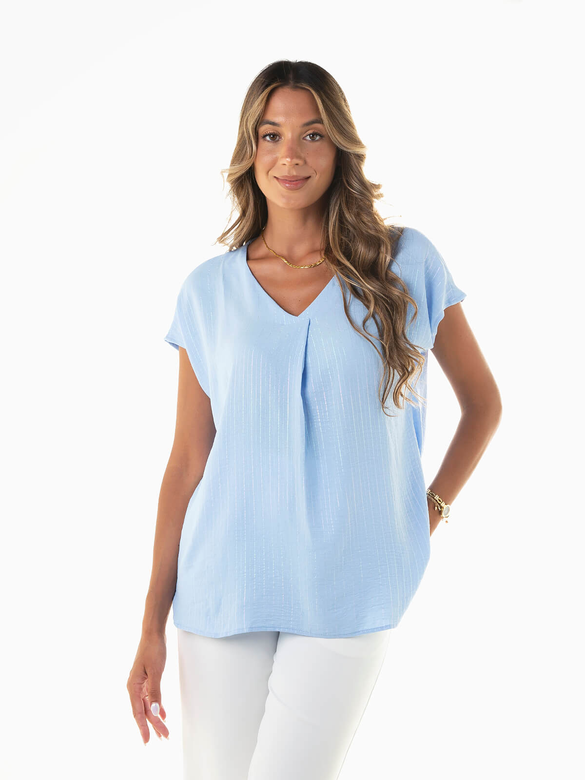 Blusa larga com riscas em fios luréx para efeito brilhante. Blusa de manga curta com decote em V. Combina com umas calças de alfaitaria e umas sandálias para um look elegante.