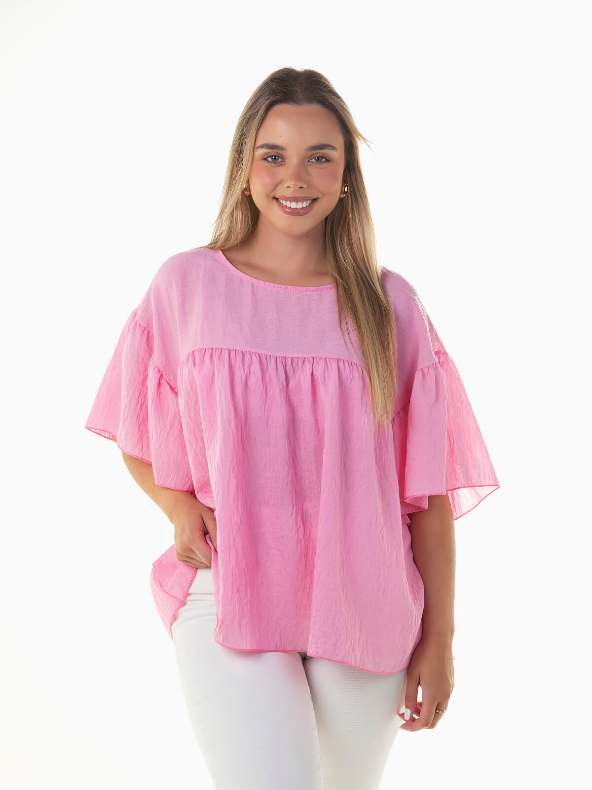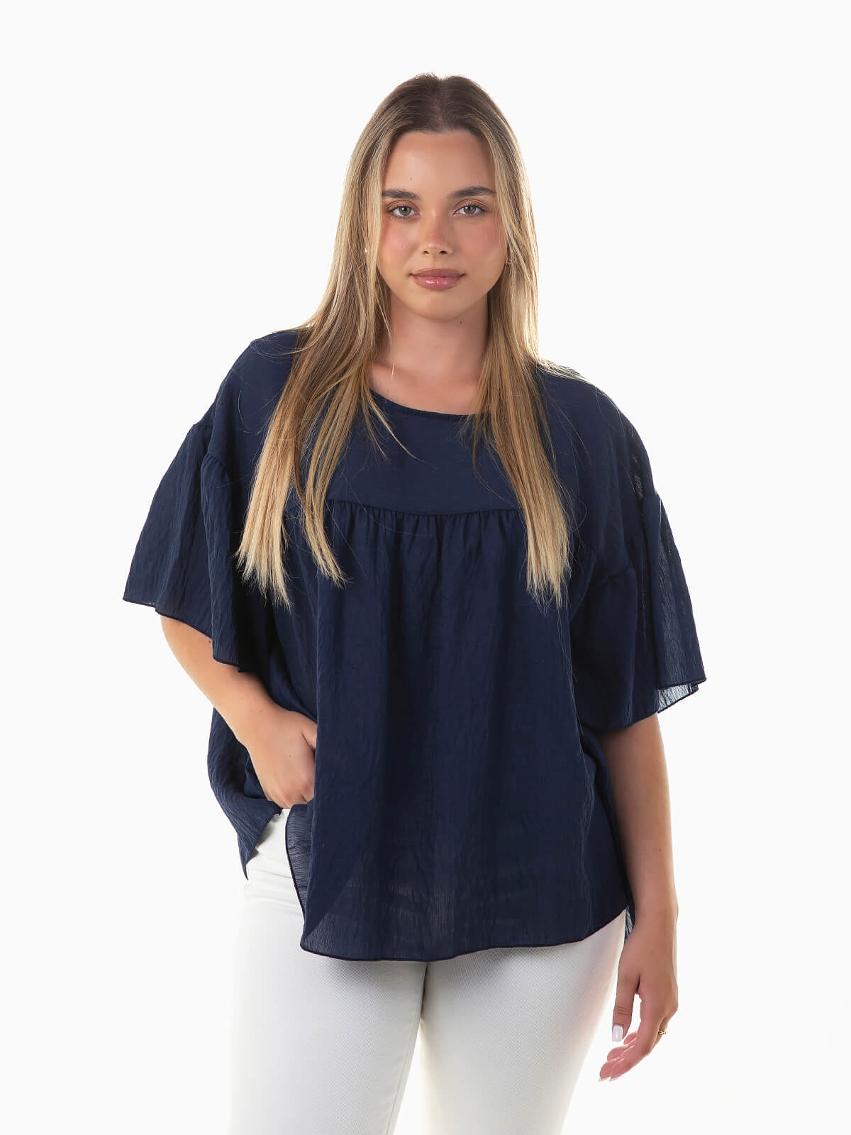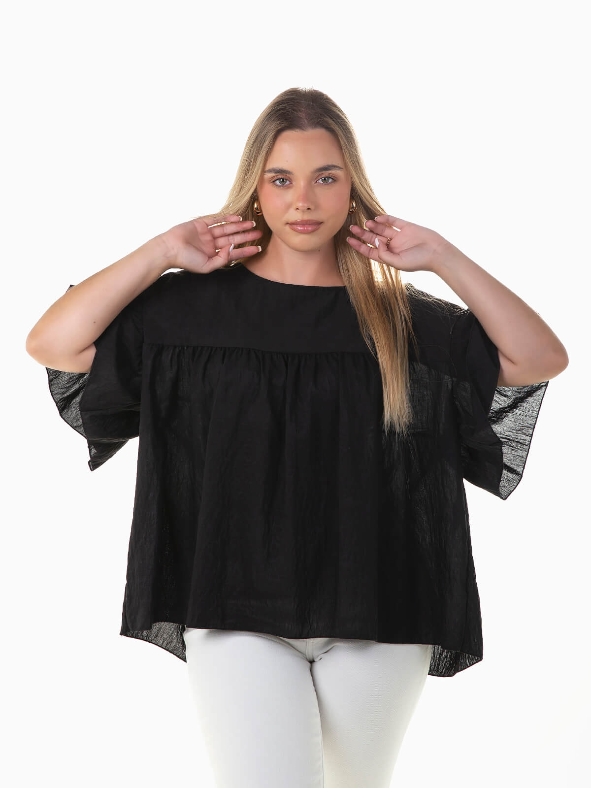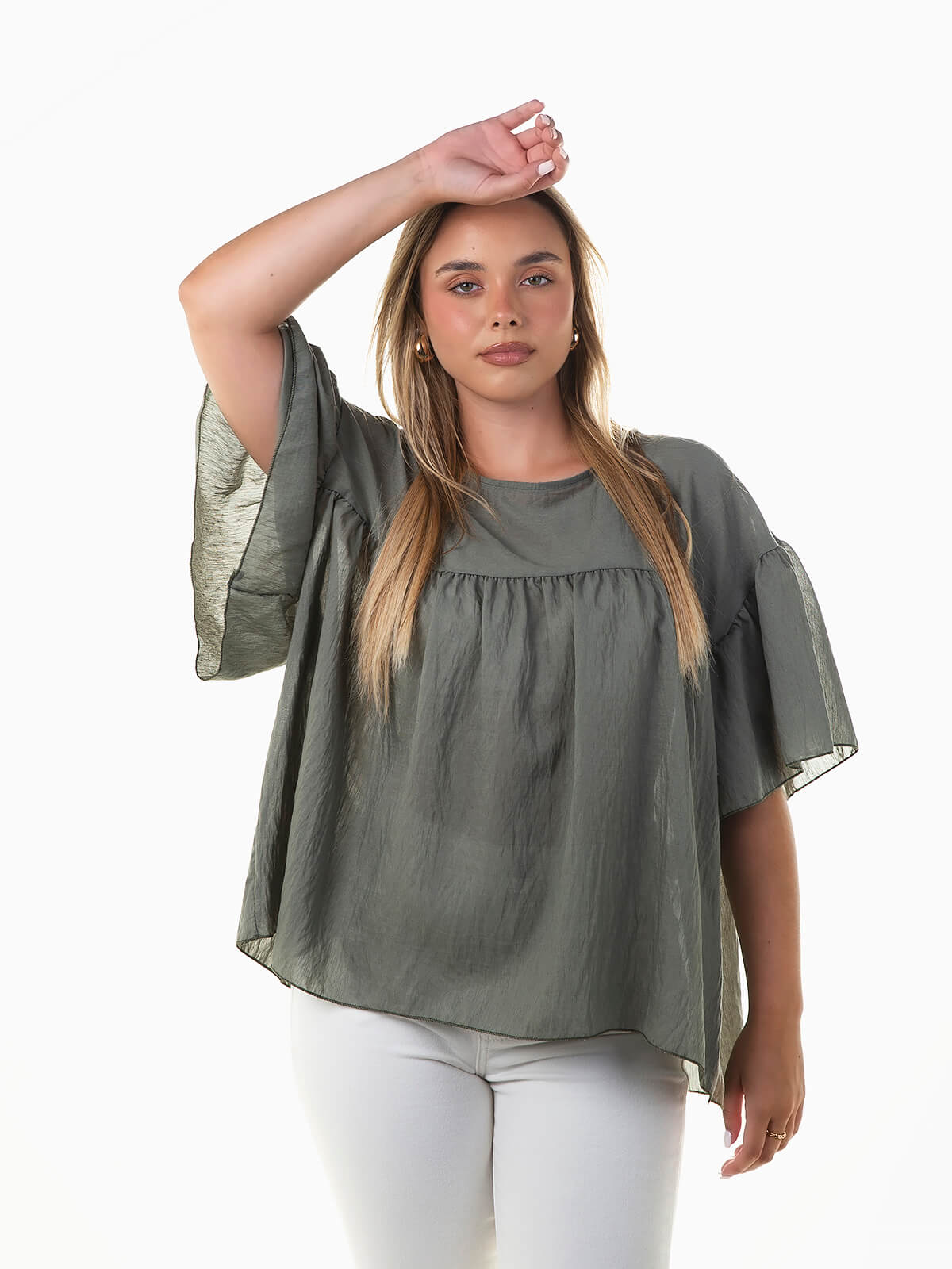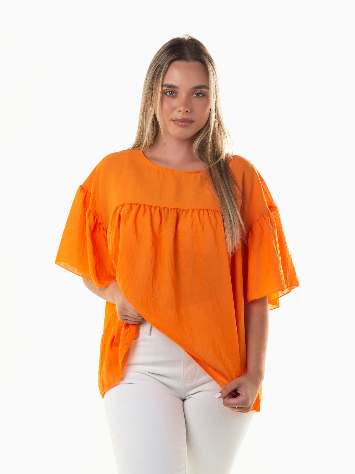Blusa fluída confecionada em tecido com mistura de linho para maior conforto e respirabilidade. Blusa com decote redondo. Manga com folho.
