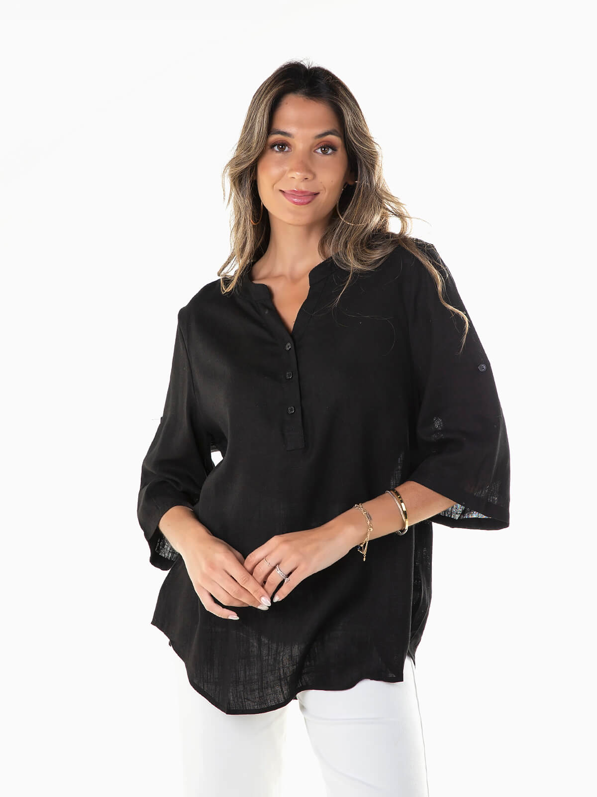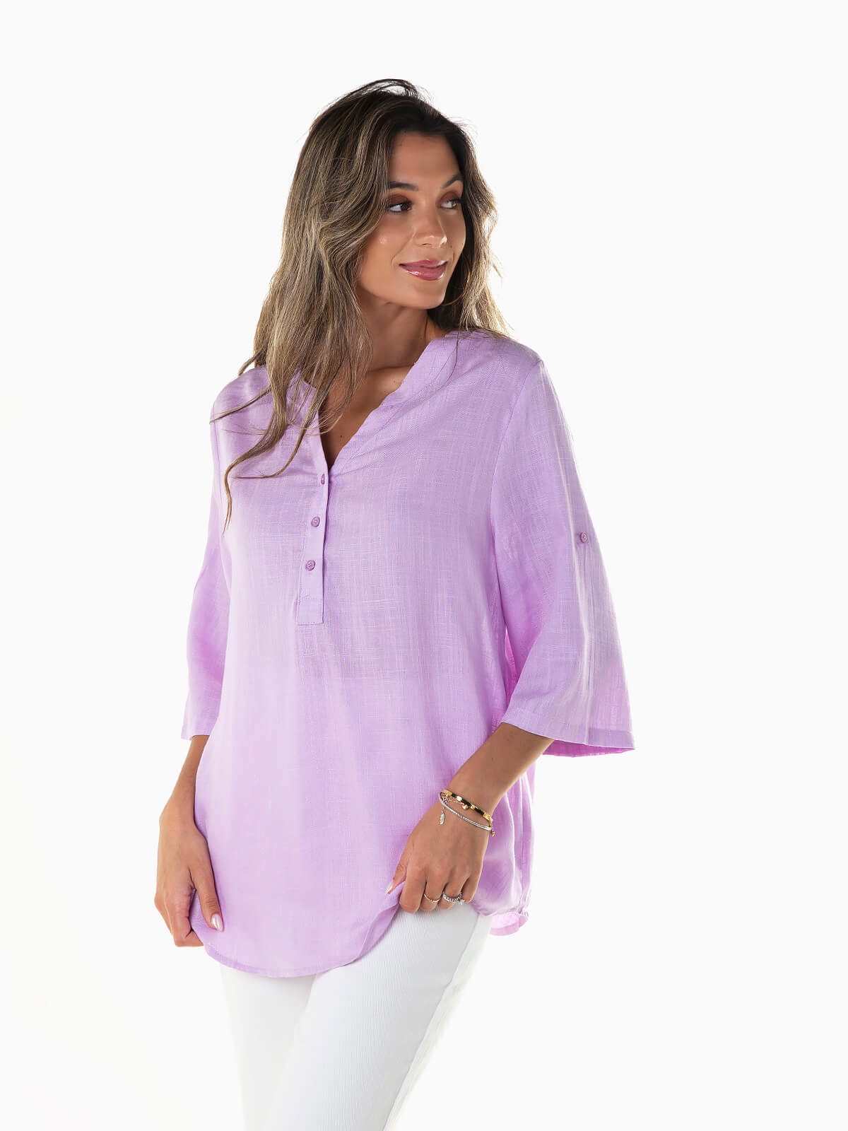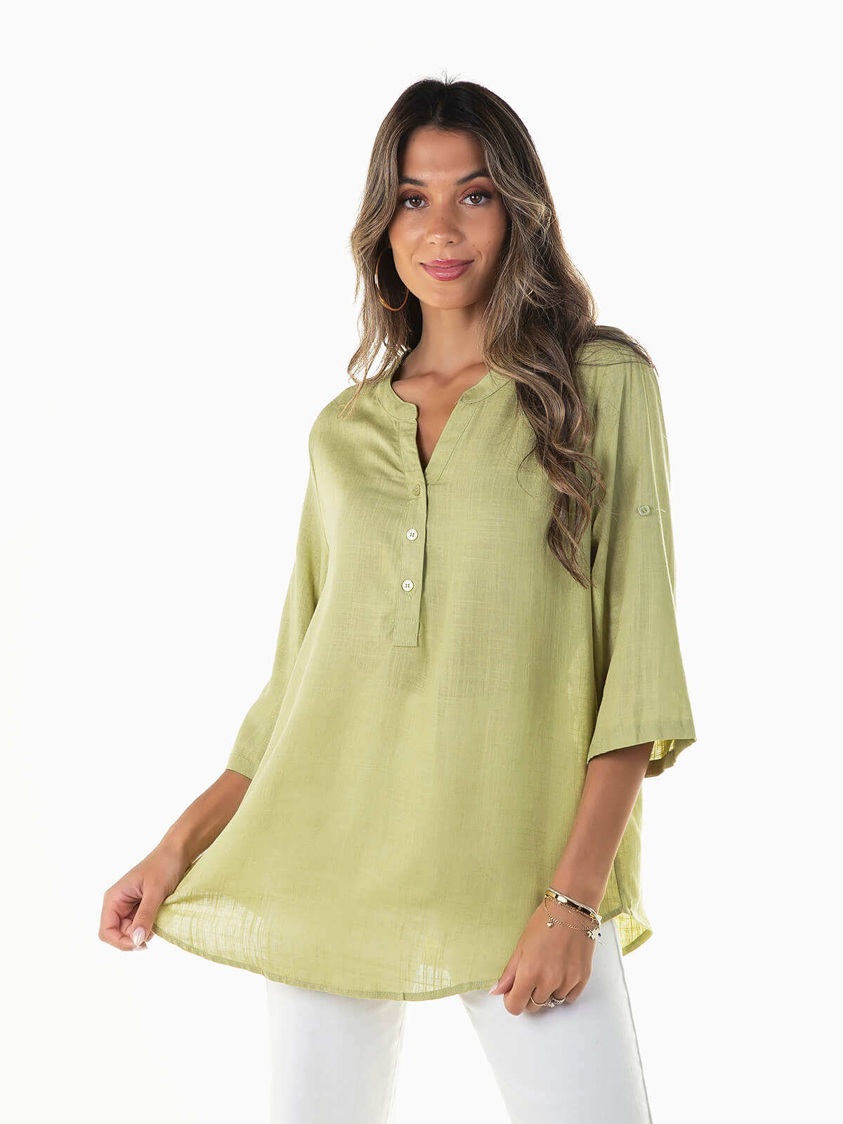 Blusa fluída com mistura de linho para senhora. Blusa manga 3/4 e presilhas para ajustar. Gola mao e abertura em V com botões.
