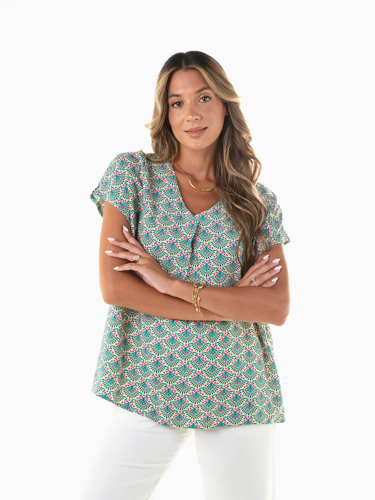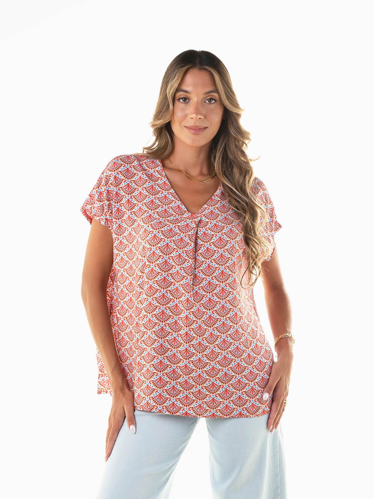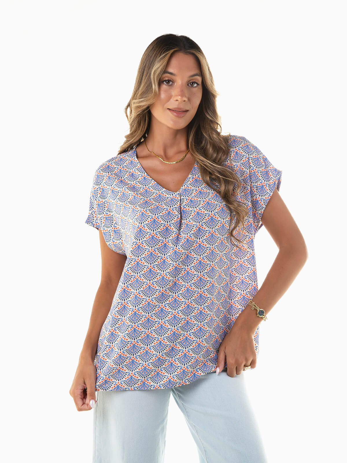 Blusa de manga curta com padrão geométrico para mulher. Modelo fluído com decote em V, perfeito para combinar com calças de alfaiataria ou calças ganga wide leg.