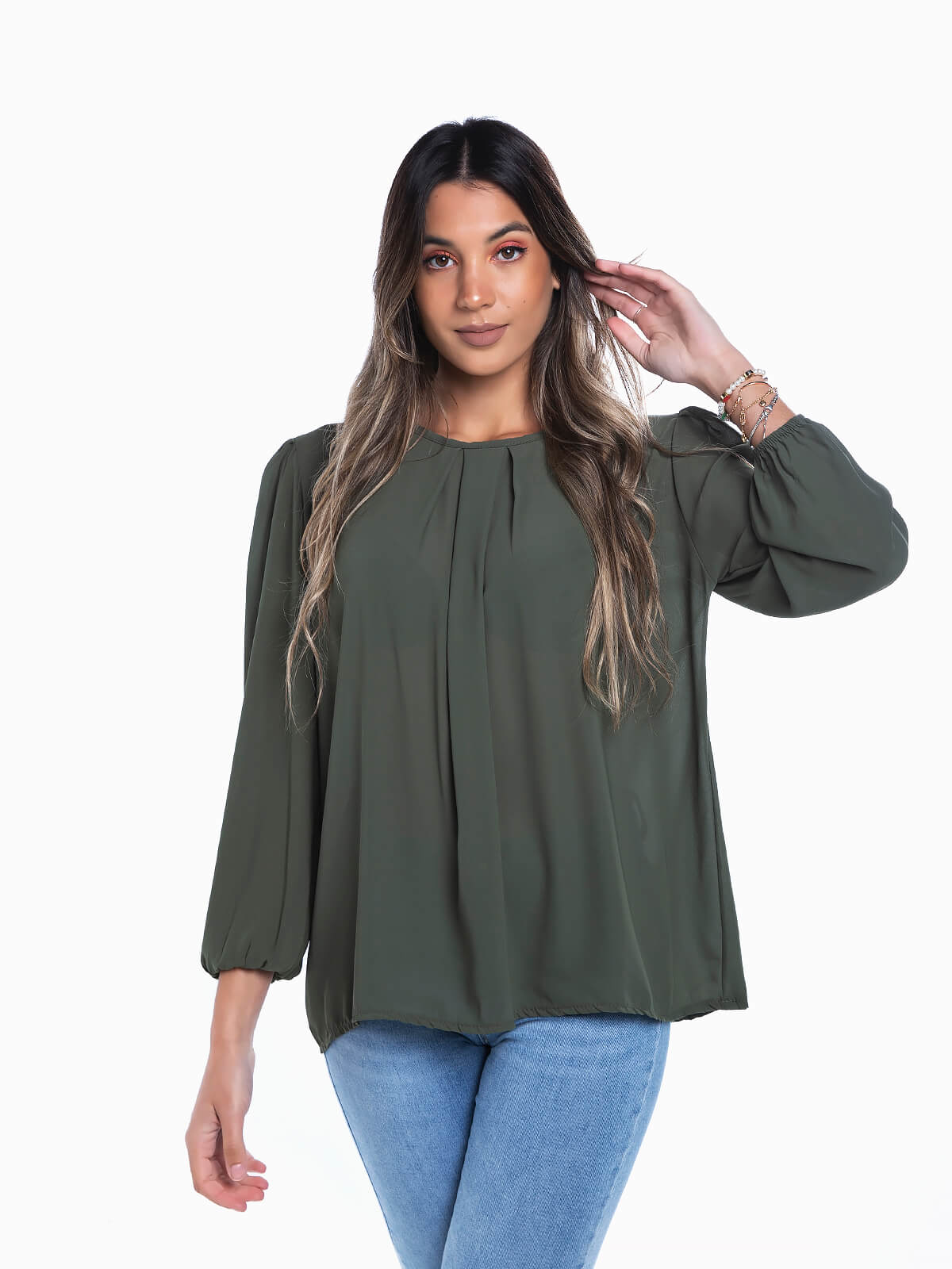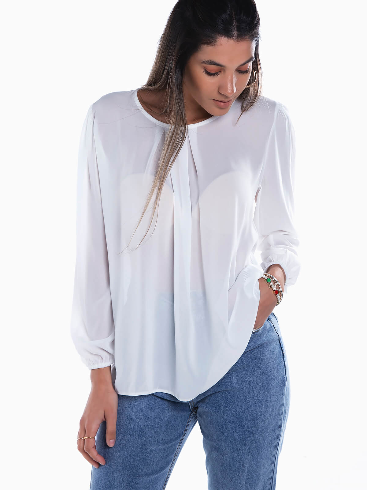 Blusa fluída com pregas no decote e ombros. Blusa de tecido leve de manga comprida. Punhos elásticos.