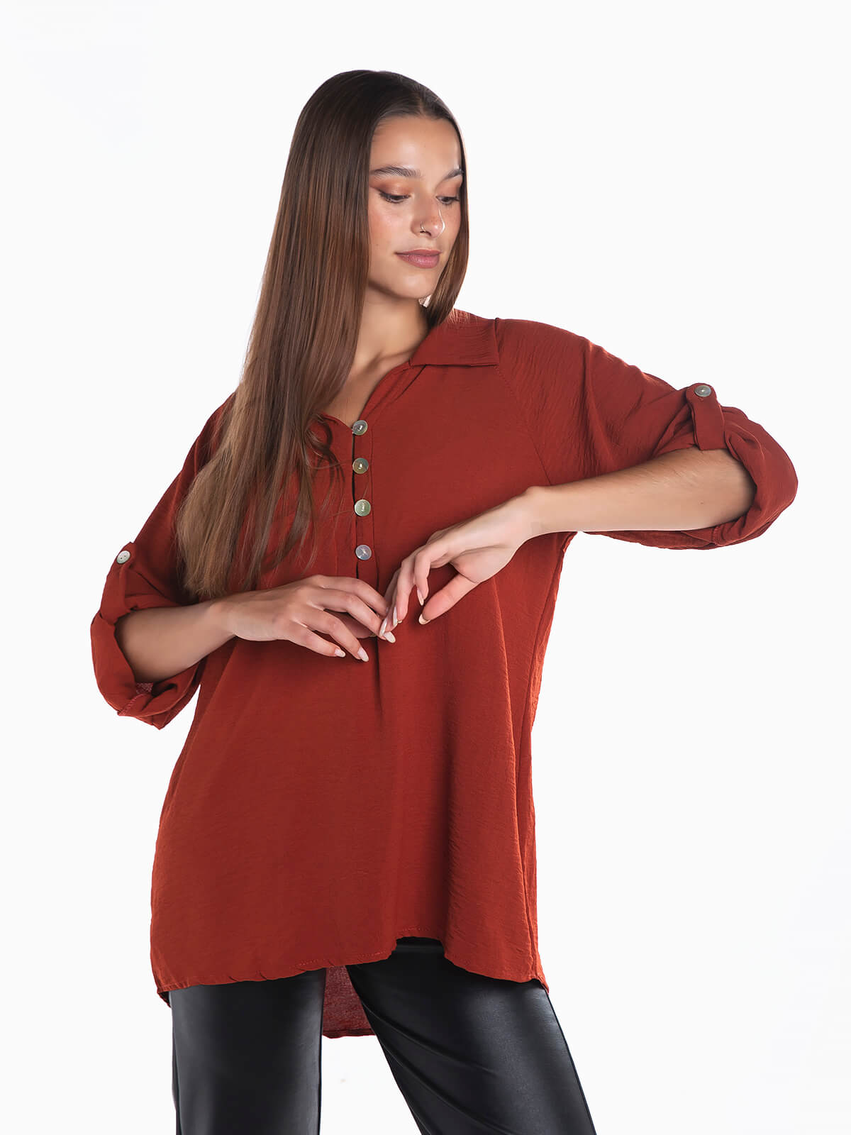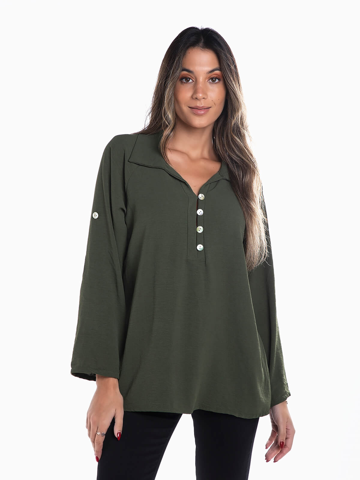 Blusa fluída com manga comprida e presilhas para ajustar. Blusa com gola de abas e aperto de botões. Tecido com textura.
