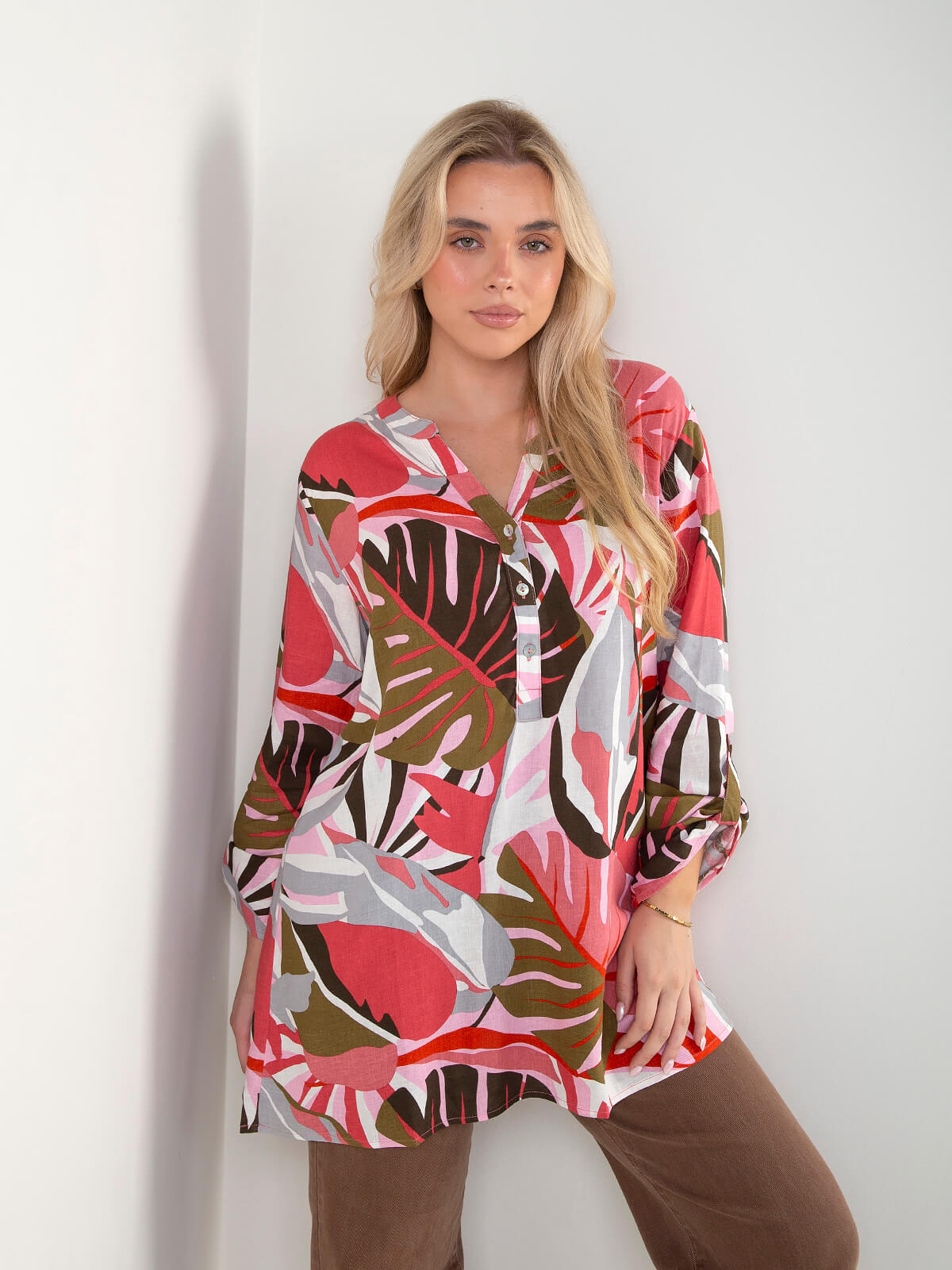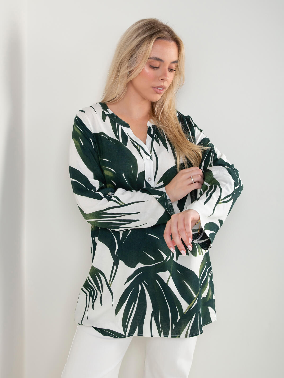 Blusa fluída com estampado tropical com decote em V, botões e manga comprida ajustável. Um modelo leve e versátil, perfeito para looks frescos e descontraídos na estação.