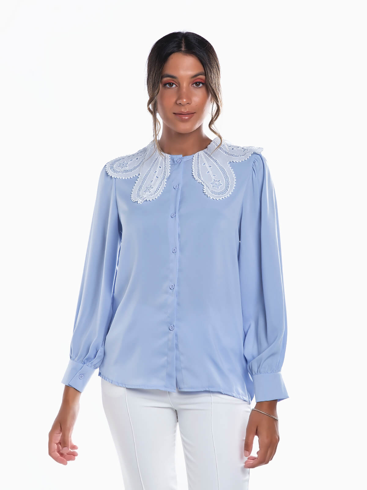 Blusa fluída com gola babydoll rendada para senhora. Blusa de manga comprida com punhos abotoados. Aperto frontal de botões.