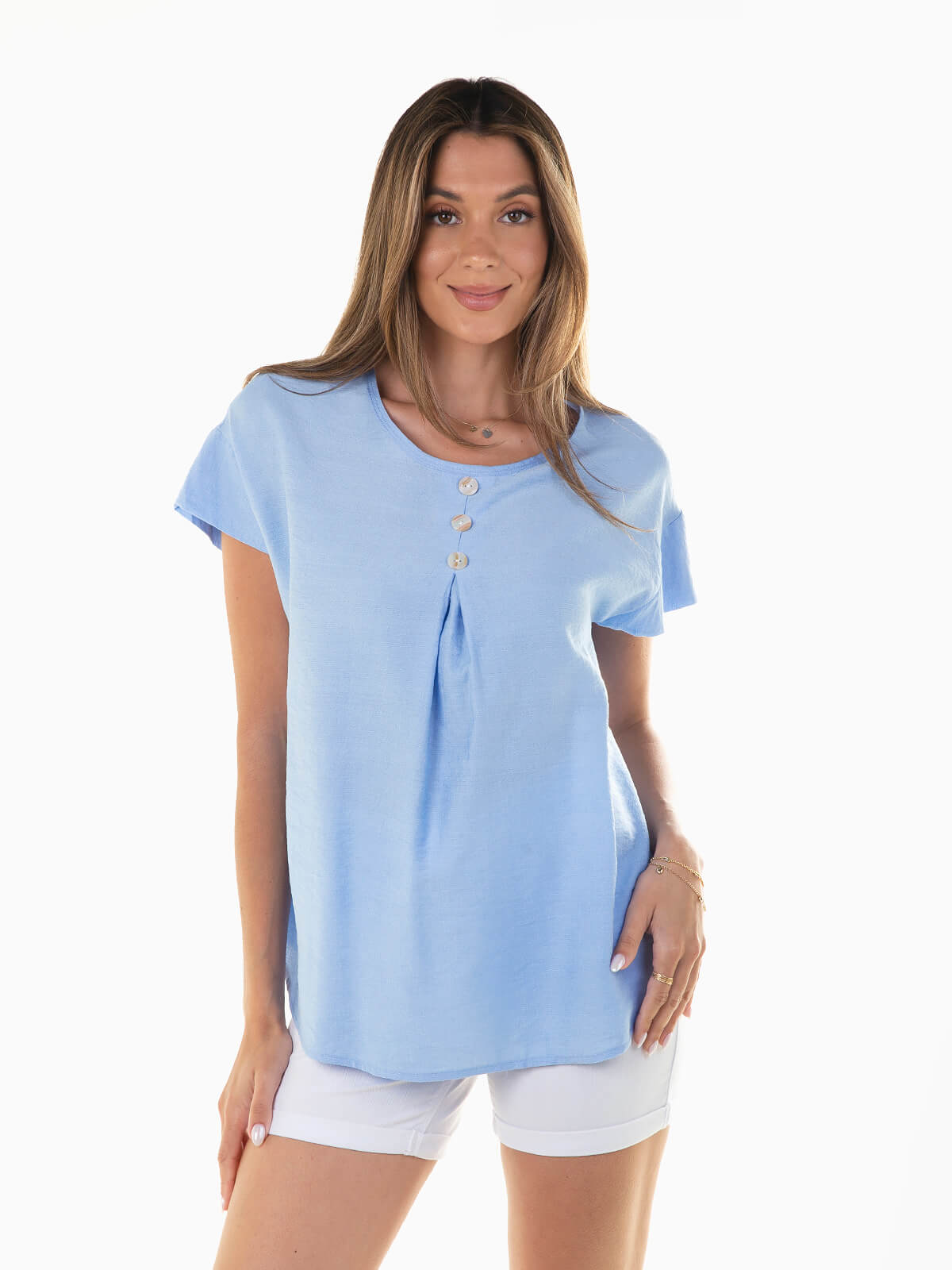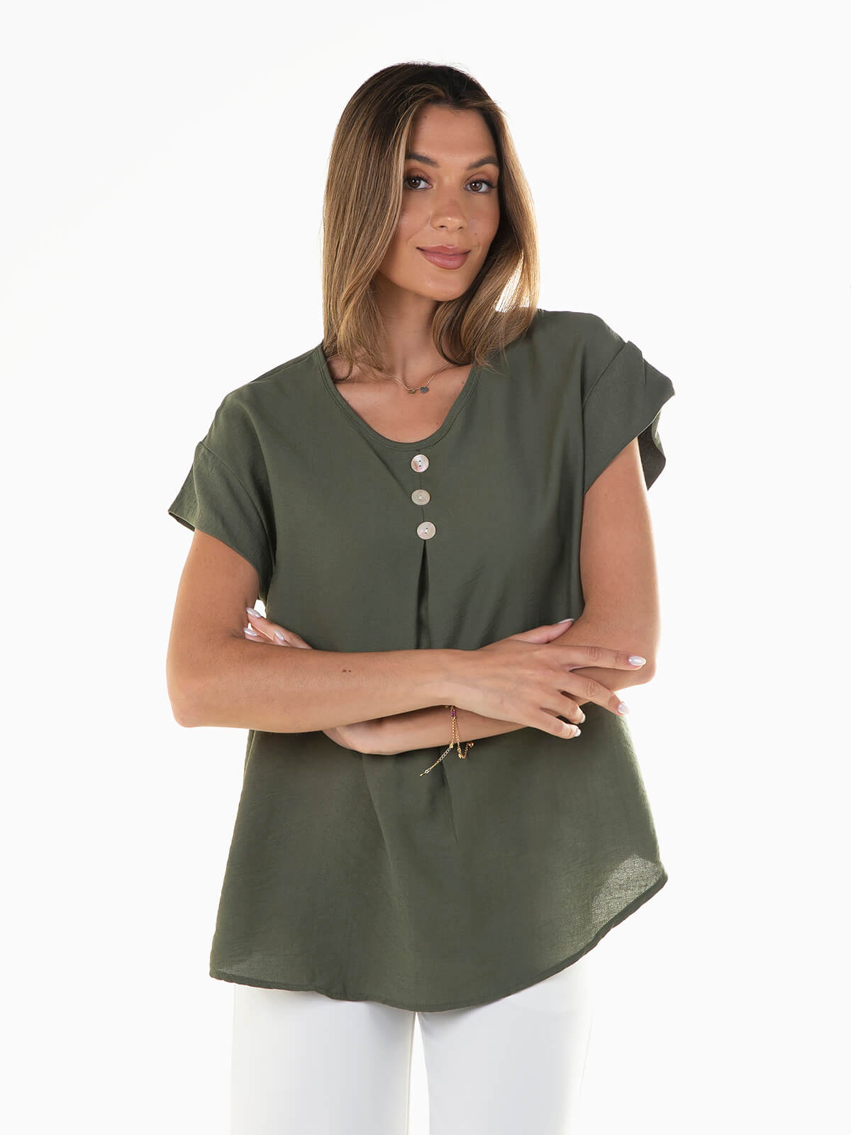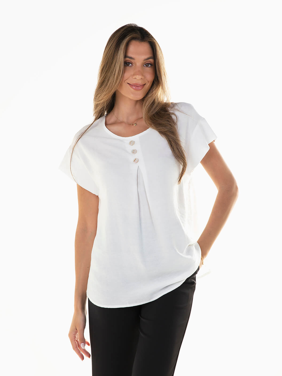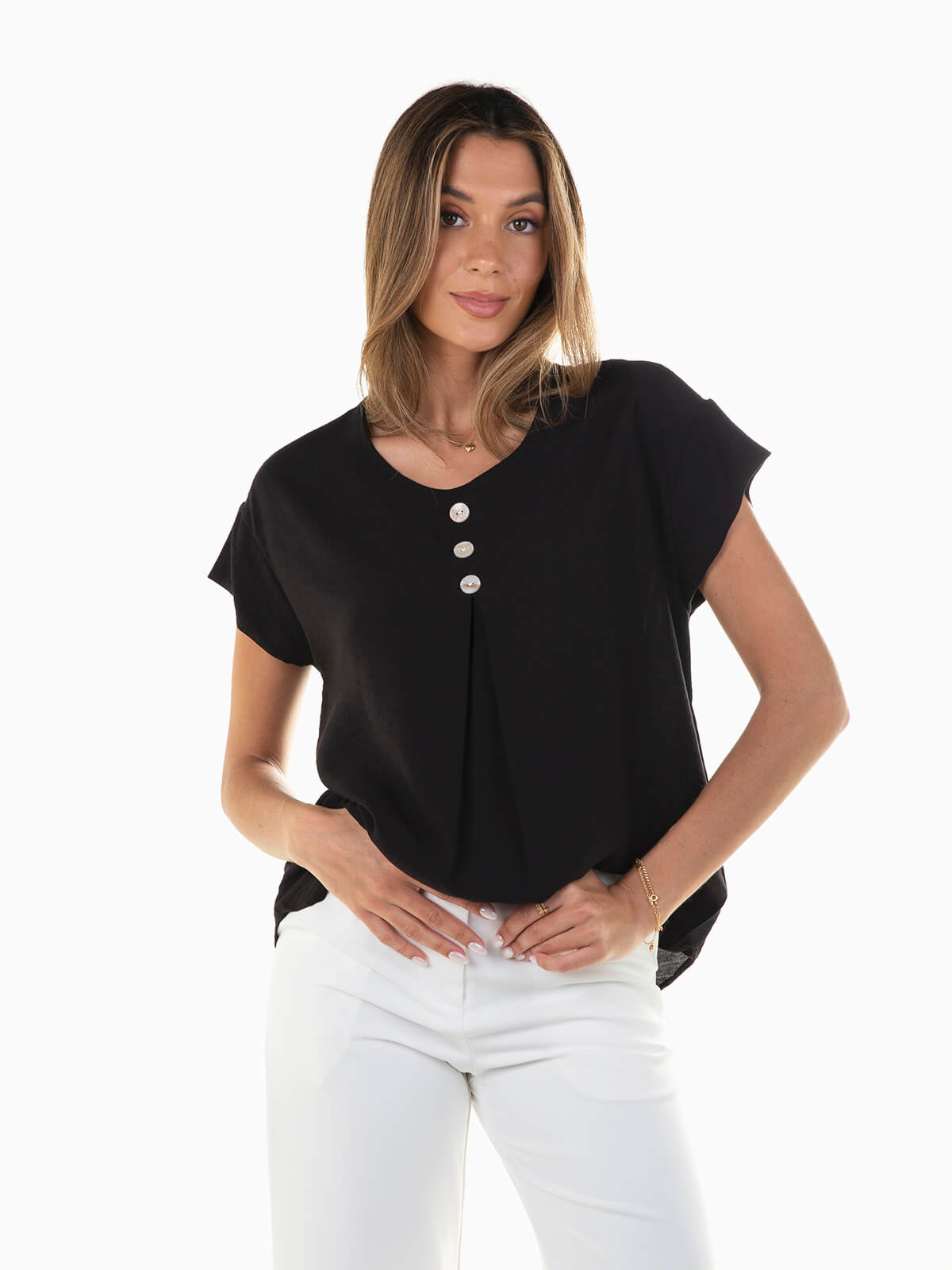 Blusa fluída de manga curta para mulher. Blusa com botões aplicados à frente e decote redondo.