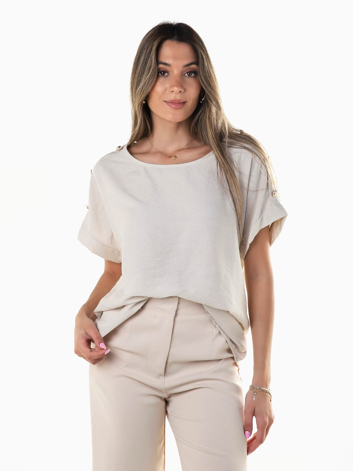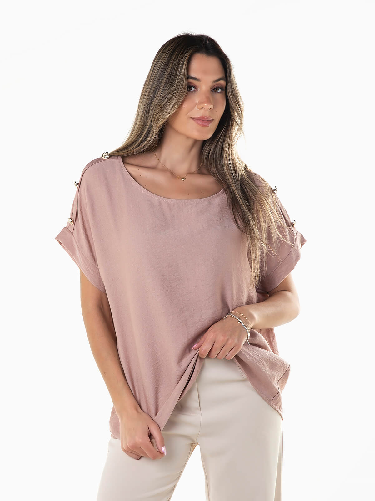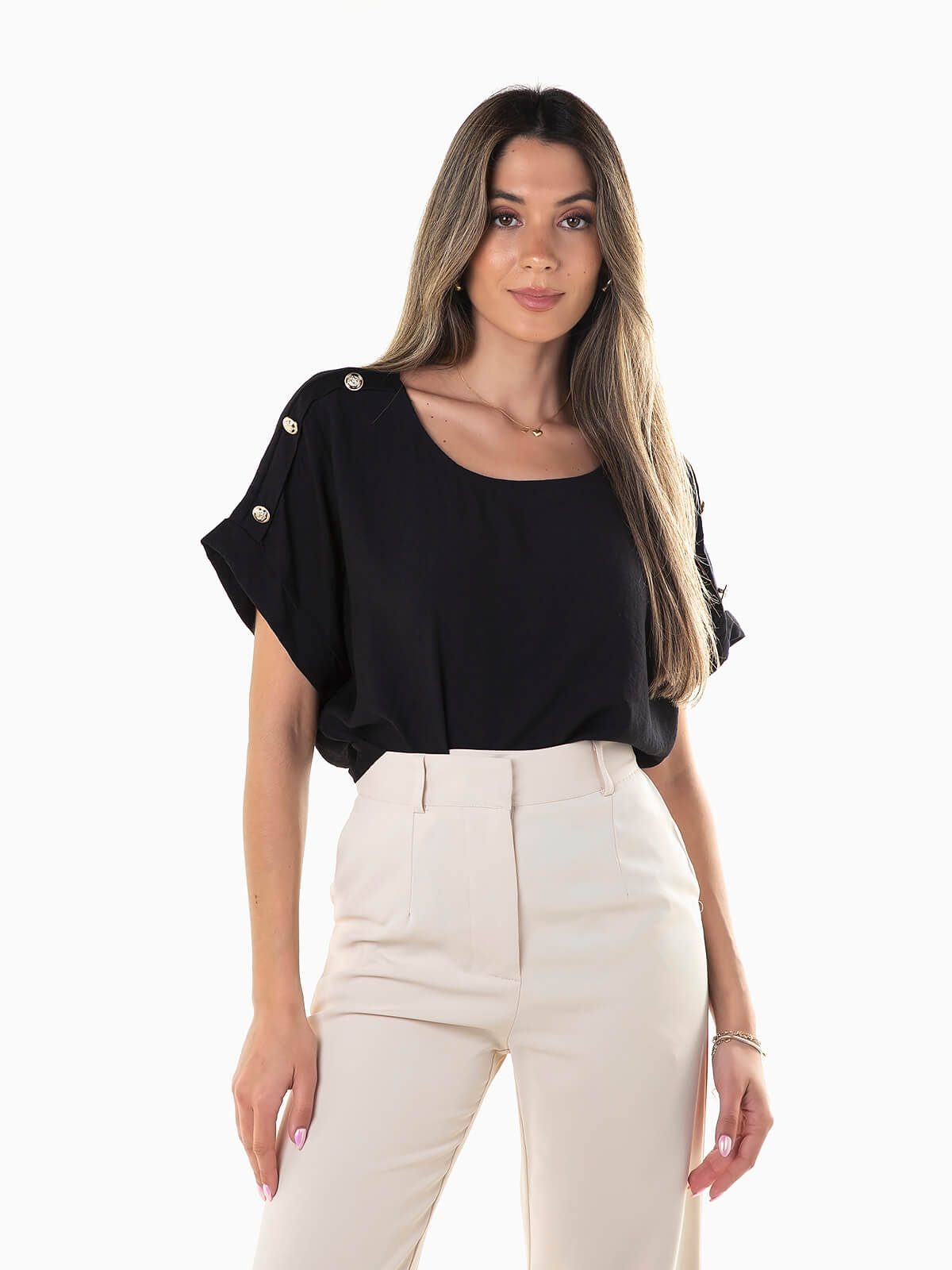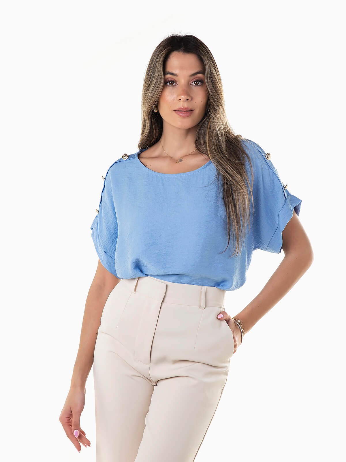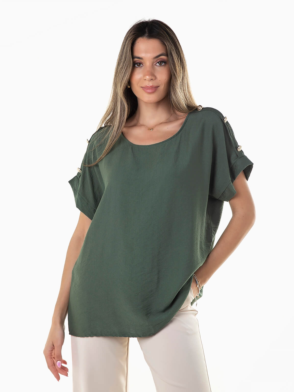 Blusa fluída de manga curta para senhora. Blusa com decote redondo e pormenor de botões aplicados nos ombros.