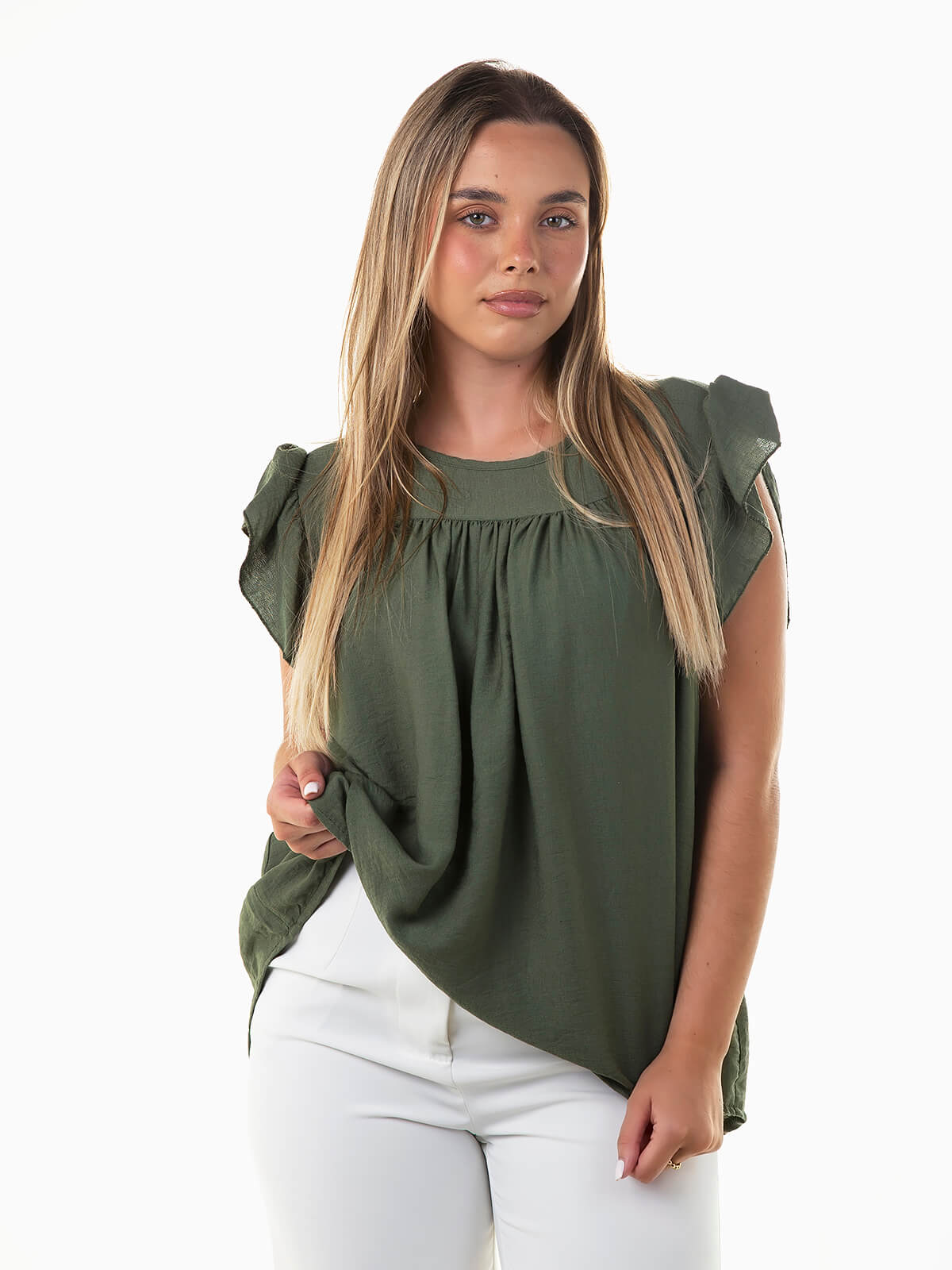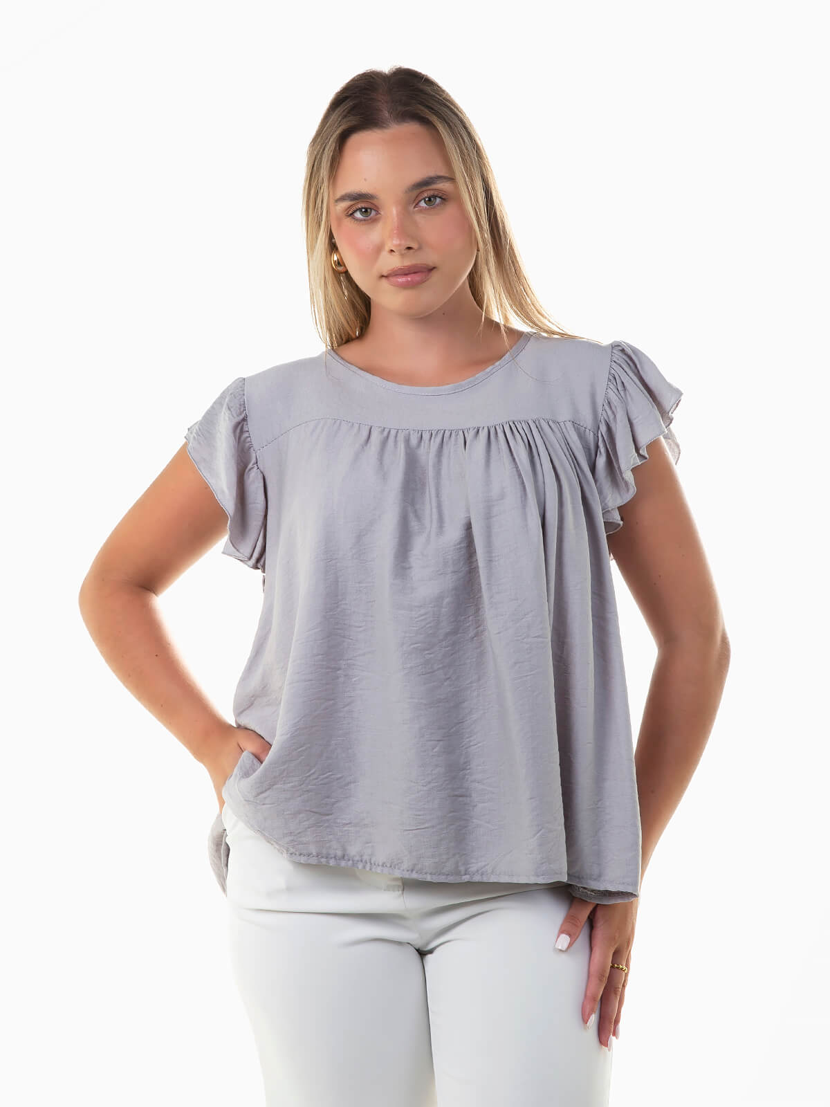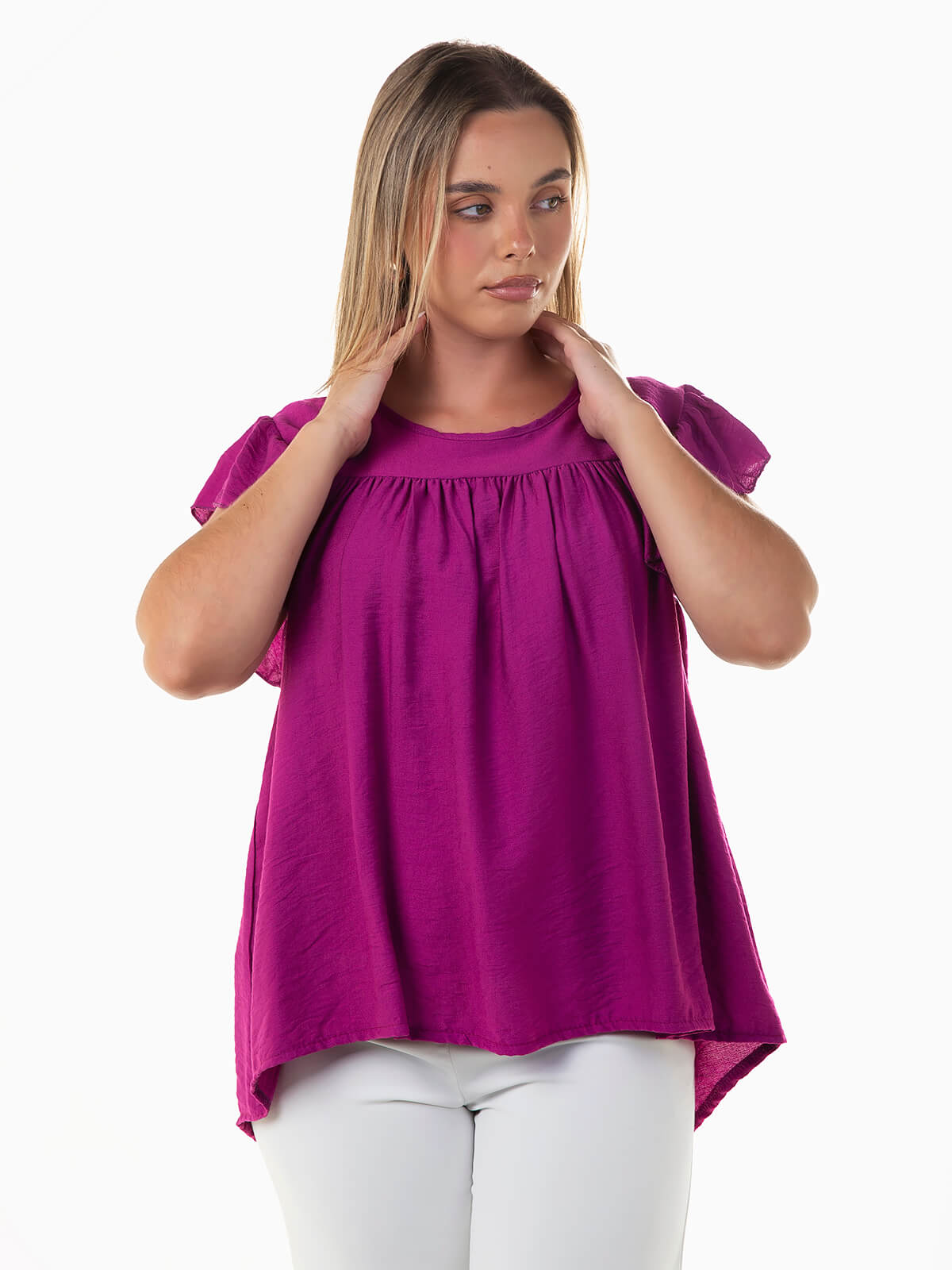 Blusa fluída com manga folho para senhora. Blusa com corte evasé e decote redondo.