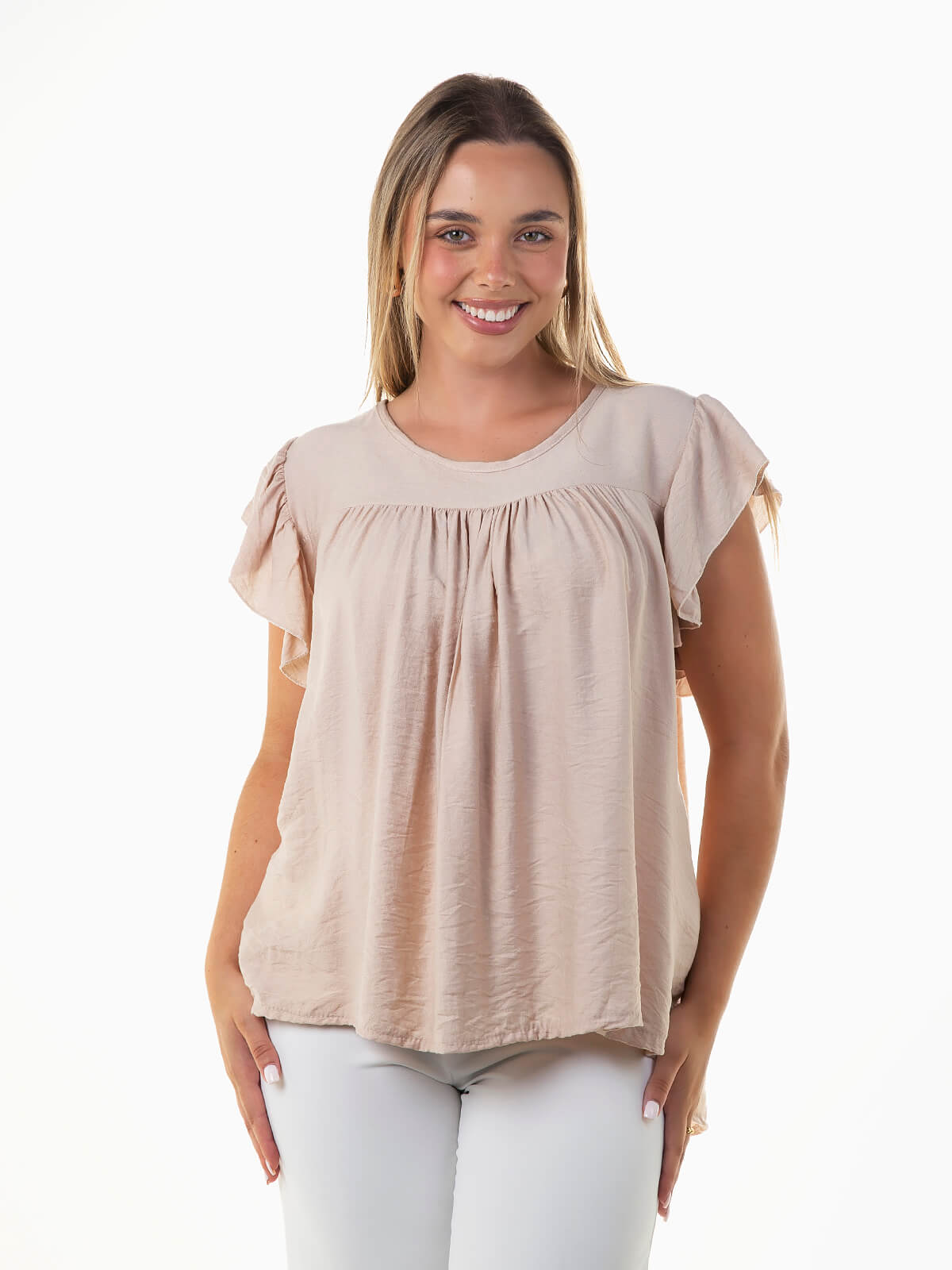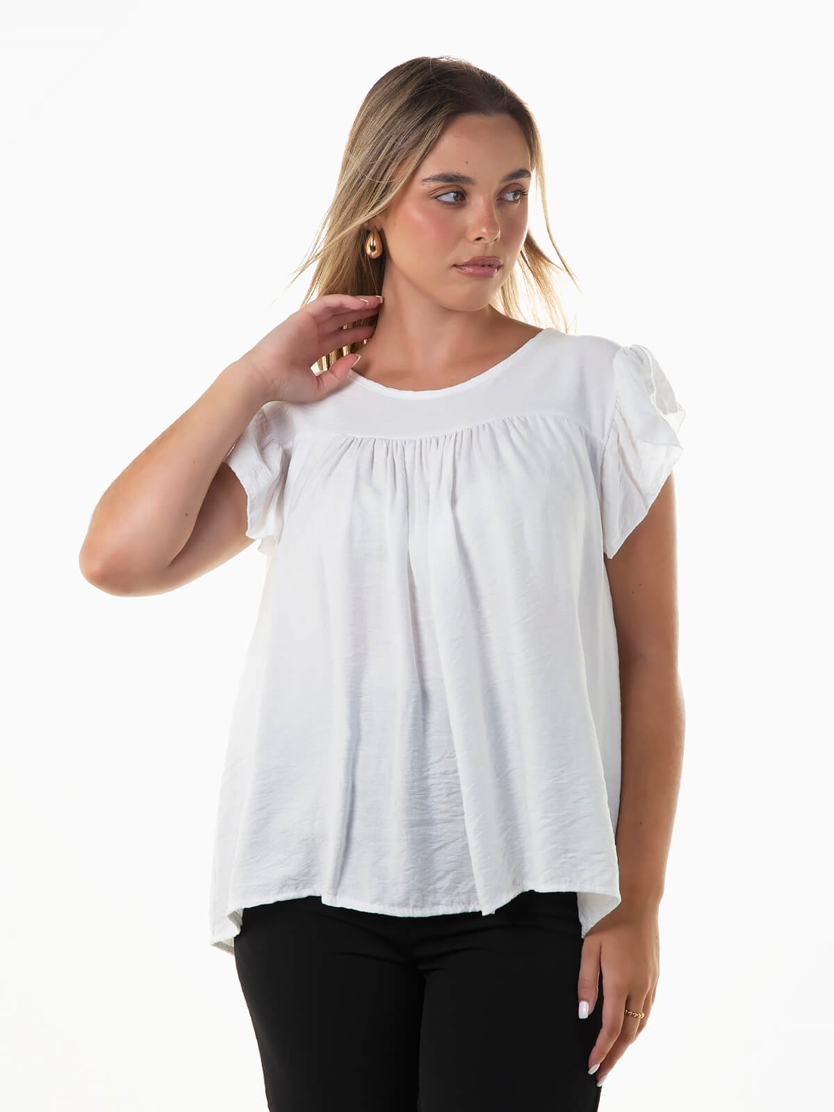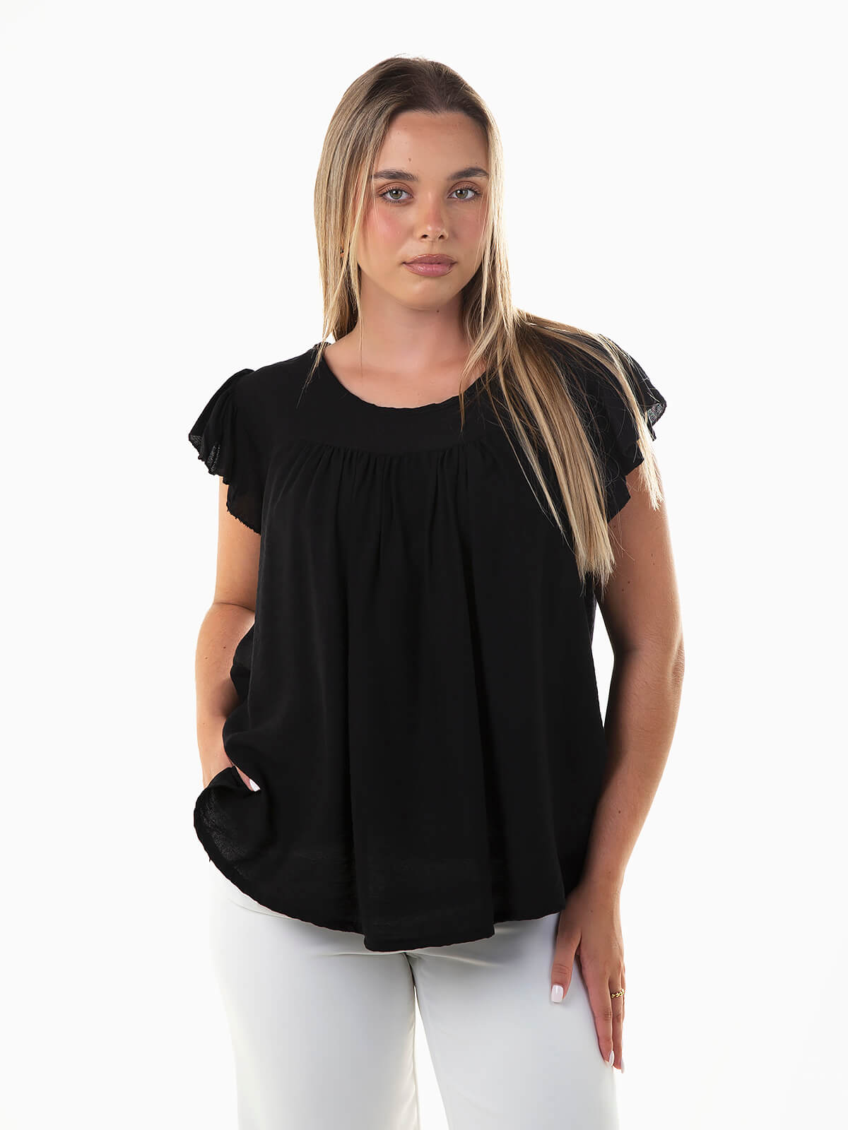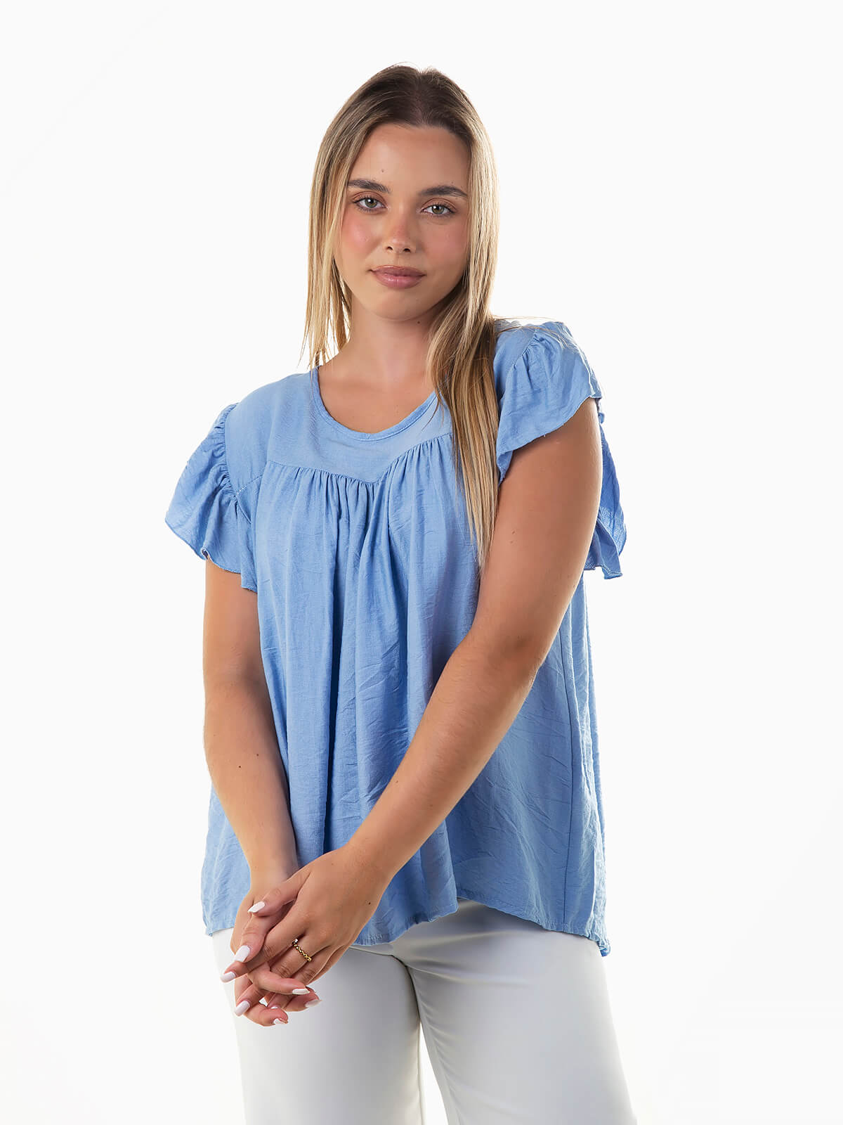 Blusa fluída com manga folho para senhora. Blusa com corte evasé e decote redondo.