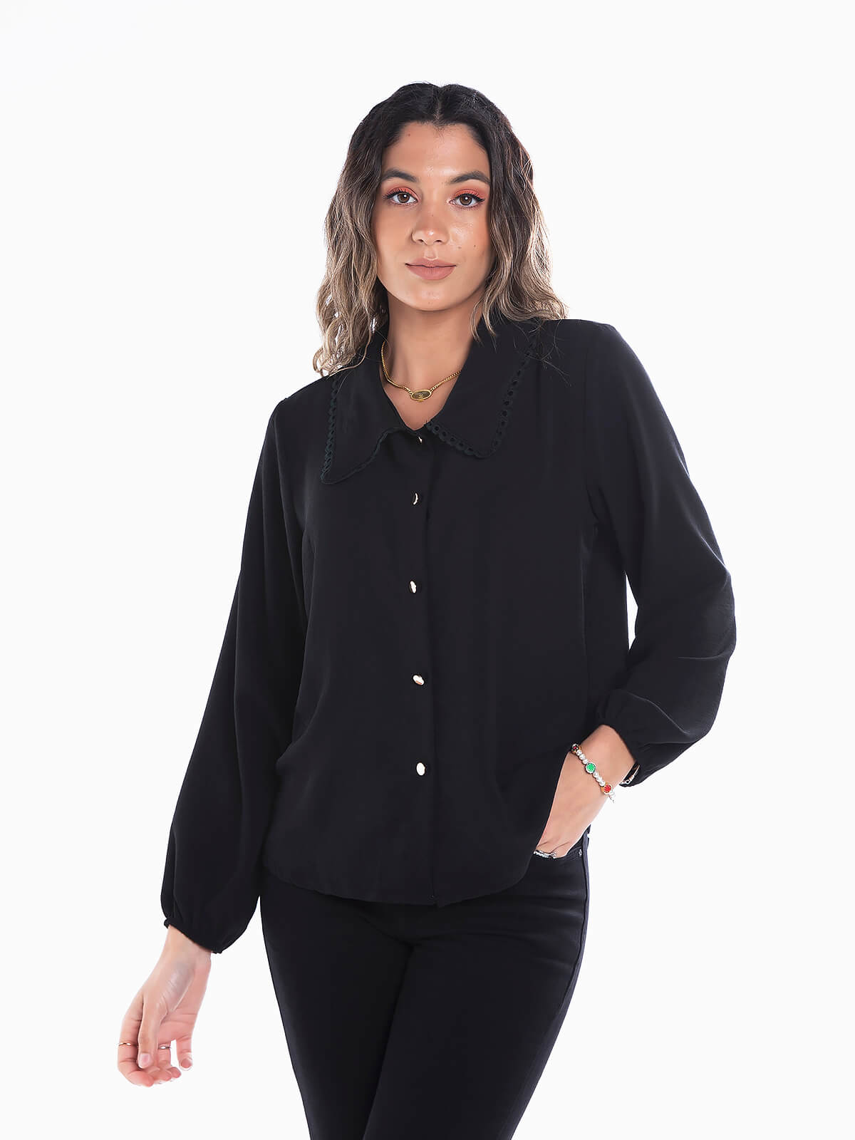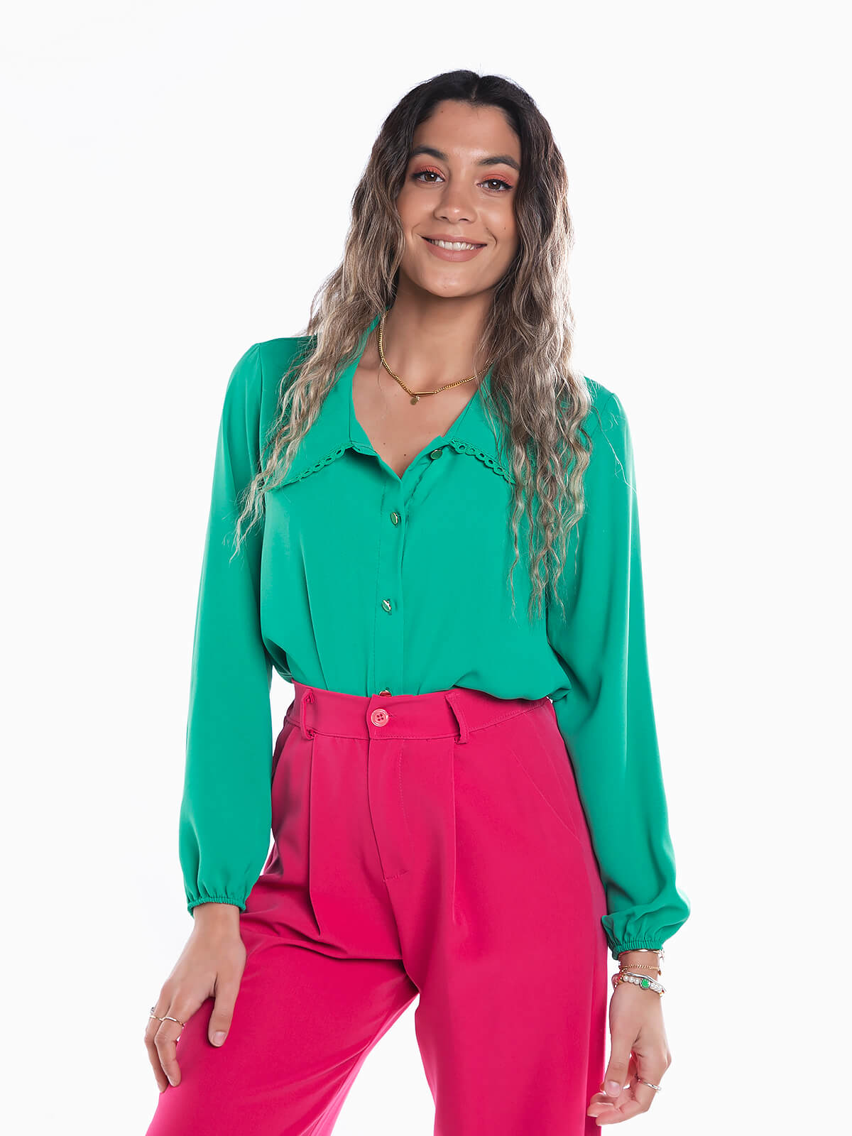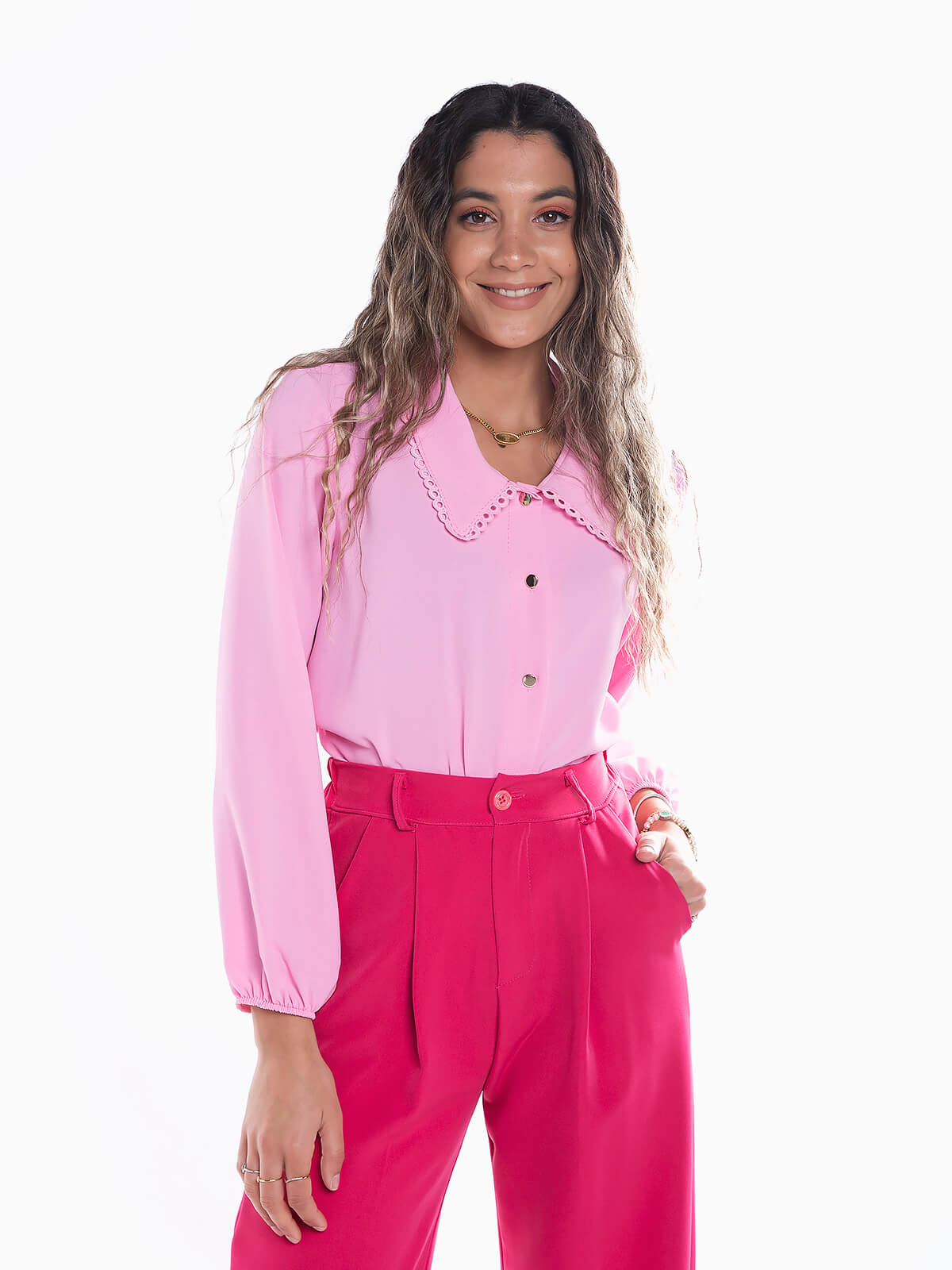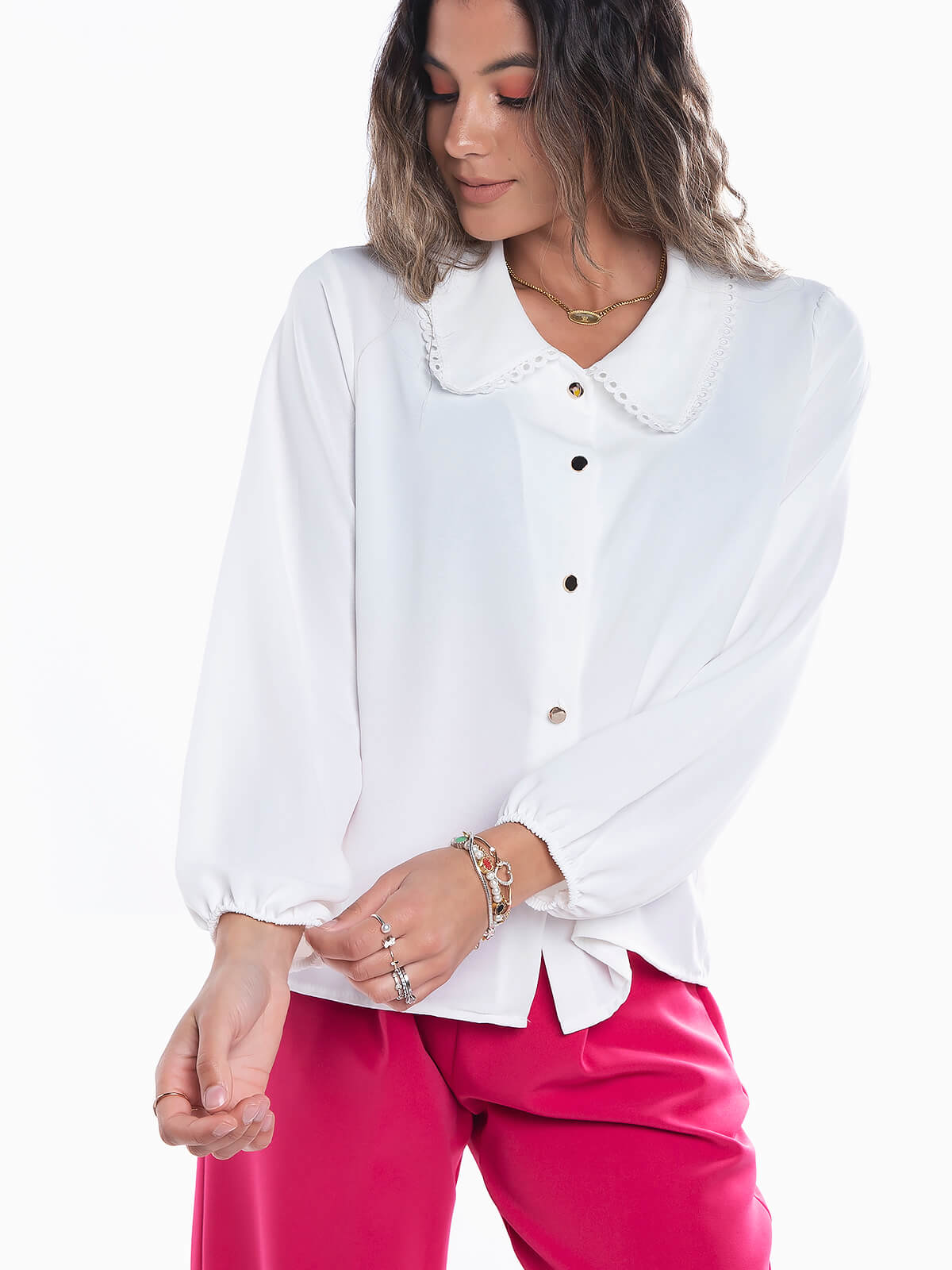 Blusa com gola babydoll para senhora. Blusa em tecido leve fluido de manga comprida. Punhos elásticos. Aperto de botões em contraste.