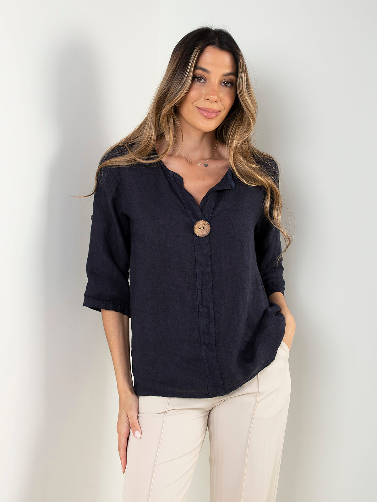 Blusa em 100% linho, leve e respirável, com corte solto e detalhe de botão frontal. Modelo versátil, ideal para looks frescos e elegantes nos dias mais quentes.