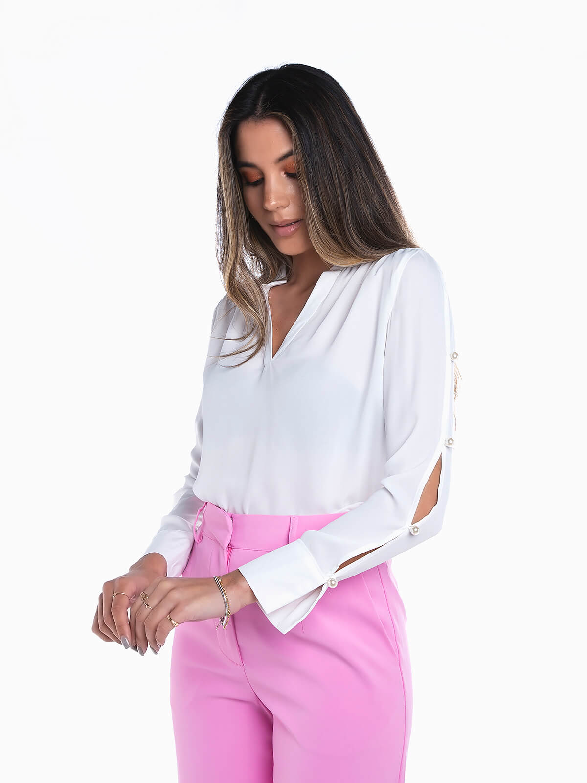 Blusa de manga comprida com botões de pérolas e pormenores abertos. Blusa em tecido fluído com transparência e decote em bico.