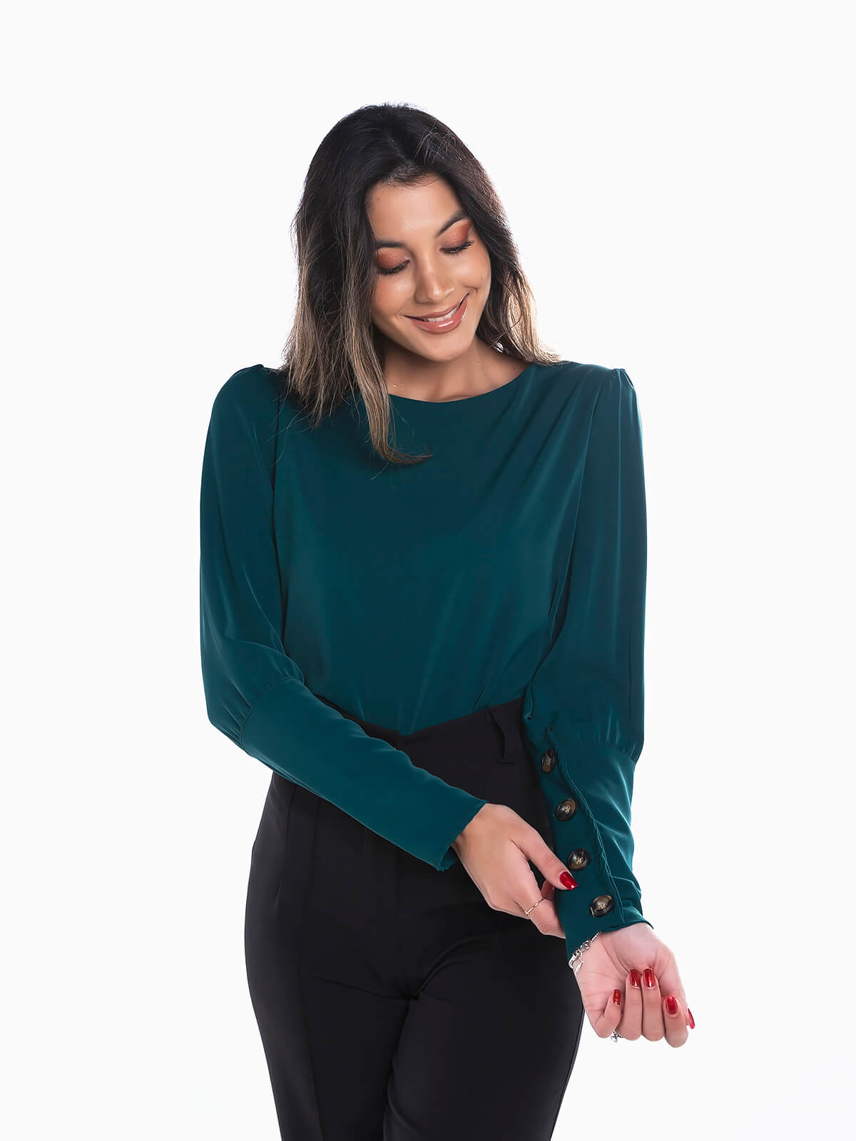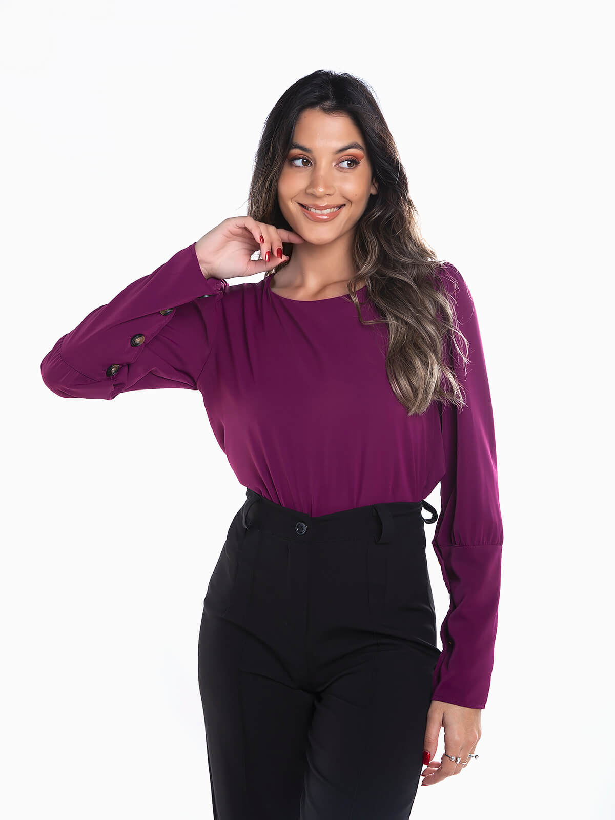 Blusa de manga comprida com botões aplicados nos punhos e na parte posterior. Blusa com decote redondo.