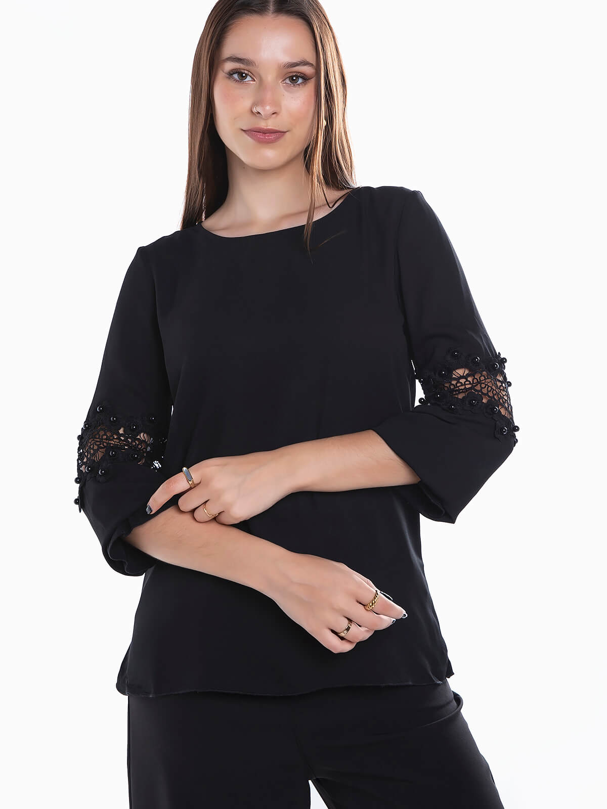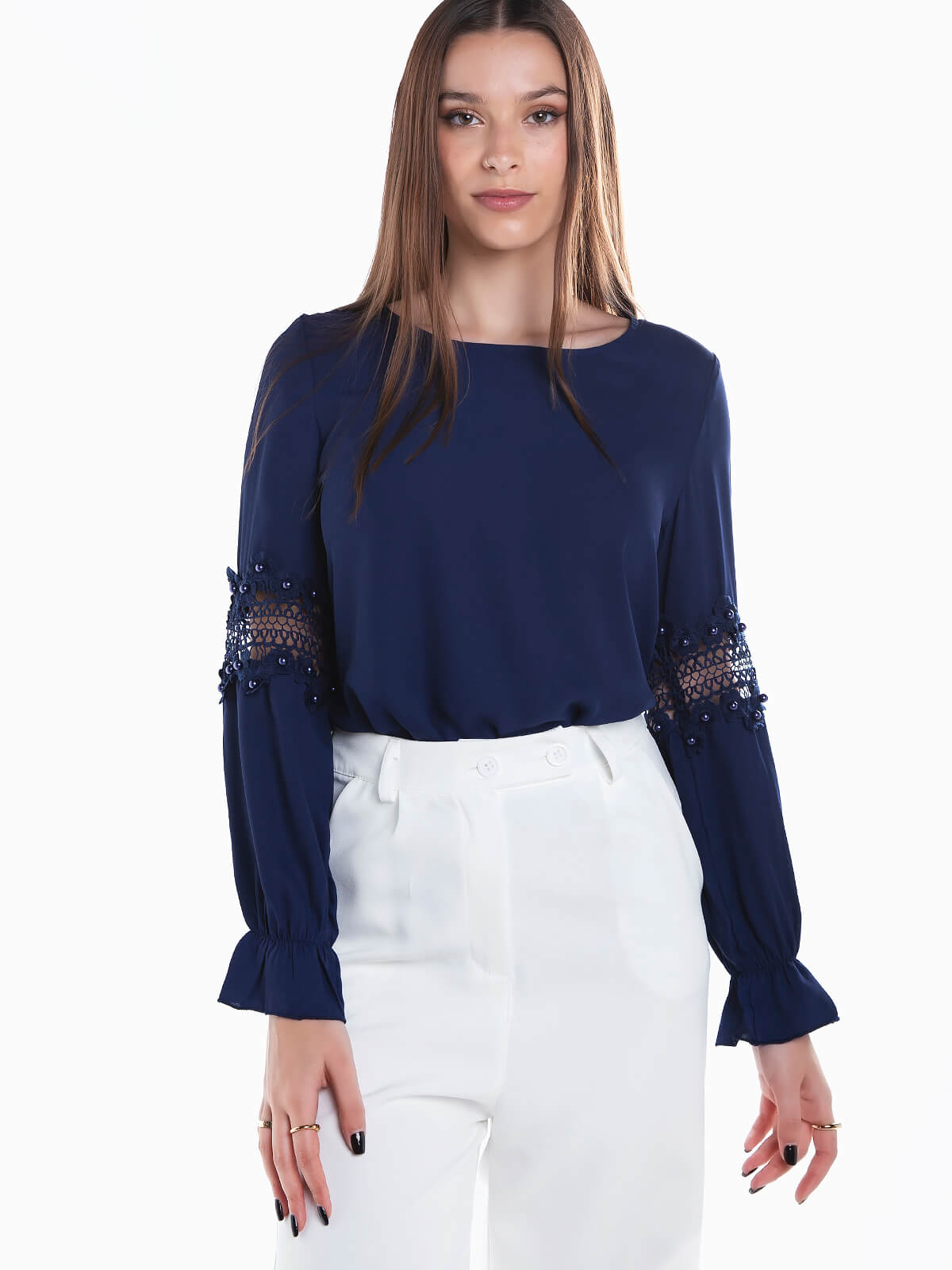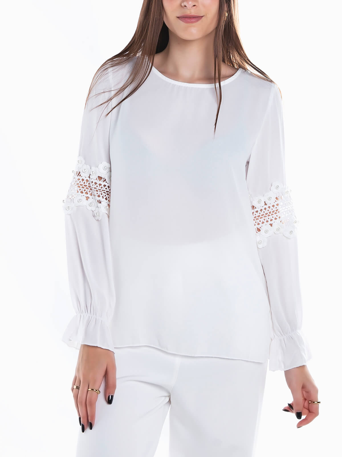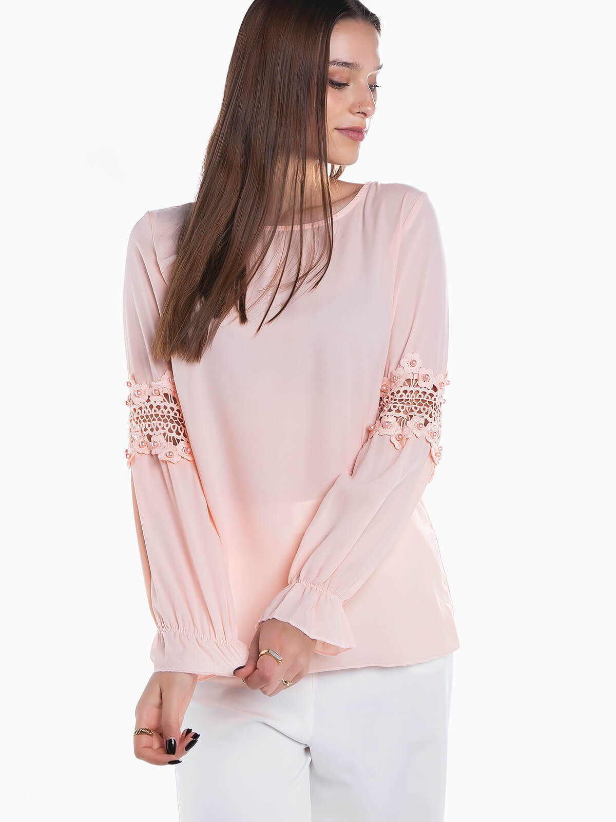 Blusa de manga comprida com crochet aplicado e pérolas. Blusa fluída com decote redondo. Aperto posterior de botão. Punhos com elástico.