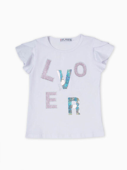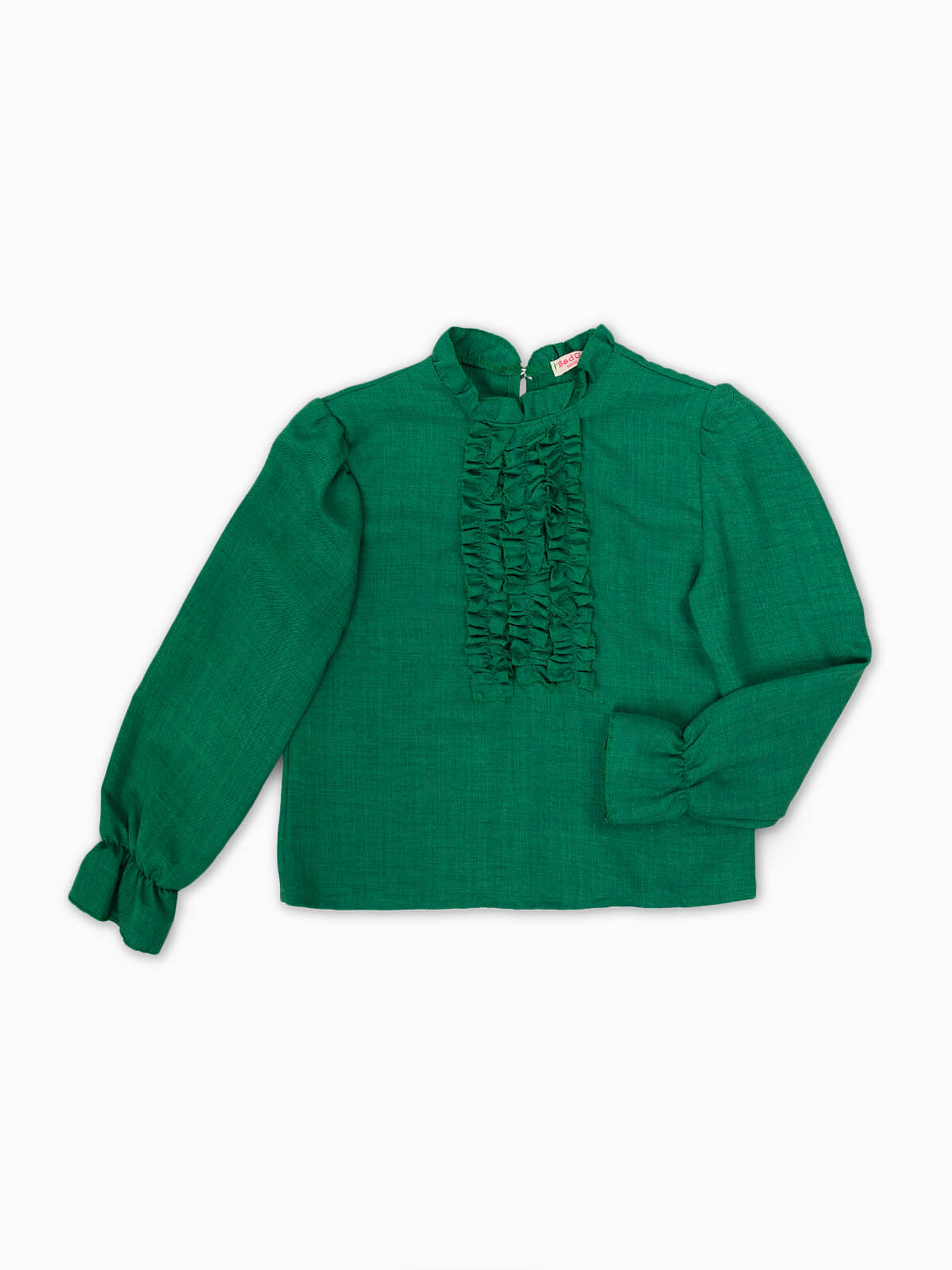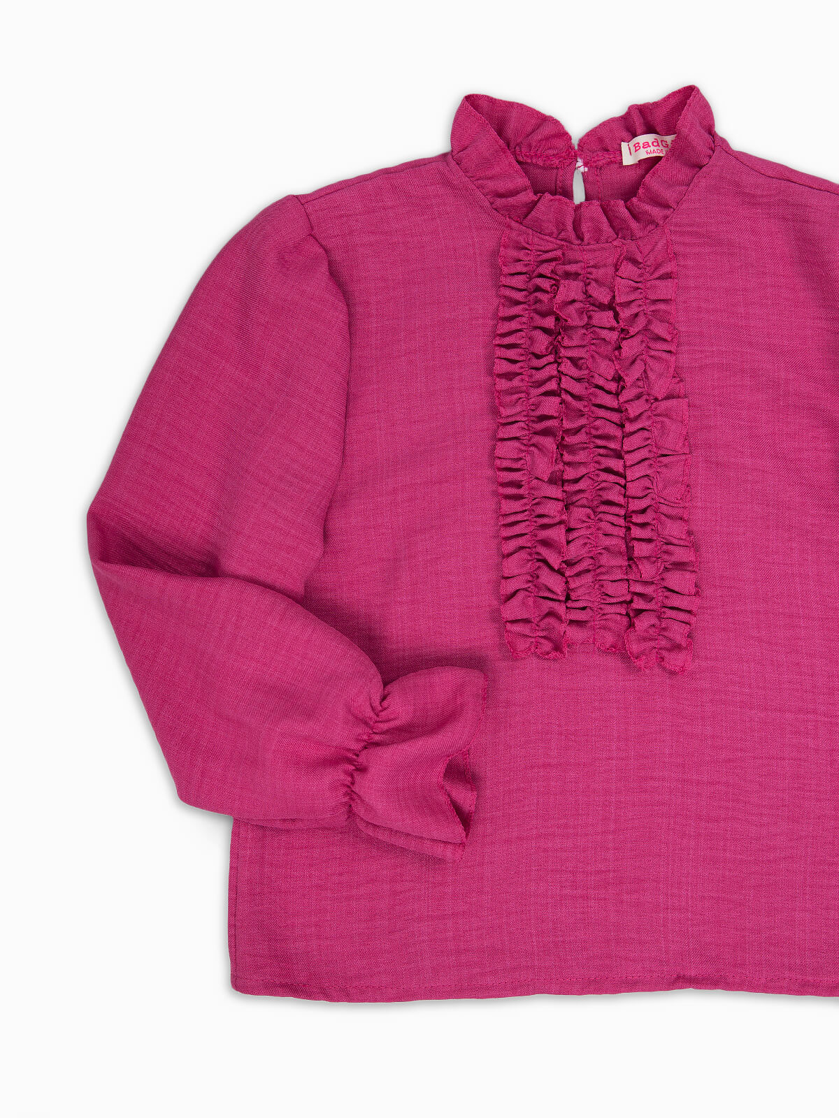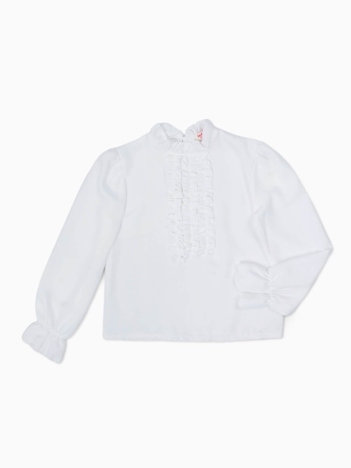 Blusa de manga comprida com folhos aplicados. Blusa para menina com gola subida acabada em folho com elástico nos punhos. Aperto posterior de botão.