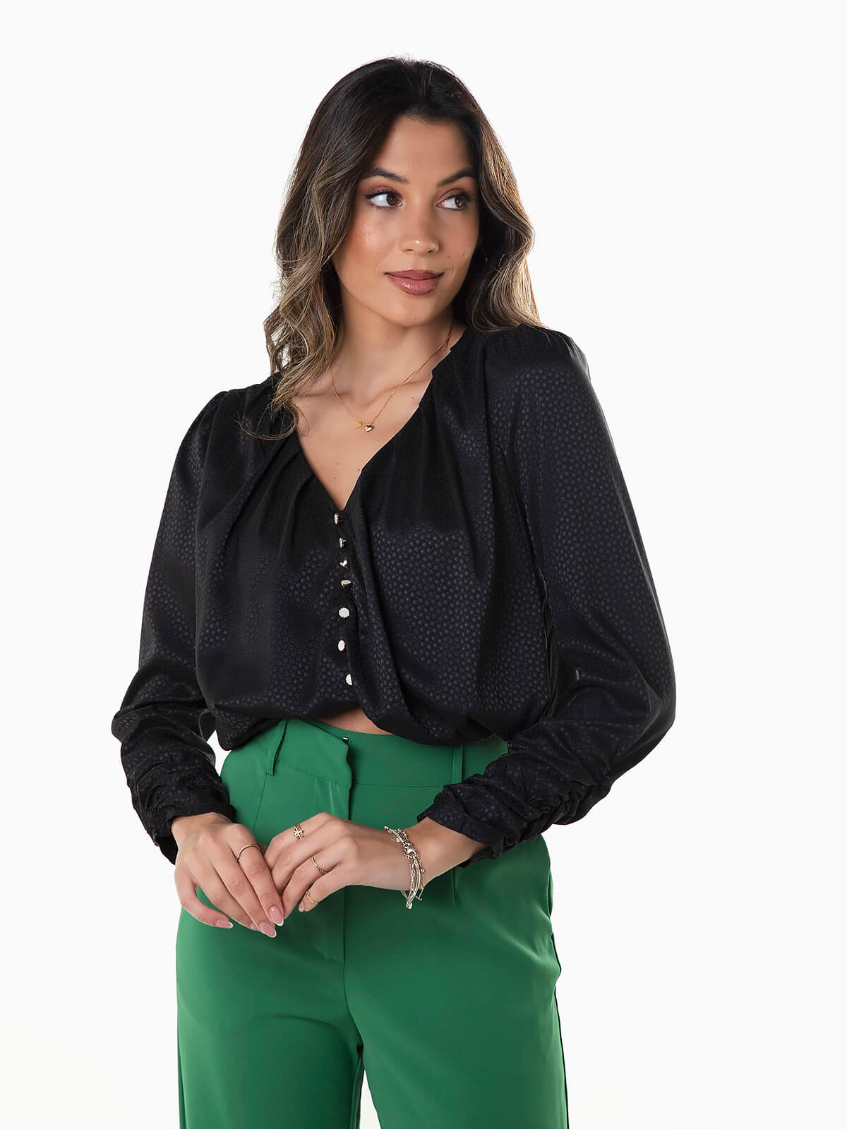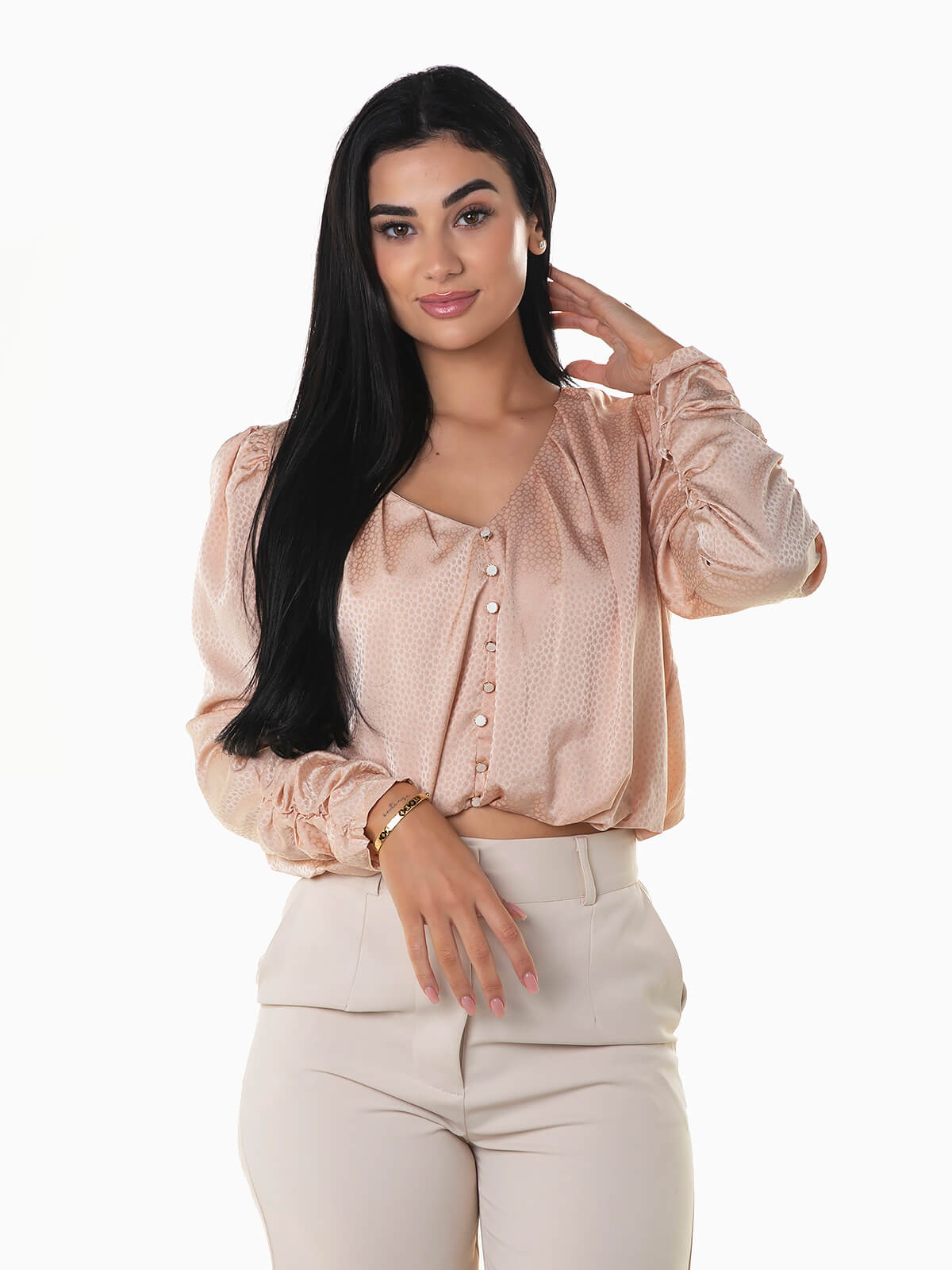 Blusa de manga comprida com punhos franzidos. Blusa com interior forrado e decote em bico. Botões decorativos. Tecido brilhante com bolinhas à cor.