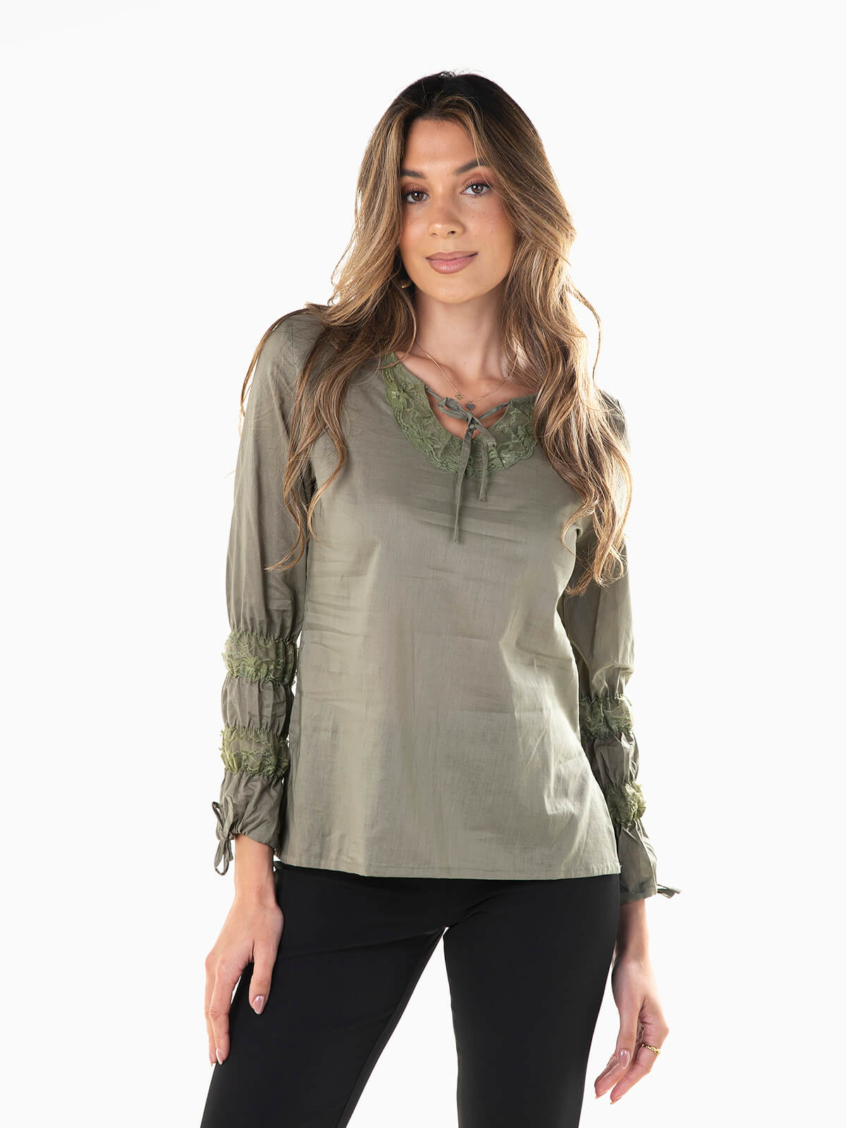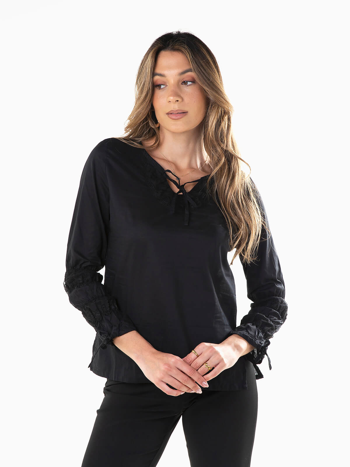 Blusa de manga comprida combinada com pormenores em renda. Blusa com decote redondo e atilhos para ajustar. Aberturas laterais na base.
