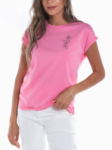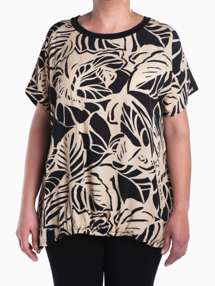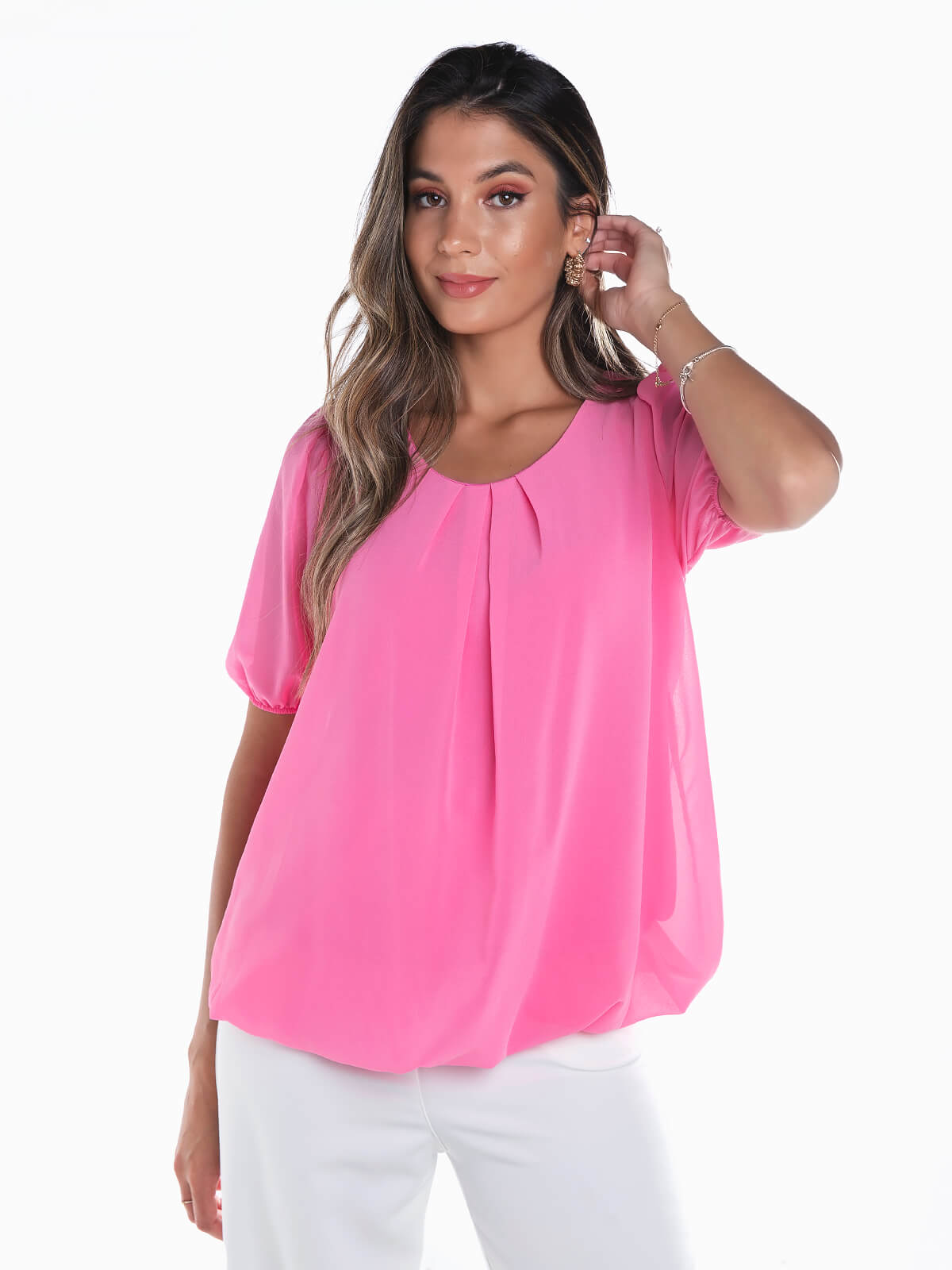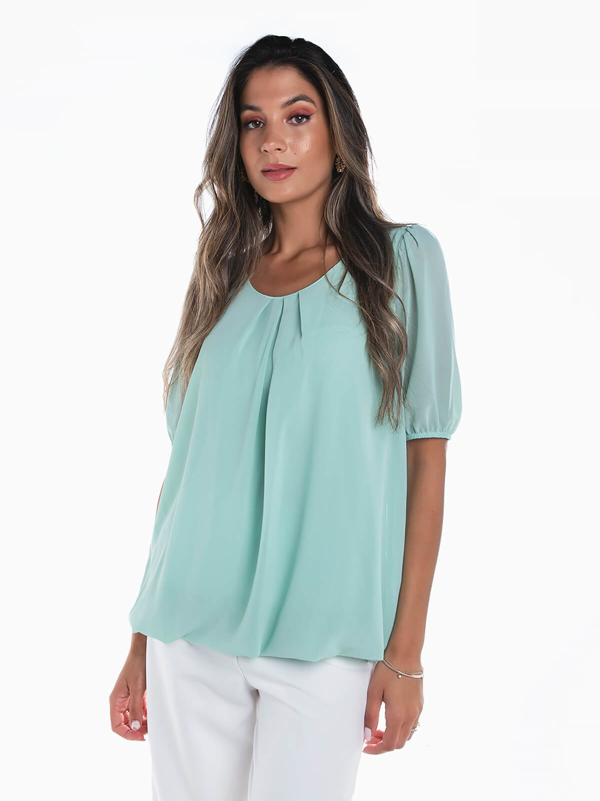 Blusa de manga curta abalonada para senhora. Blusa com interior forrado e acabamentos elásticos. Decote redondo.