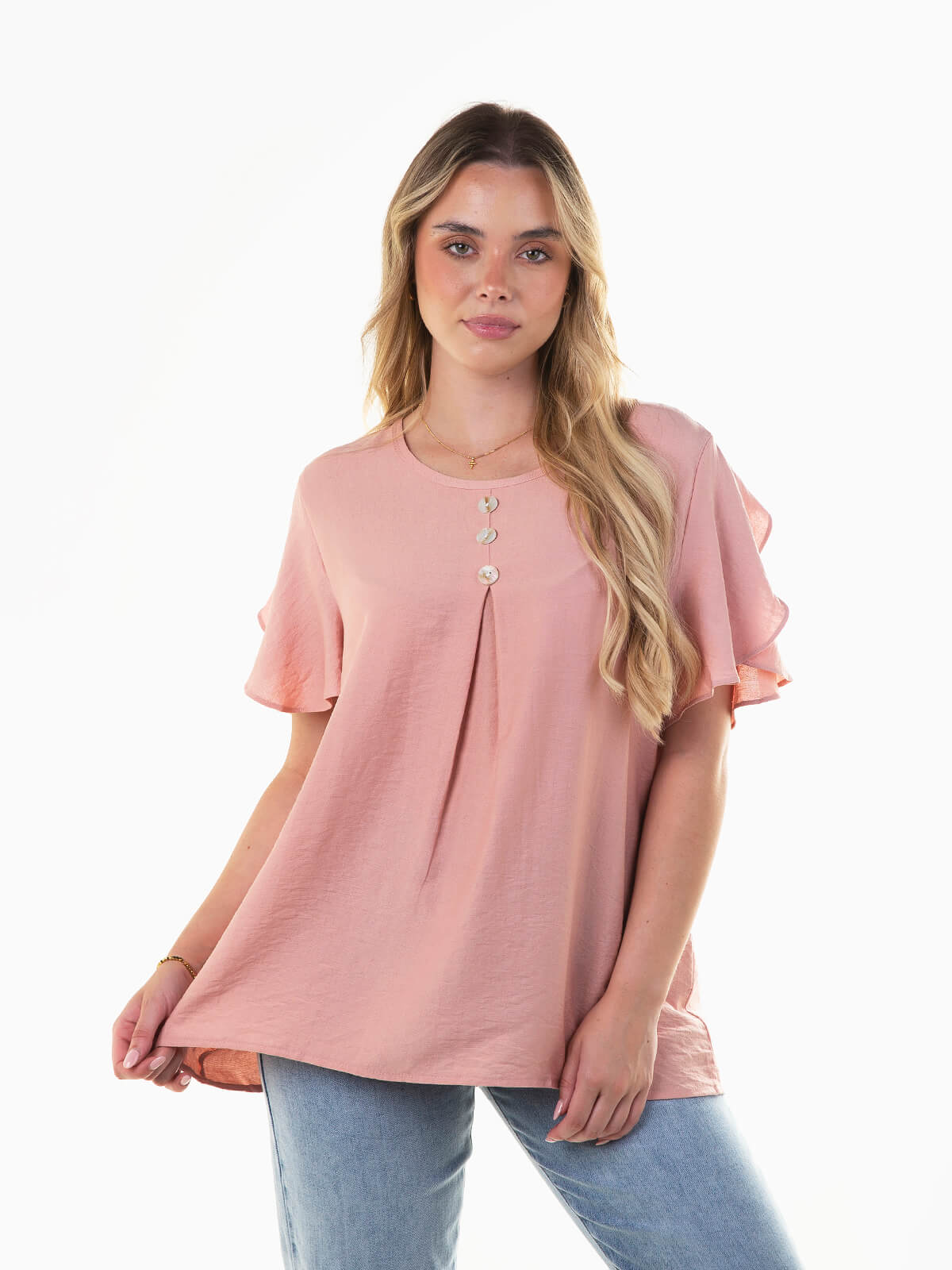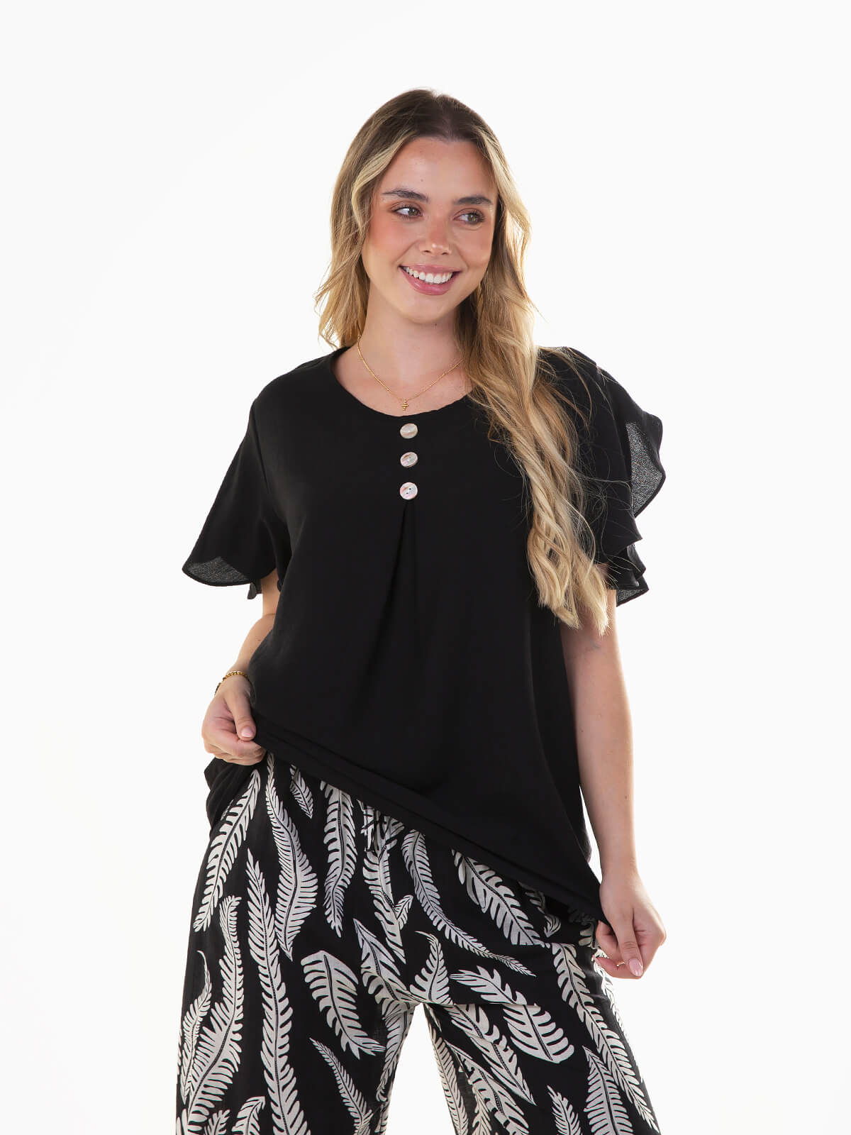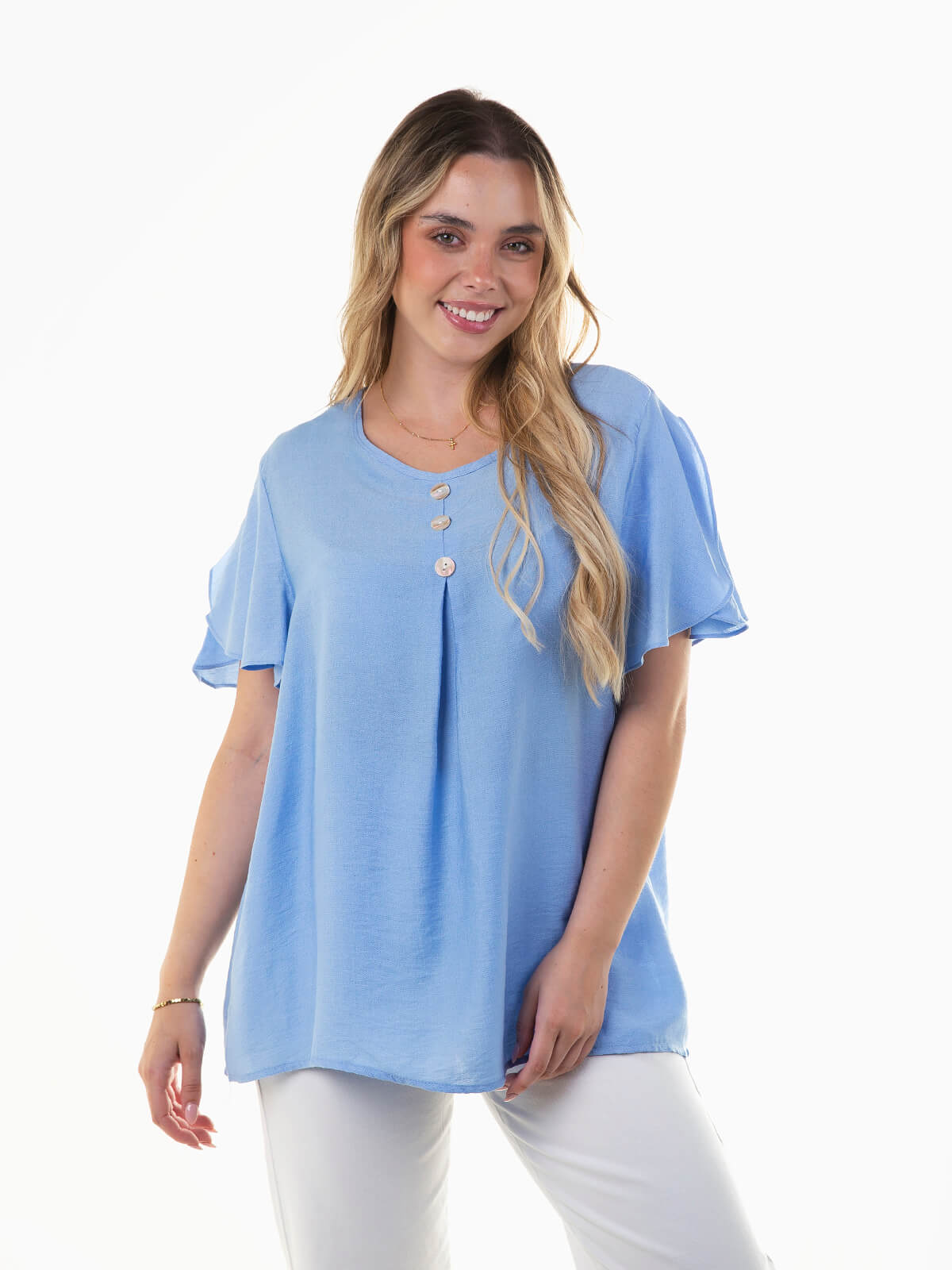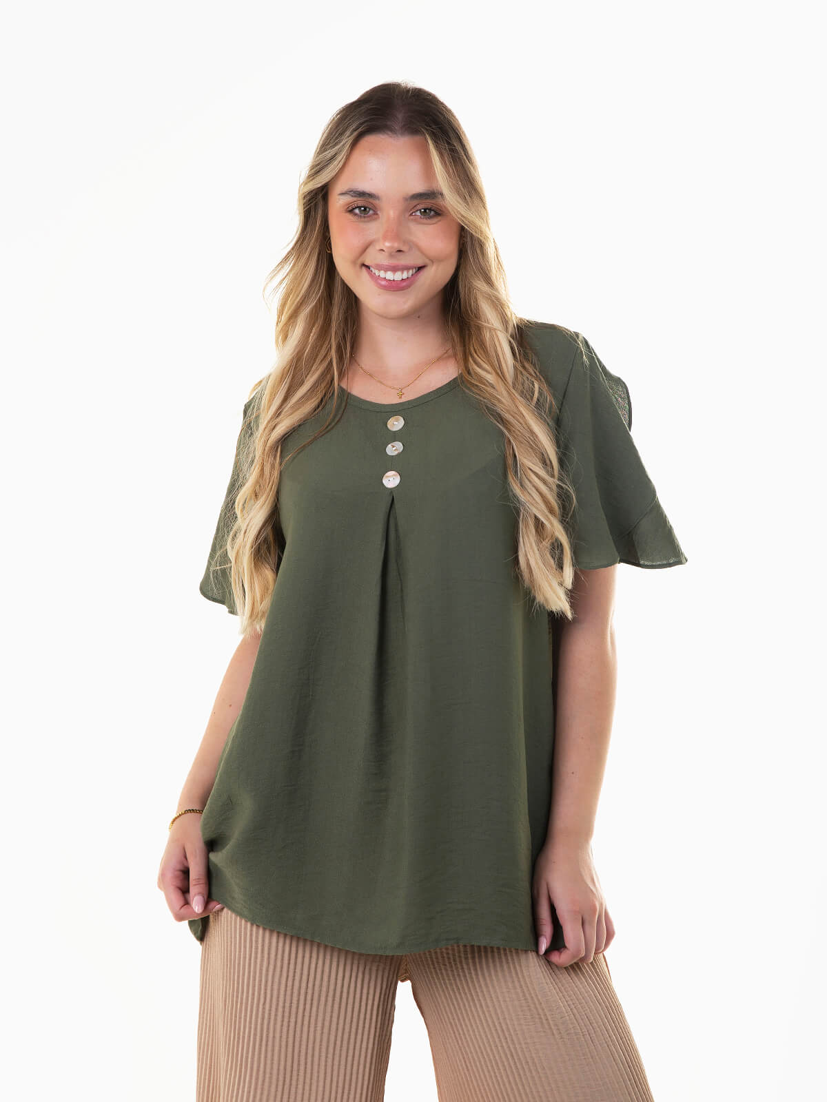 Blusa de manga curta com folhos para mulher. Blusa fluída com botões aplicados à frente e decote redondo.