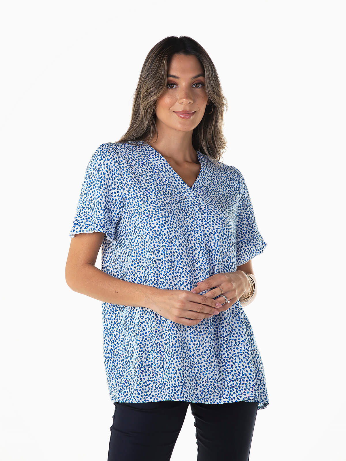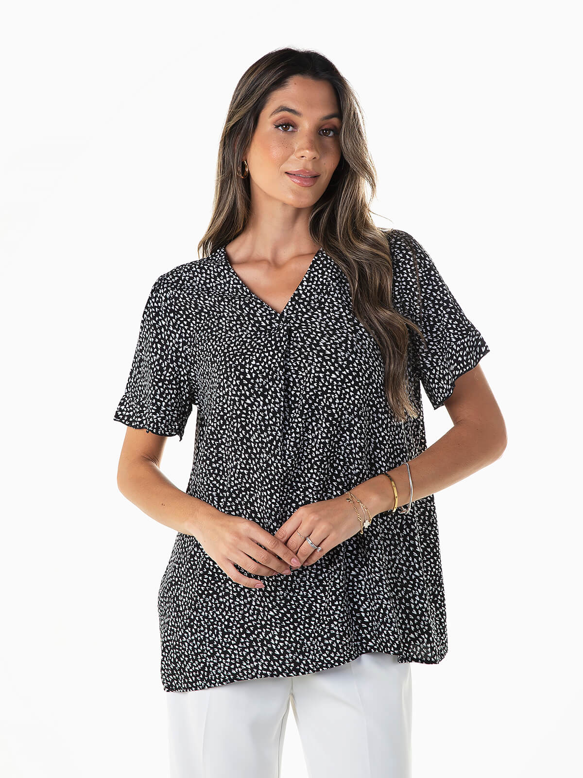 Blusa manga curta com estampado de corações. Blusa larga com decote em V e pormenor de prega.
