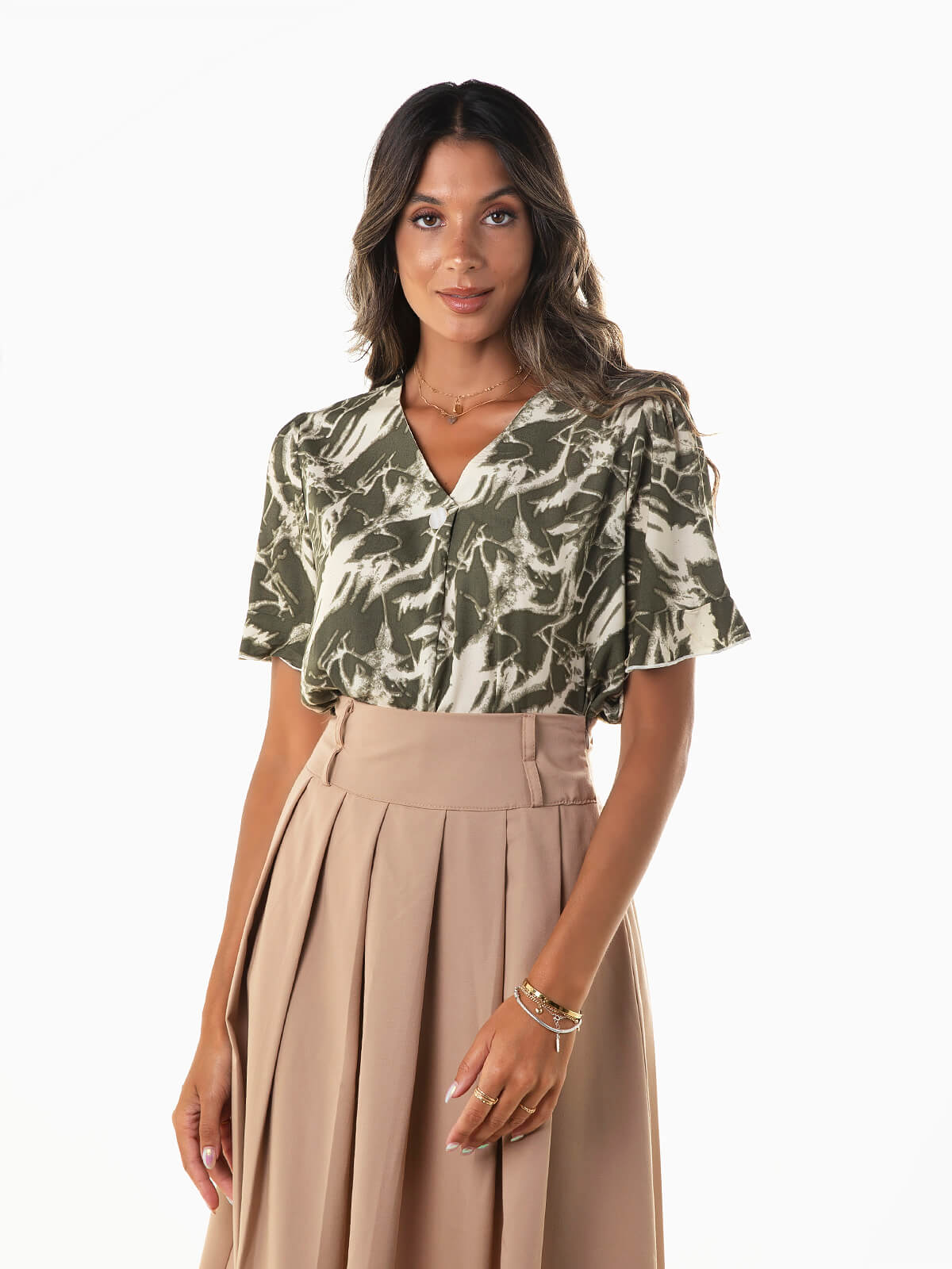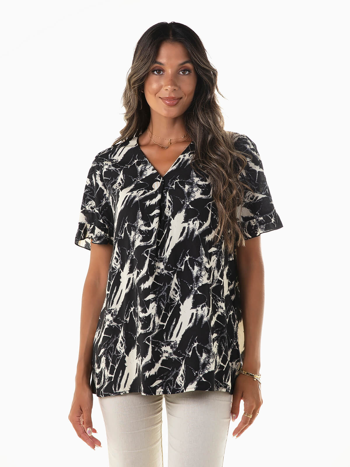 Blusa de manga curta com estampado abstrato confeccionada em tecido 100% algodão para maior conforto. Blusa com decote em bico e botão aplicado.