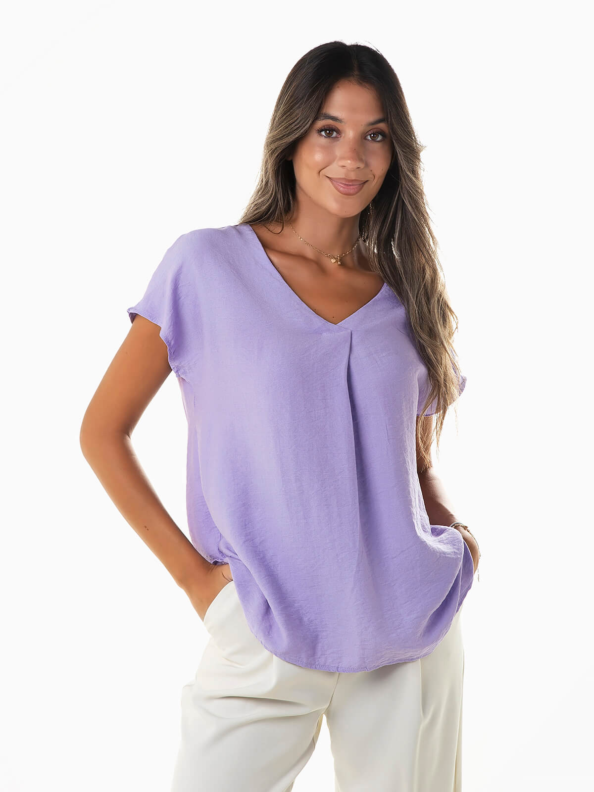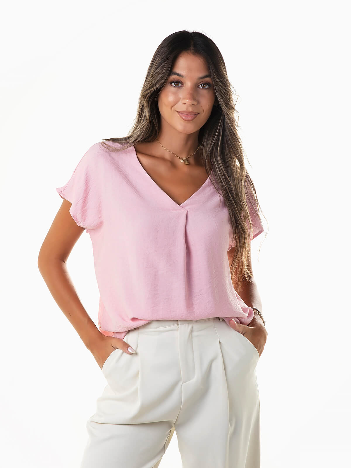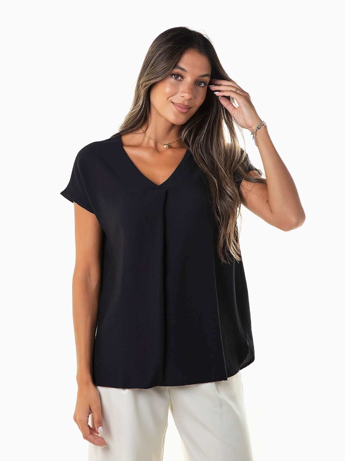 Blusa de manga curta para senhora. Blusa fluída com pormenor de prega à frente e decote em V. Tecido texturizado.