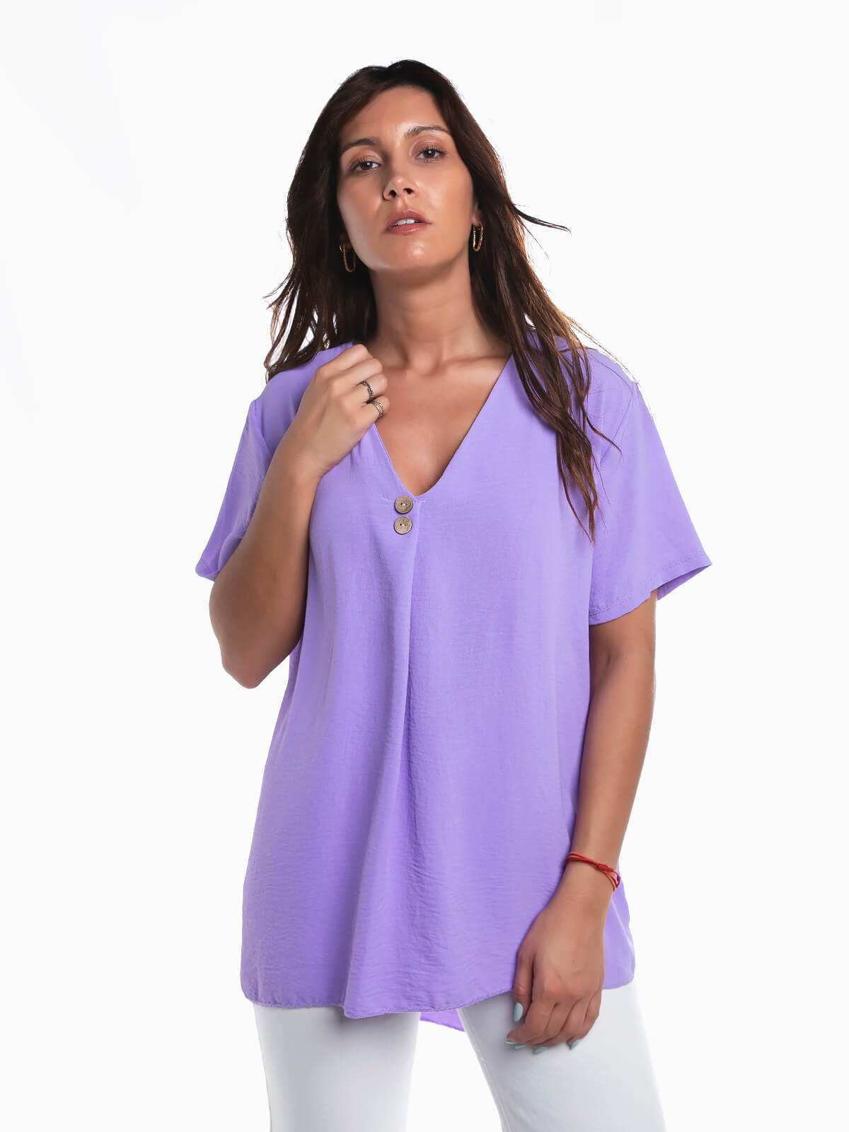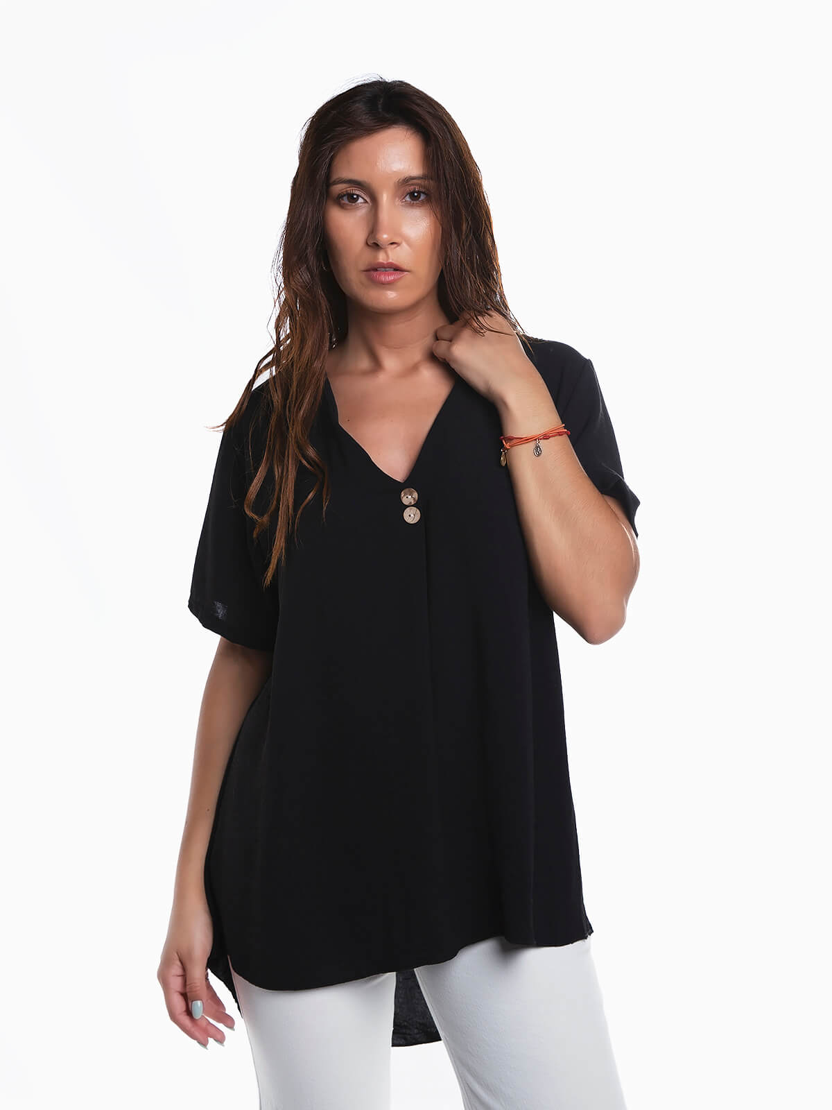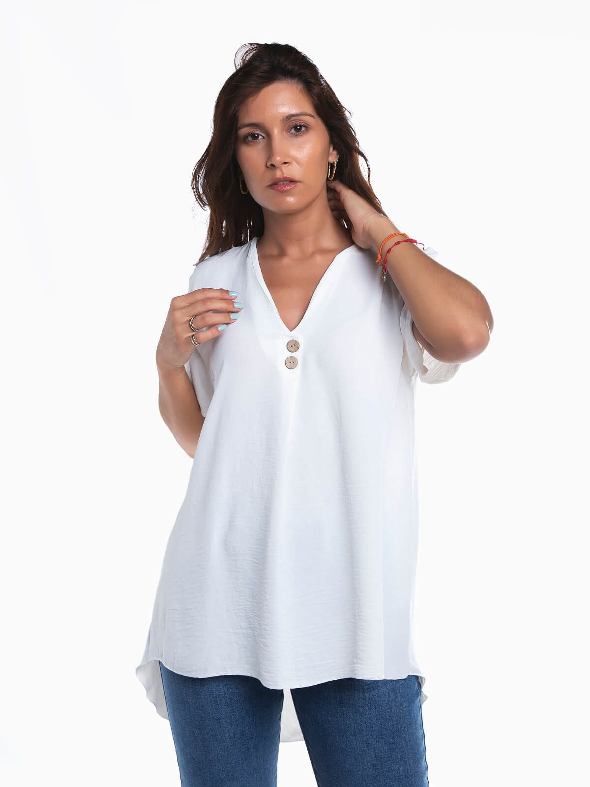 Blusa de manga curta com decote em V para senhora. Blusa fluída com cós arredondado mais comprido atrás. Dois botões decorativos.