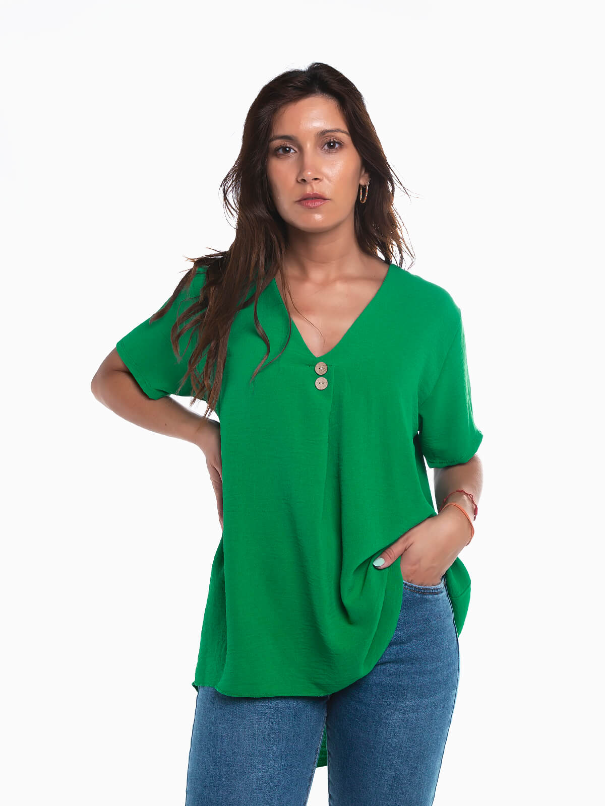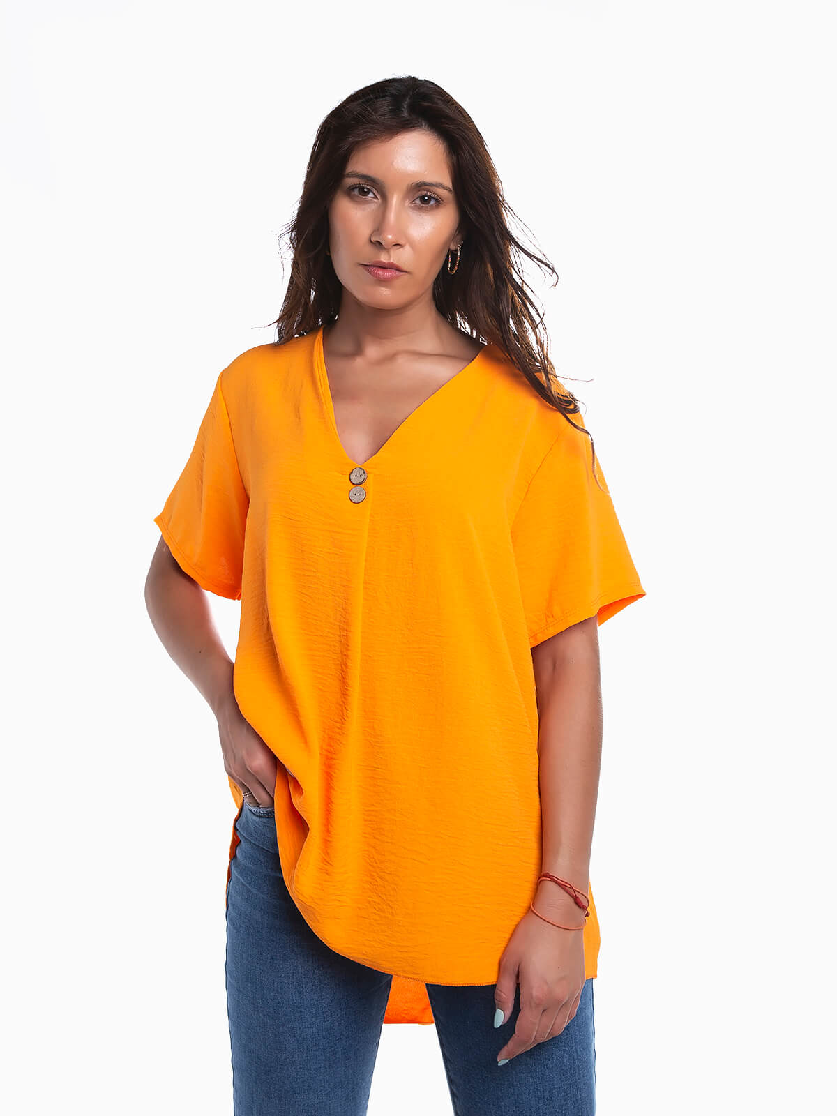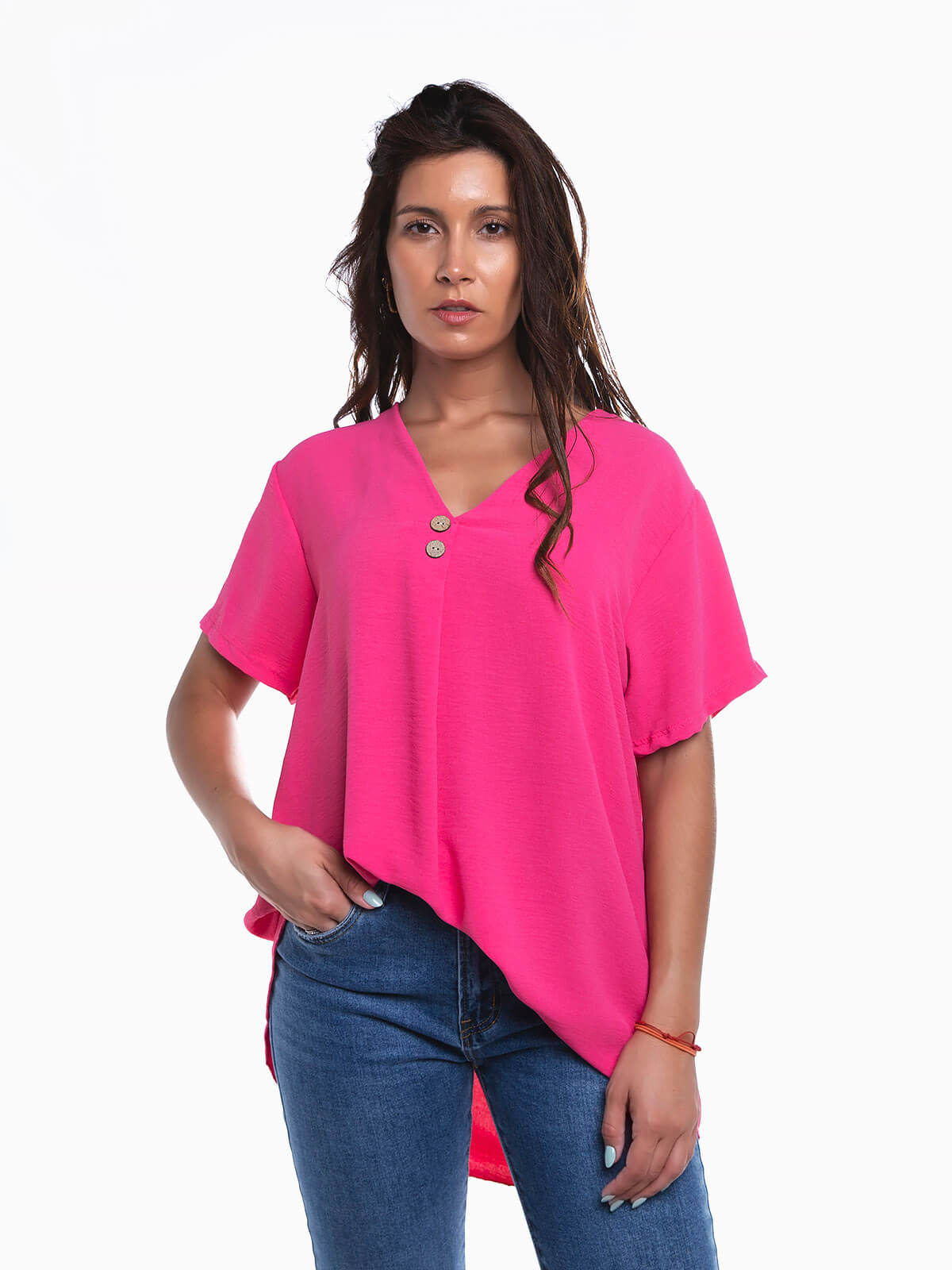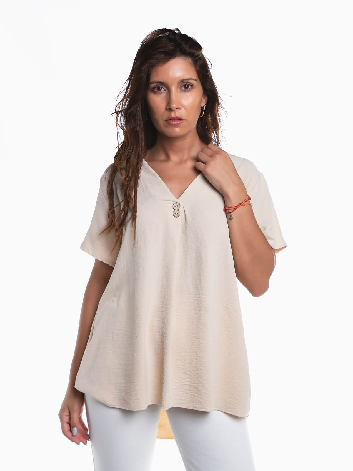 Blusa de manga curta com decote em V para senhora. Blusa fluída com cós arredondado mais comprido atrás. Dois botões decorativos.
