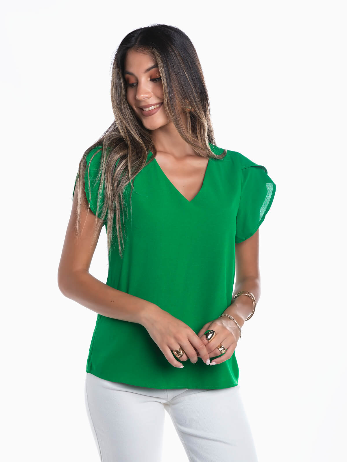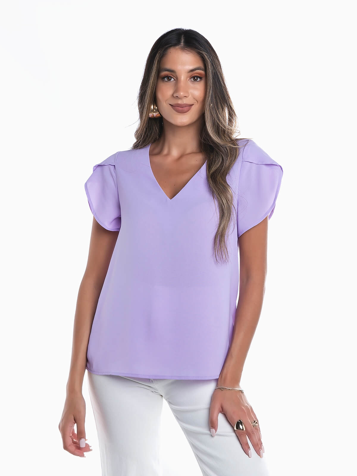 Blusa de manga curta com decote em bico. Blusa fluída com pormenor de folhos.