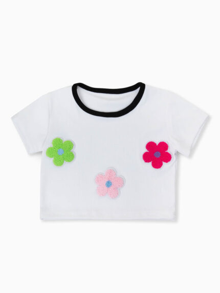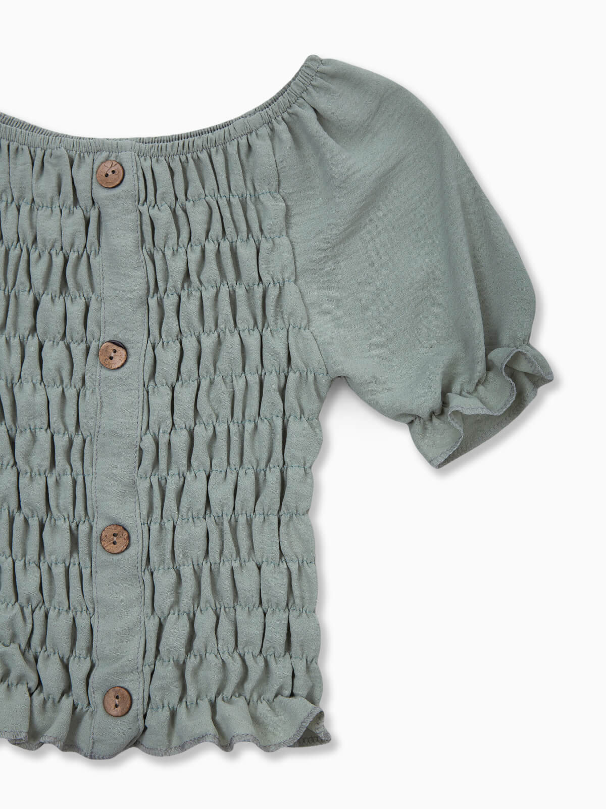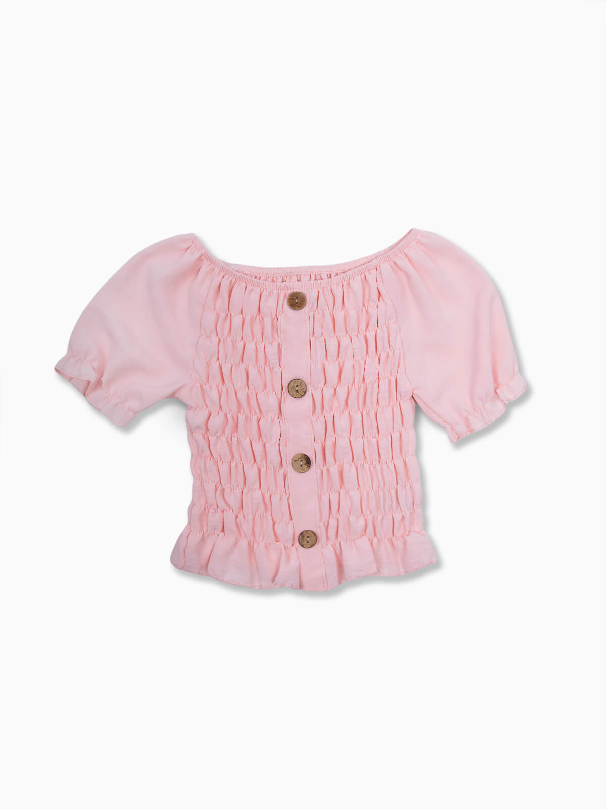 Blusa de manga curta com peito franzido e botões decorativos. Blusa para menina com decote barco elástico.