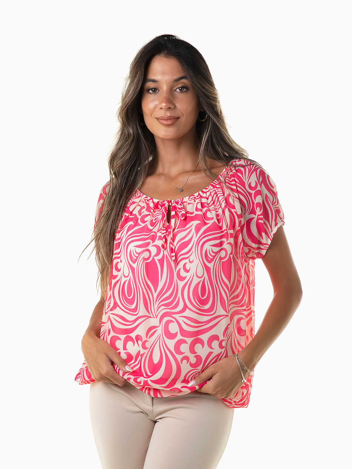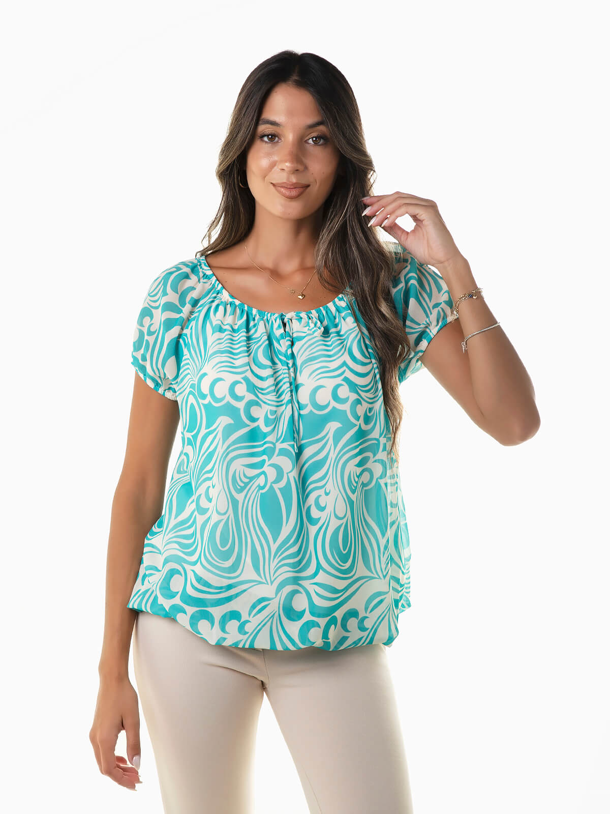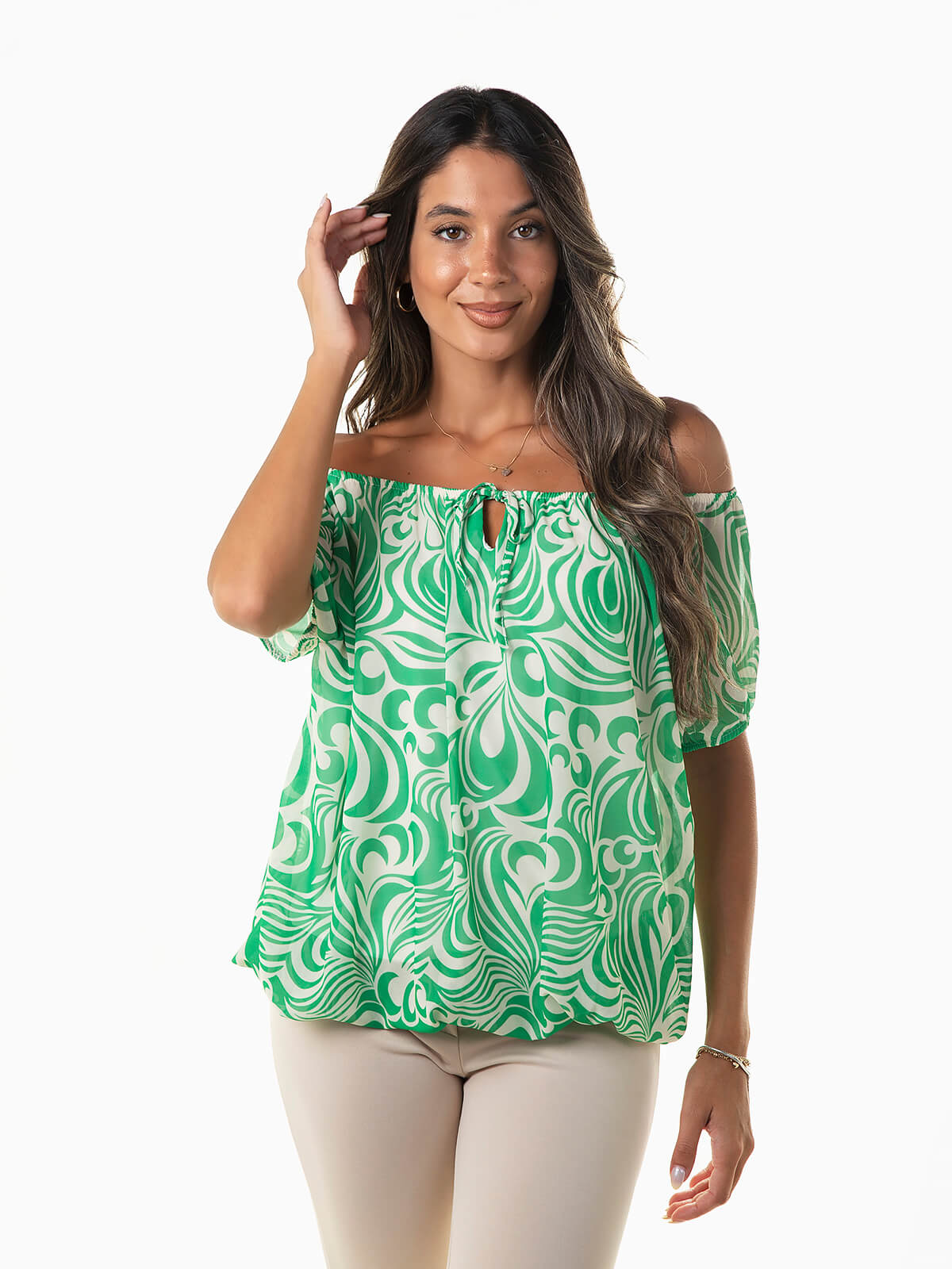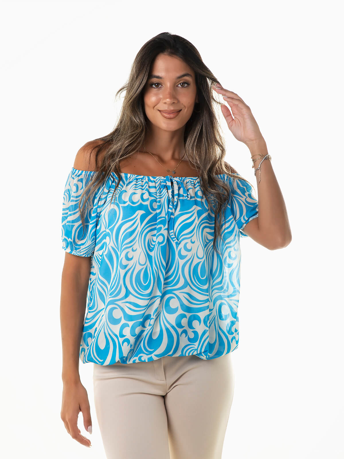 Blusa de manga curta com ombros descobertos para senhora. Blusa estampada com interior forrado. Cós elástico. Decote barco com cordão para laço.