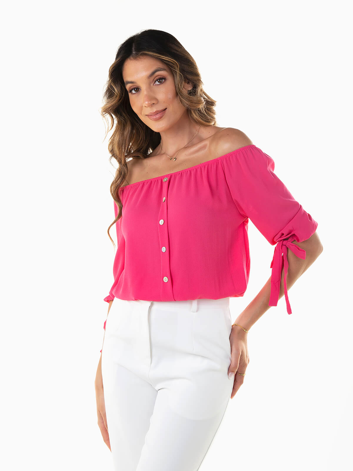 Blusa para mulher com ombros descobertos e botões aplicados. Blusa com manga 3/4 e aperto de laço. Extremidades elásticas.