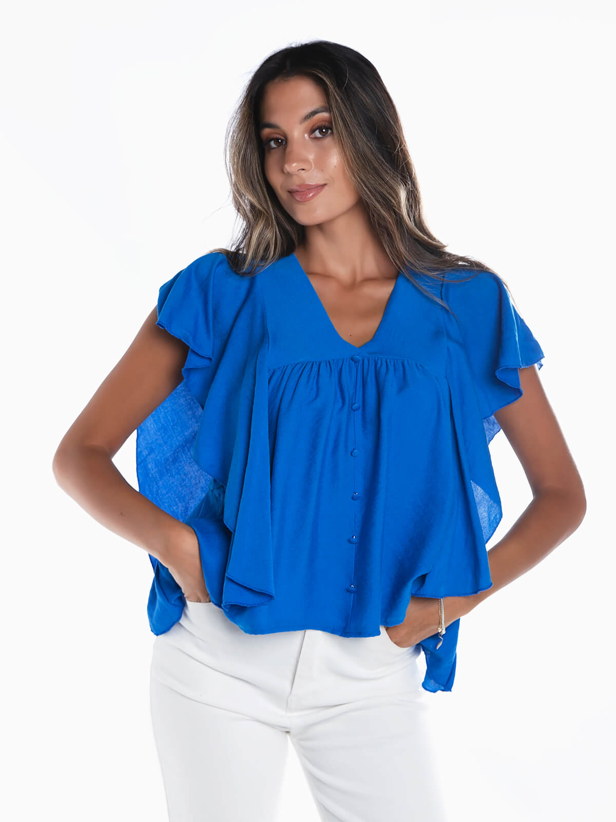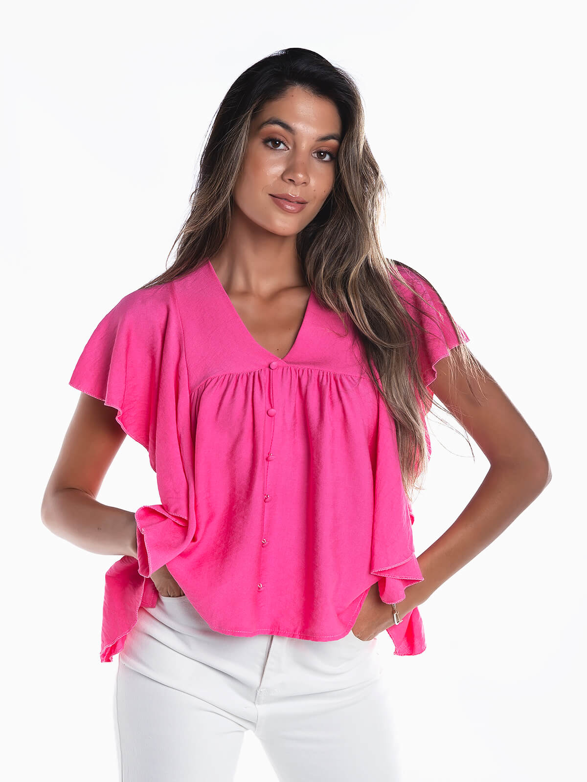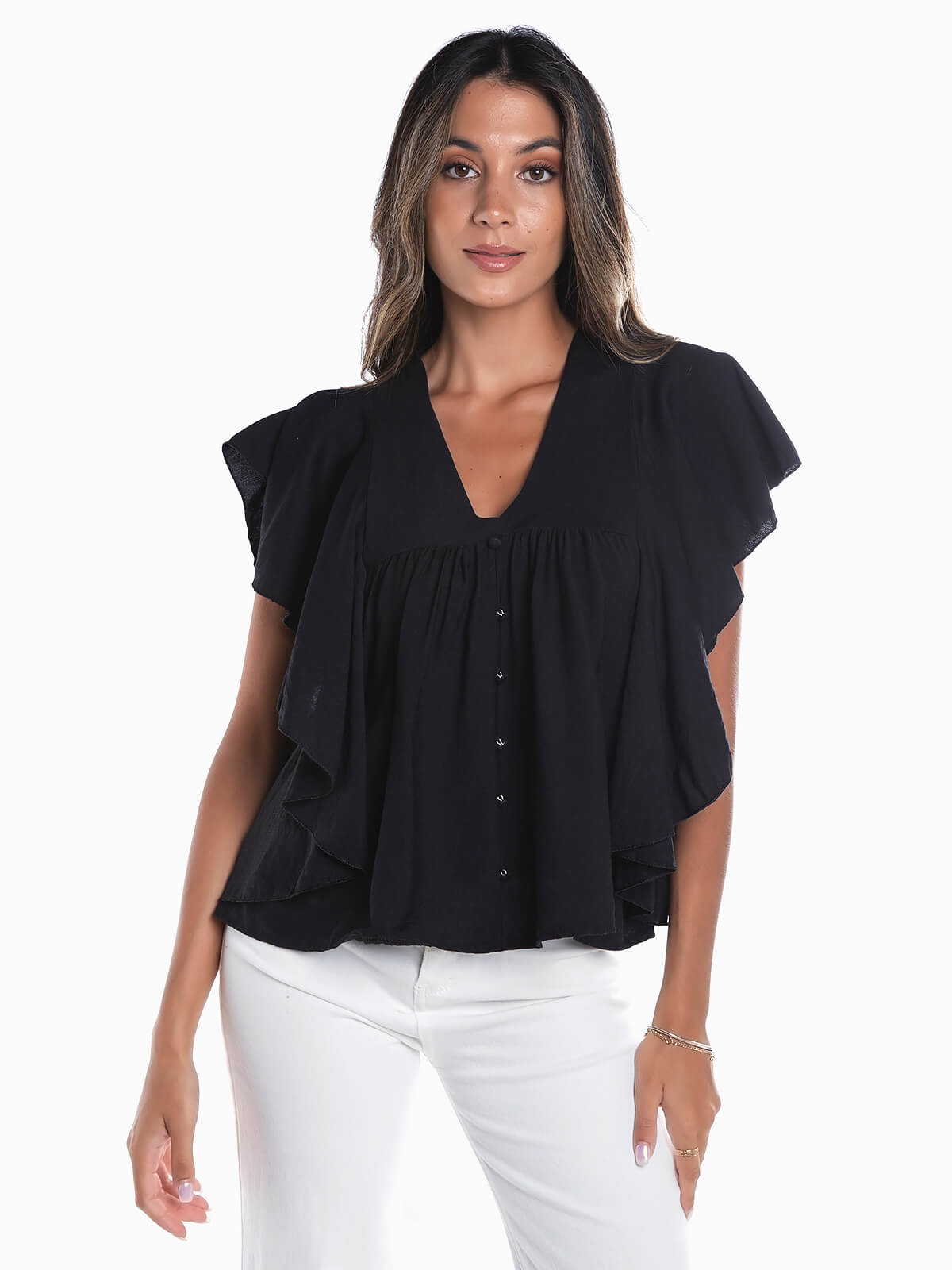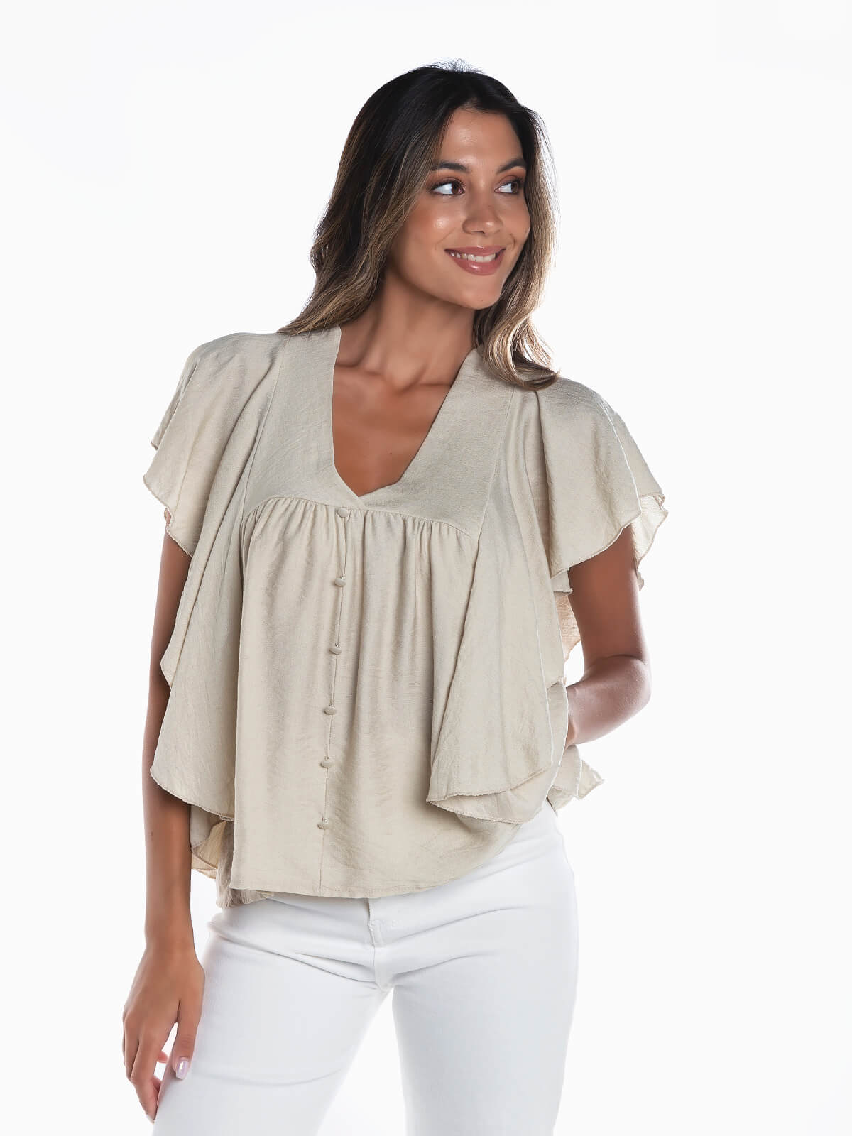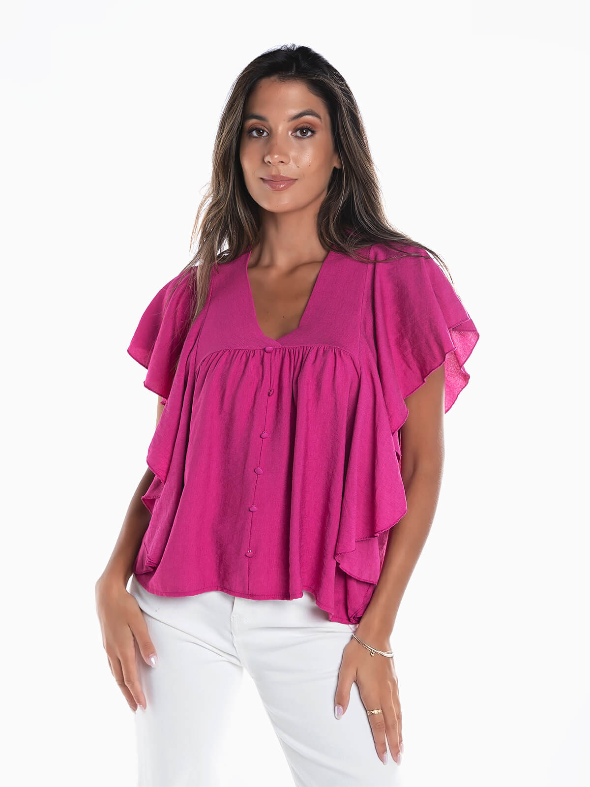 Blusa sem mangas com decote em V para senhora. Blusa em tecido viscose com encaixe de folhos na cava. Botões forrados decorativos.