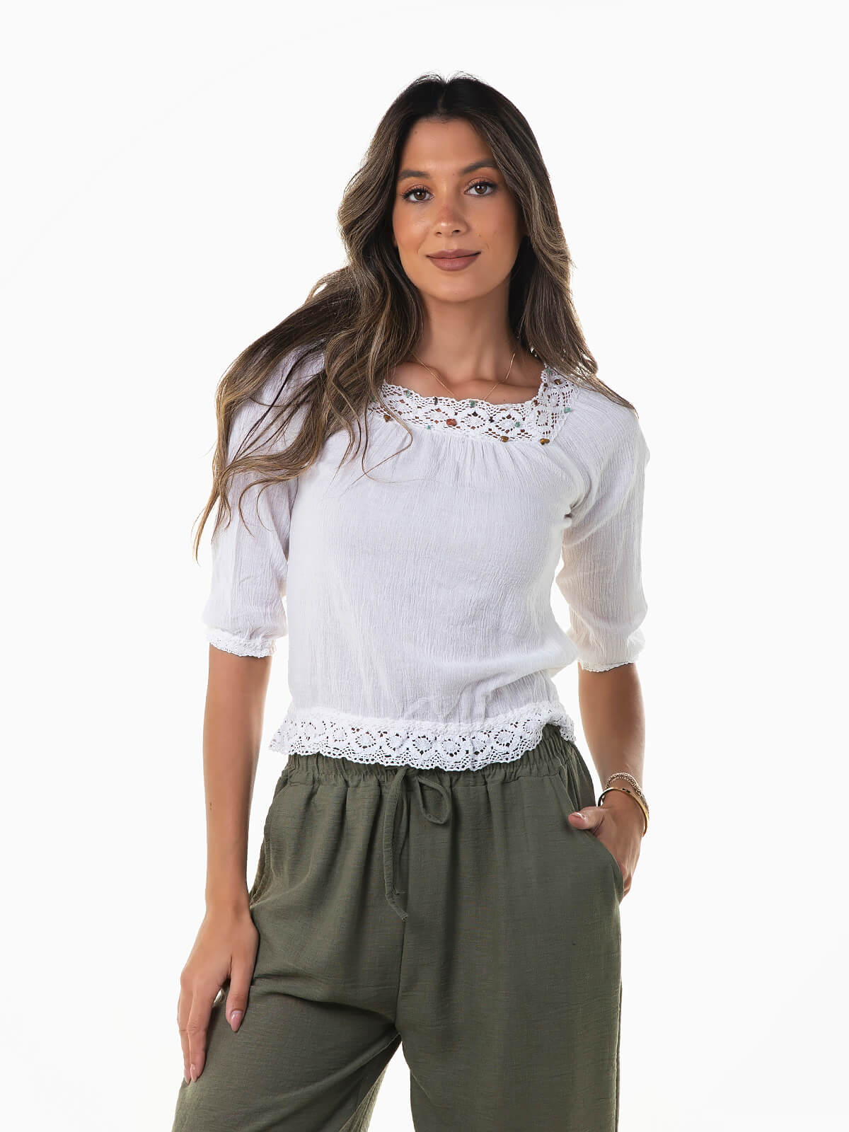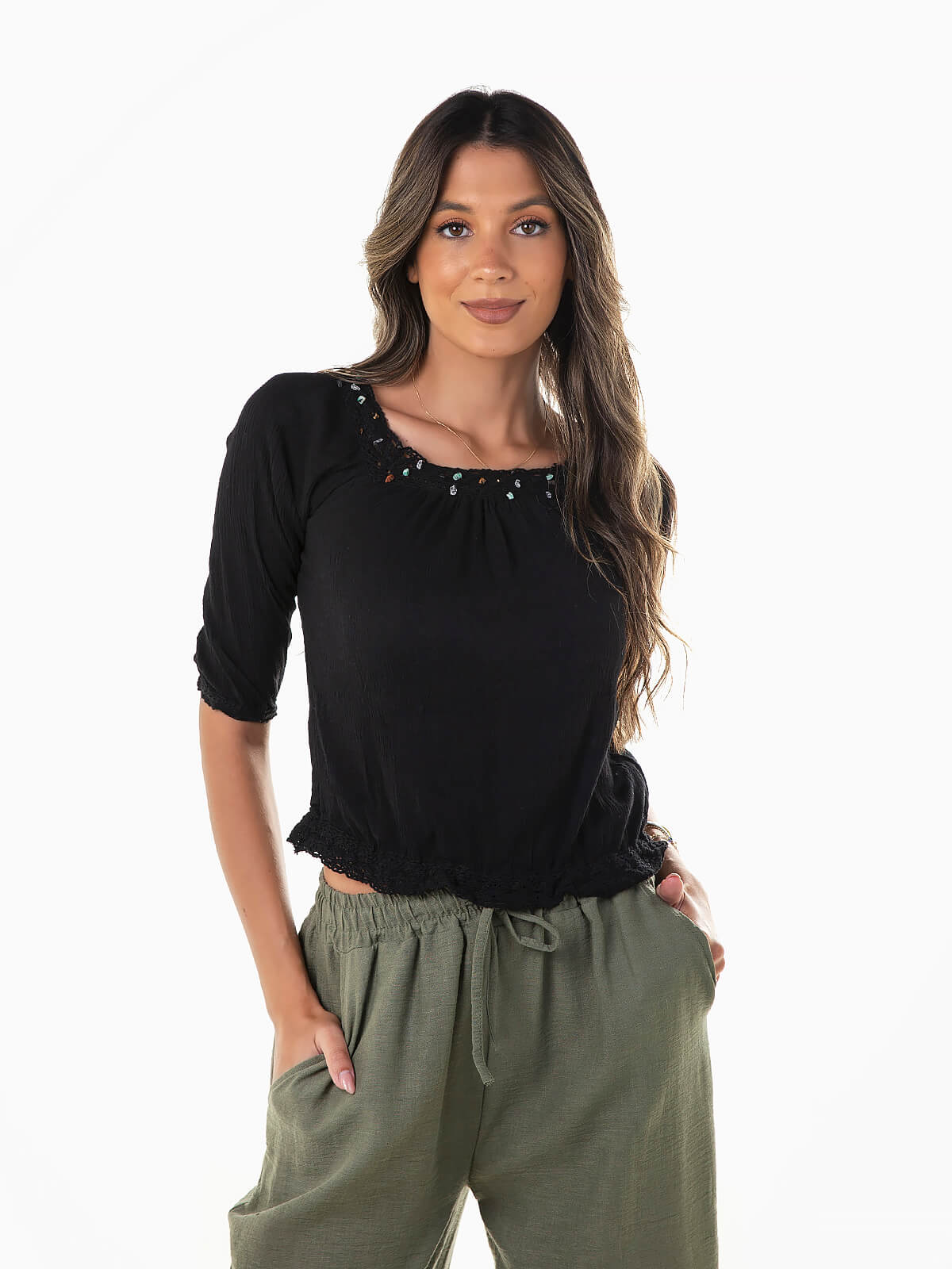 Blusa em tecido crepe com manga 3/4 para senhora. Extremidades em crochet com pedras aplicadas. Decote quadrado e base com elástico.
