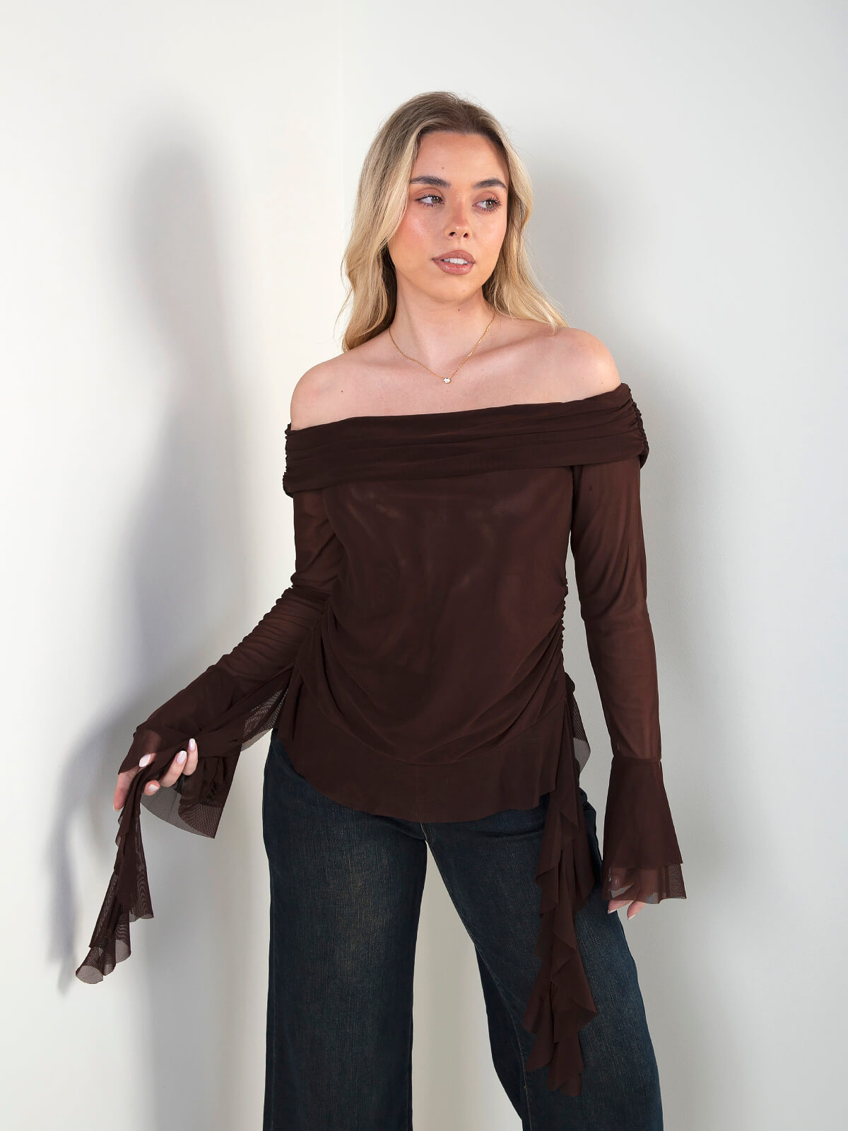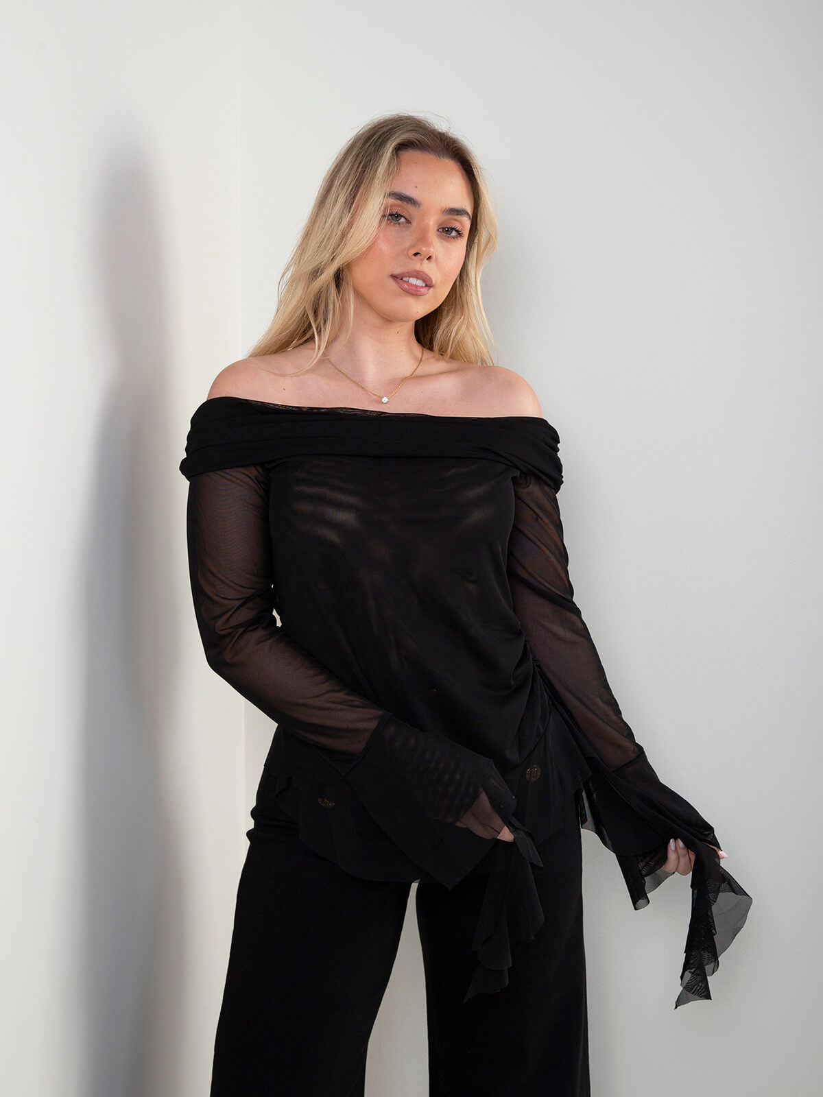 Blusa em tule leve com decote barco e mangas à boca de sino. Um modelo fluido e elegante, ideal para looks sofisticados de dia ou de noite.