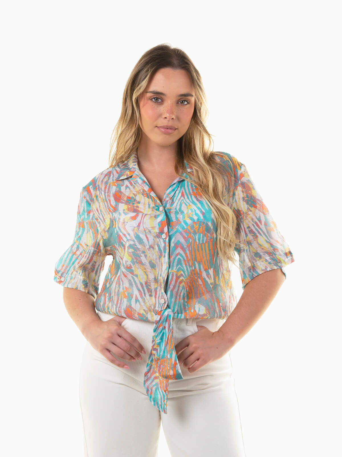 Blusa verde água com padrão abstrato para mulher. Blusa de manga curta em tecido semitransparente com nó na base. Gola abas. Aperto frontal de botões.
