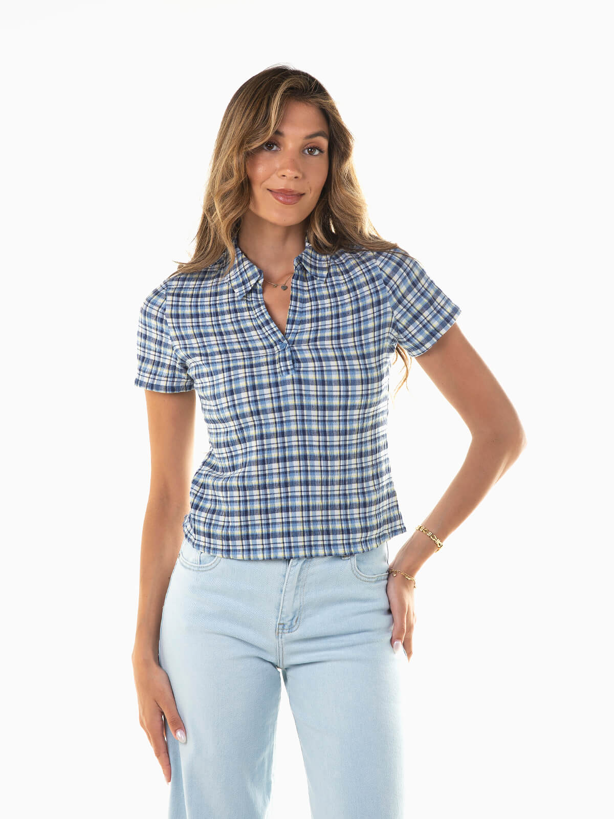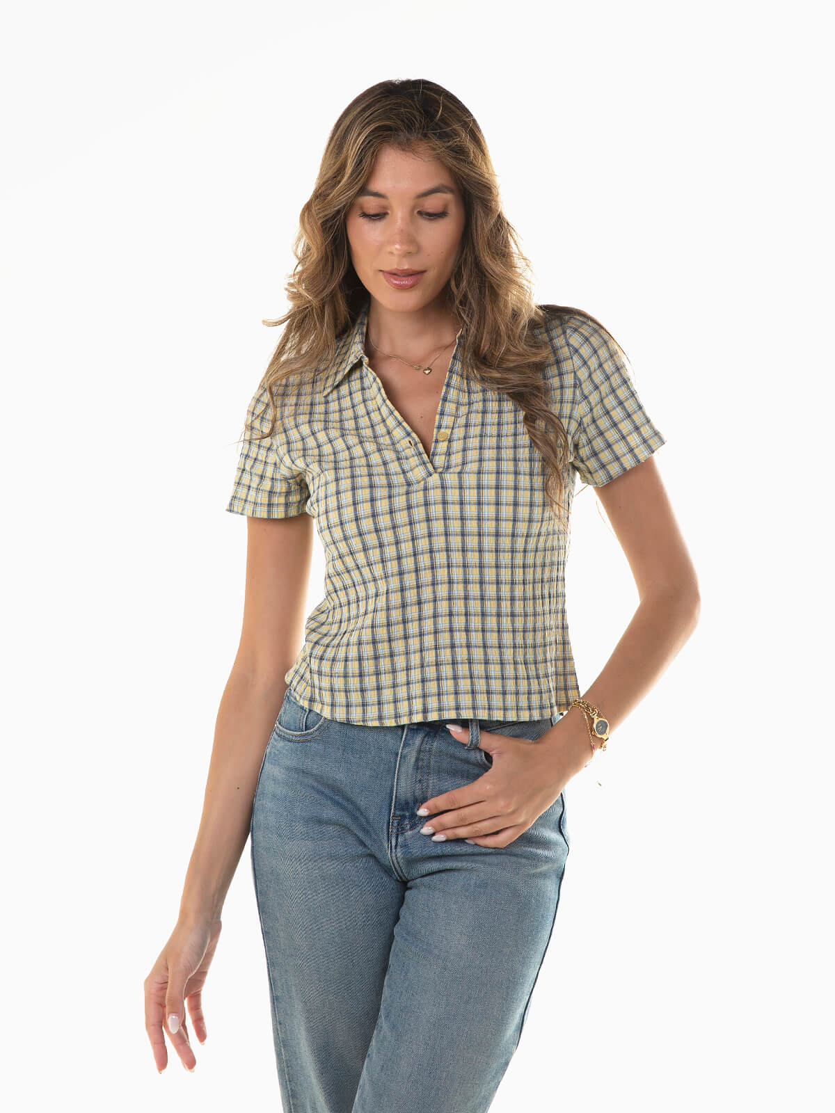 Blusa em xadrez com manga curta para mulher. Blusa justa em tecido texturizado com gola de abas, decote em V e aperto de botão.