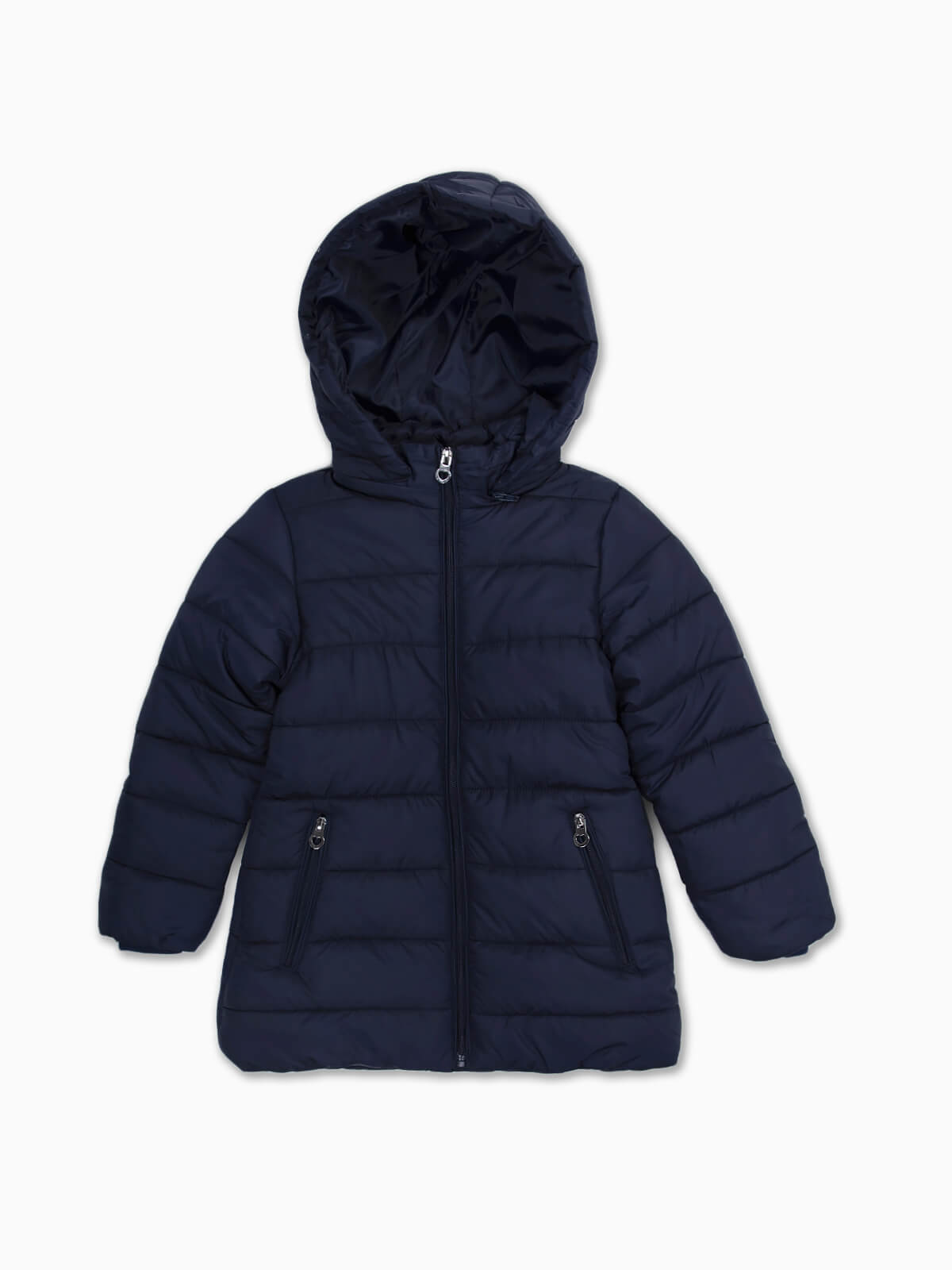 Blusão acolchoado azul marinho com capuz removível. Blusão impermeável cintado para menina de manga comprida acabada com punho em malha. Forrado. Gola subida. Aperto frontal de fecho zíper.