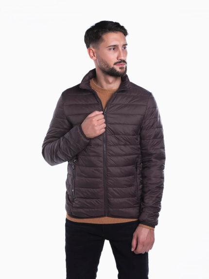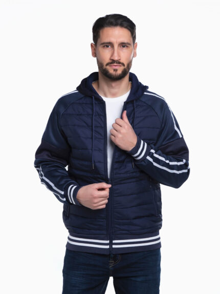 Blusão acolchoado azul marinho com capuz removível para homem. Blusão impermeável com gola subida e manga comprida. 2 bolsos. Aperto de fecho zíper.