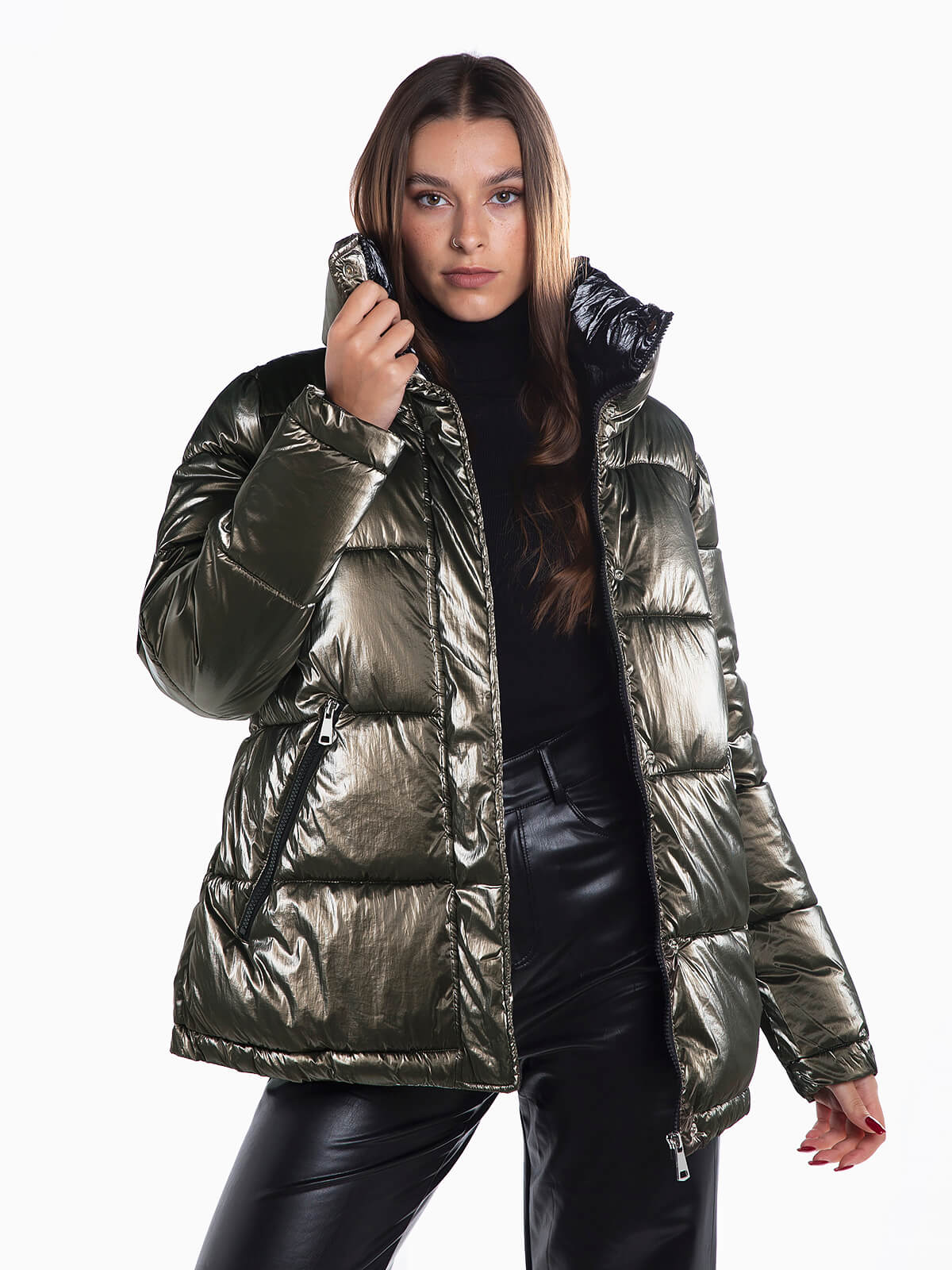 Blusão acolchoado brilhante com gola alta para senhora. Blusão impermeável com 2 bolsos laterais. Aperto fecho zíper e botões pressão.