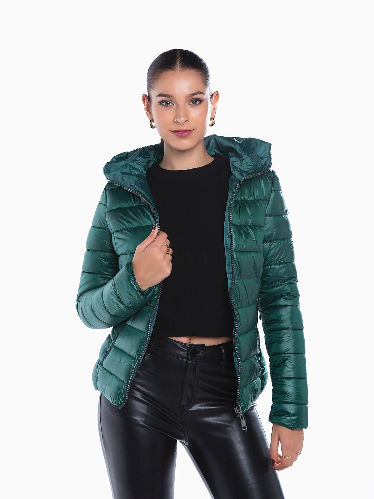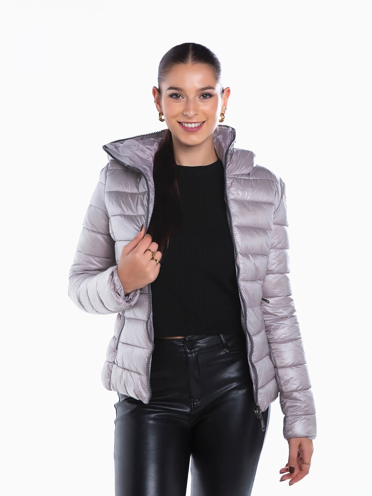 Blusão acolchoado capuz com dois bolsos laterais. Blusão impermeável forrado de manga comprida com aperto de fecho éclair até ao capuz.