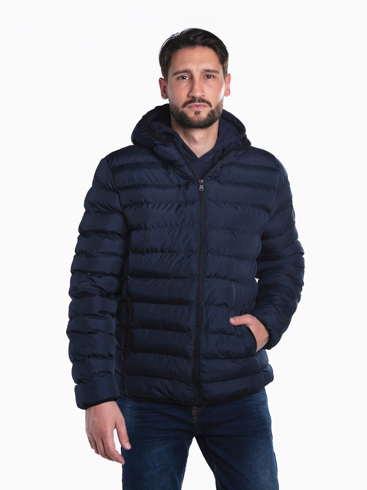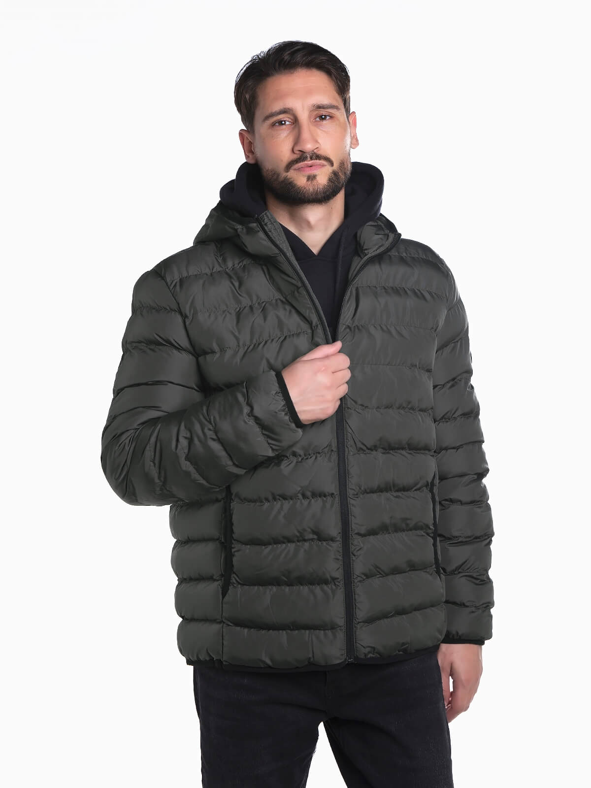 Blusão acolchoado com capuz e símbolo em borracha aplicado na manga. Blusão impermeável manga comprida com bolso interior e dois laterais. Gola subida. Aperto de fecho zíper.