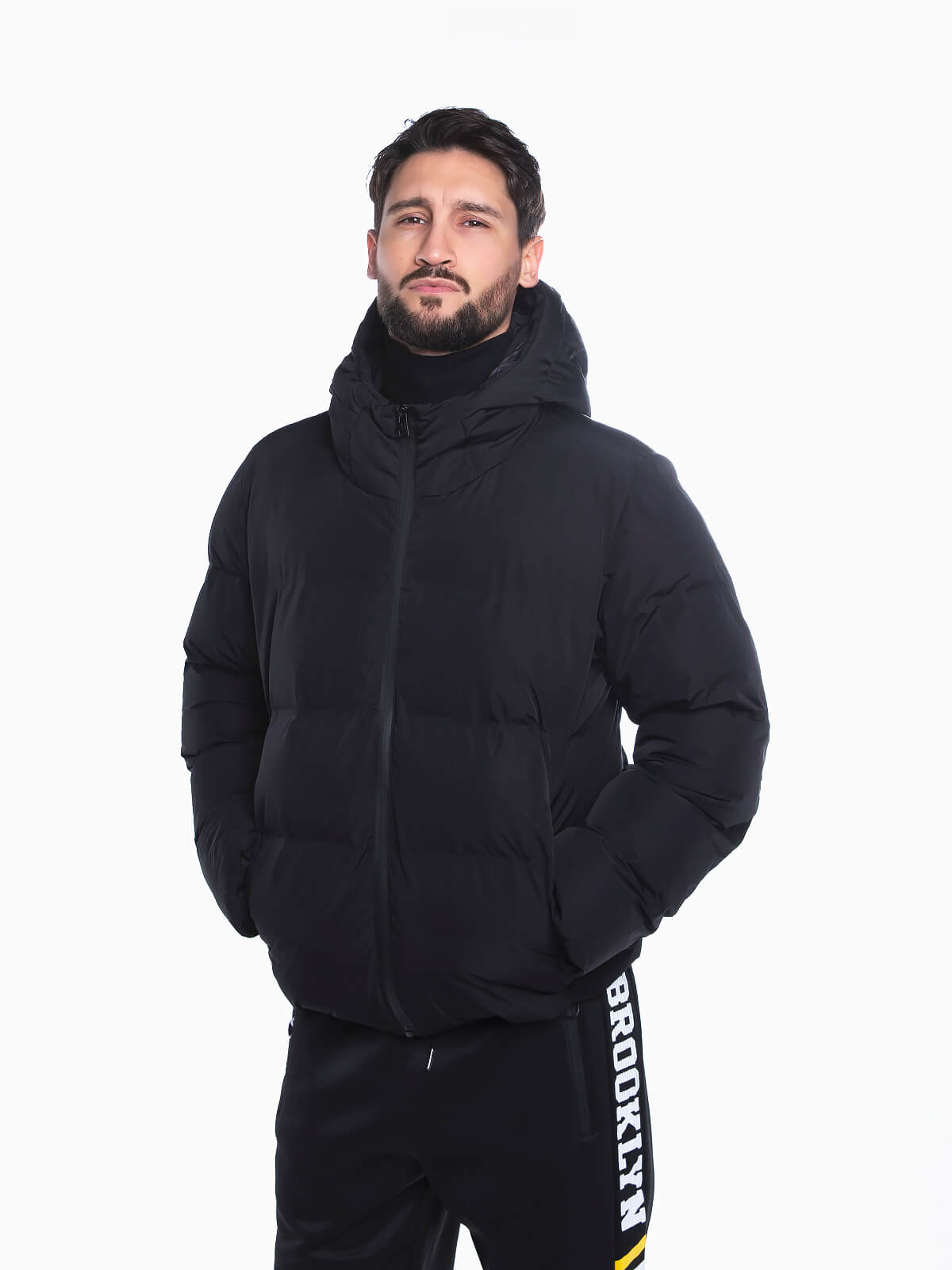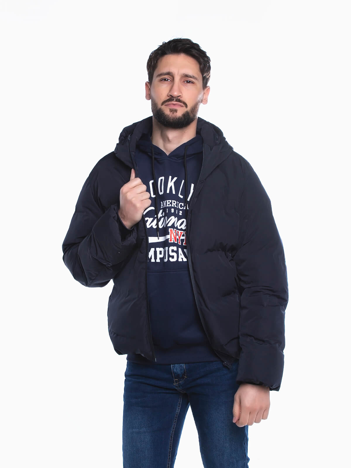 Blusão acolchoado com capuz para homem. Blusão impermeável com gola alta. Cós e capuz com elástico para ajustar. Manga comprida. Bolso interior. 2 bolsos laterais. Aperto de fecho zíper.