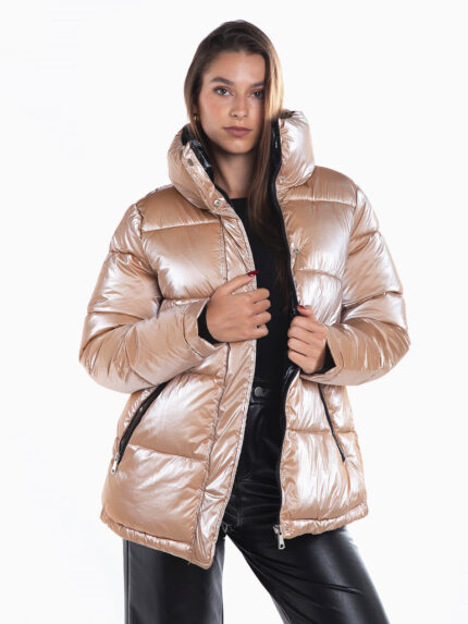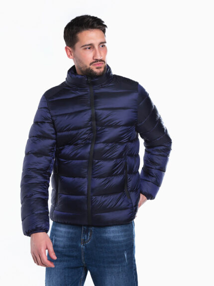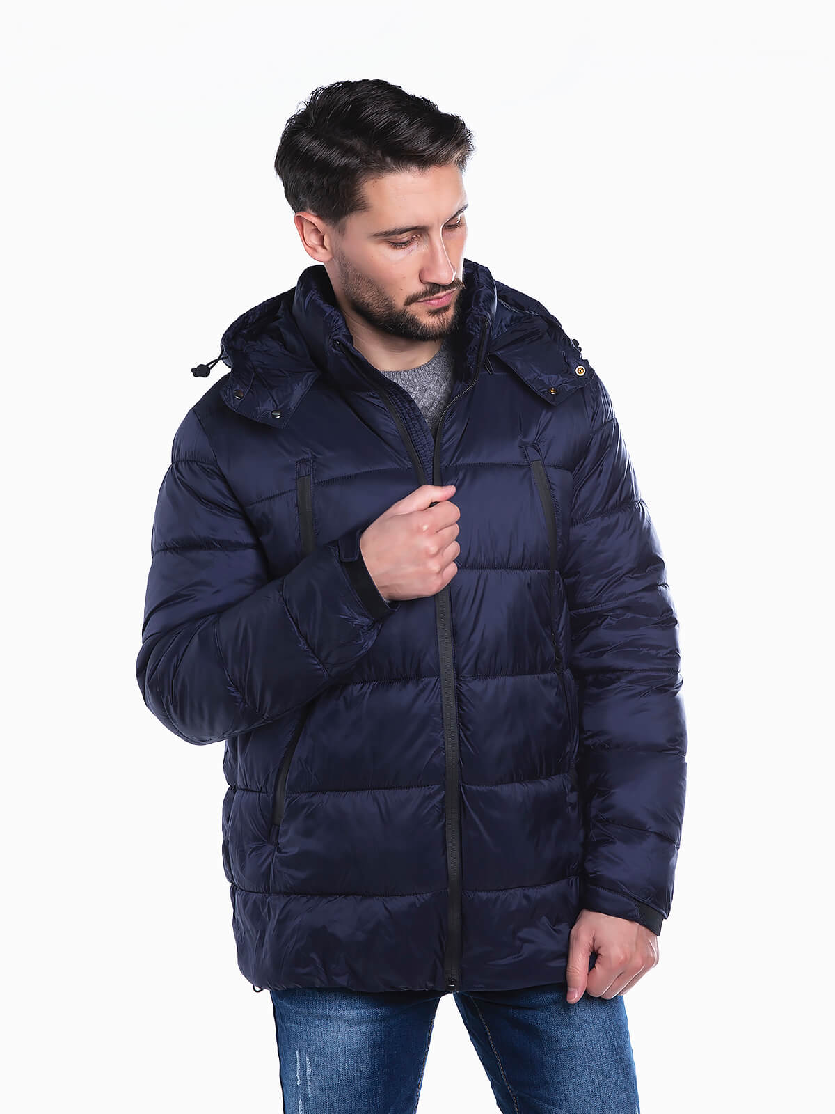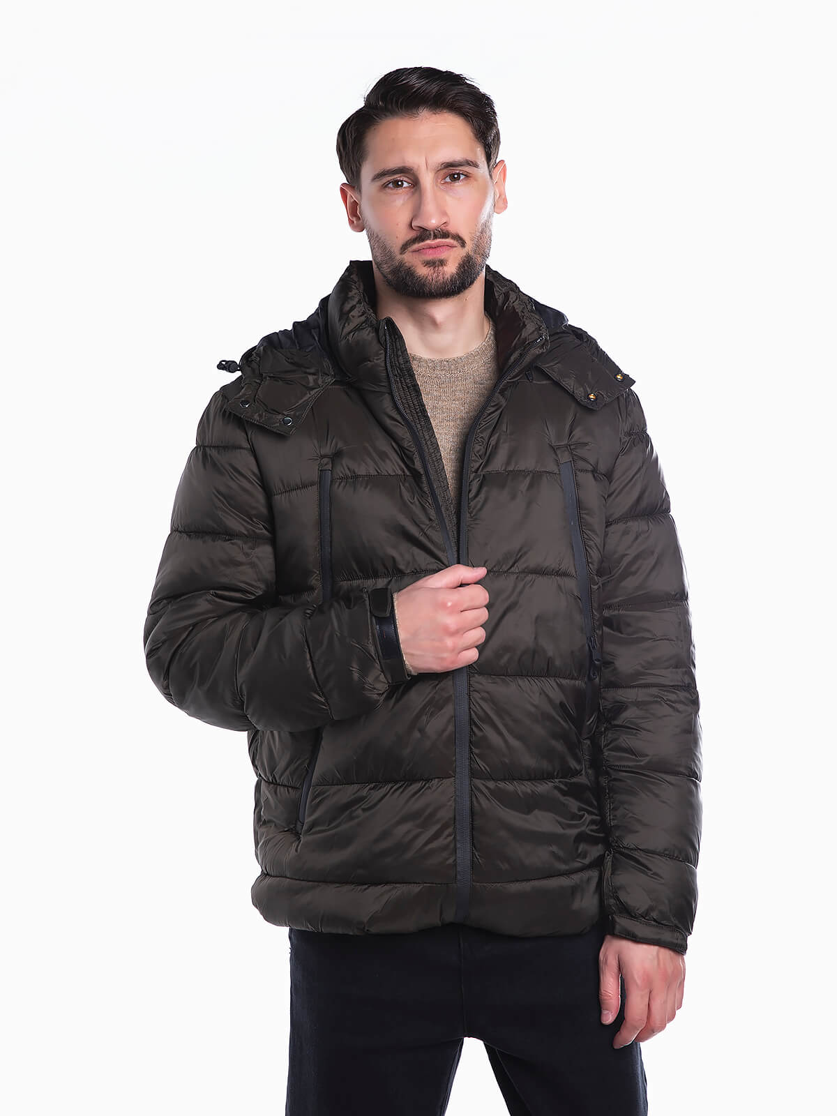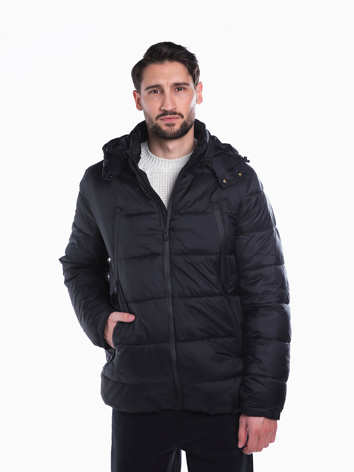 Blusão acolchoado com capuz amovível. Blusão impermeável com gola subida e bolso interior. Punhos com presilha ajustável com fecho aderente. Cordão de ajuste elástico oculto no cós. Fechos zíper frontais compostos por dois bolsos.