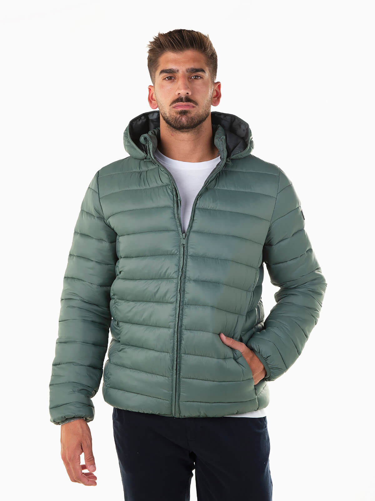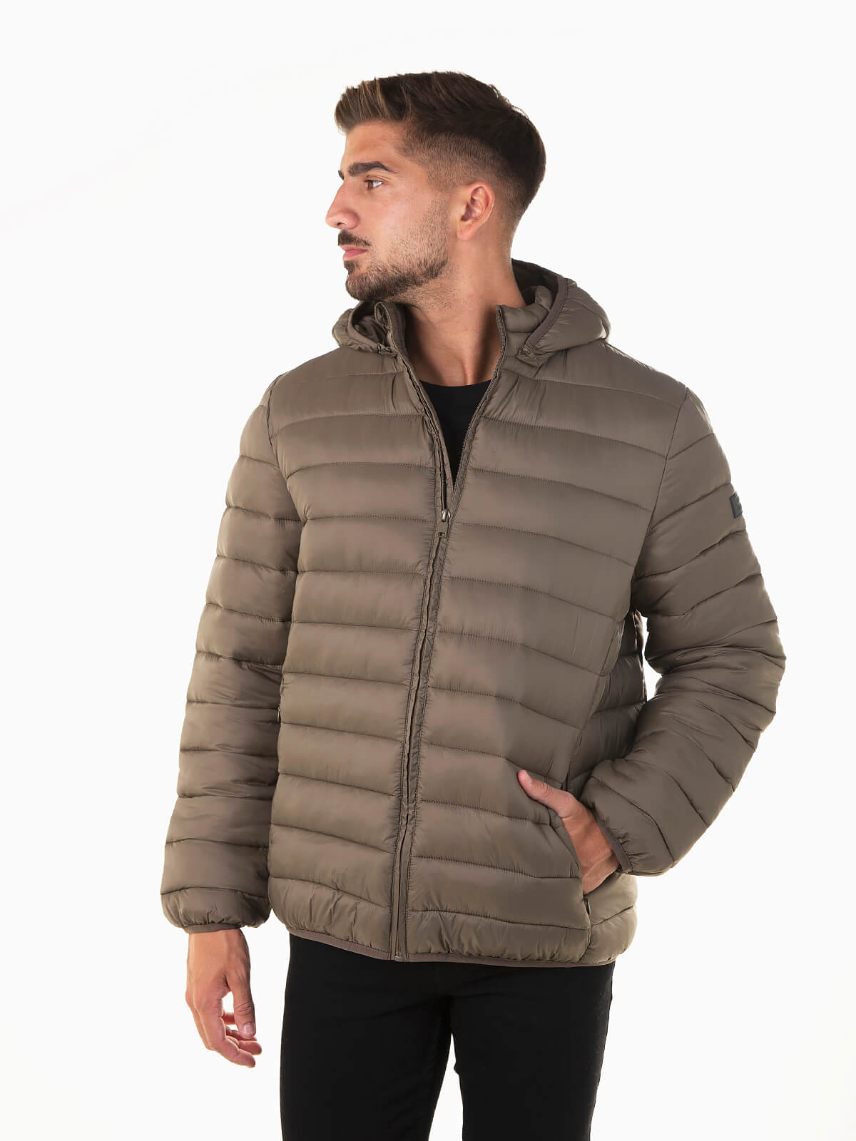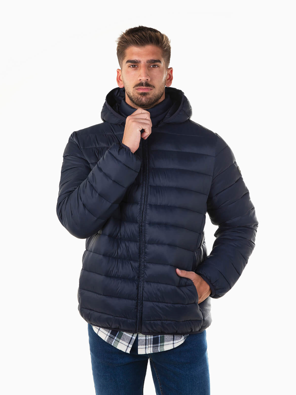Blusão acolchoado leve para homem com capuz removível e fecho de zíper. Modelo funcional com dois bolsos exteriores e um bolso interior. Proporciona proteção ligeira contra a chuva e máximo conforto — ideal para o dia a dia ou para looks casuais de meia-estação.