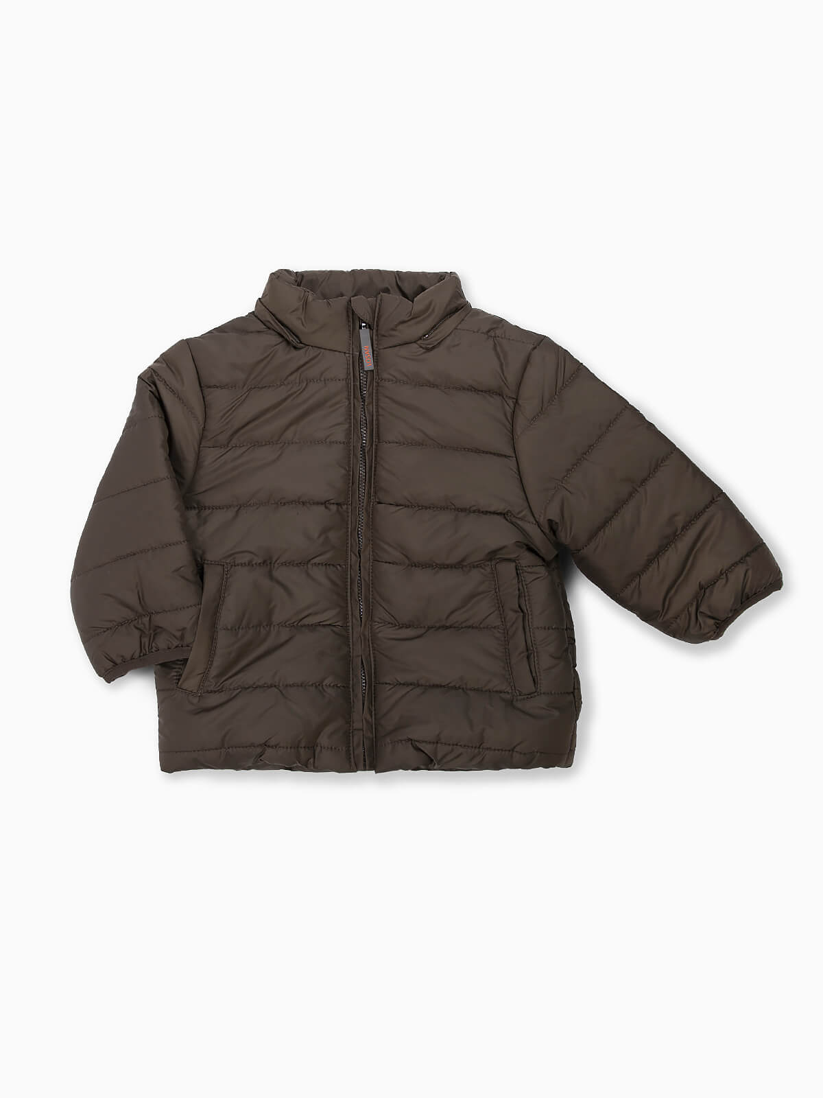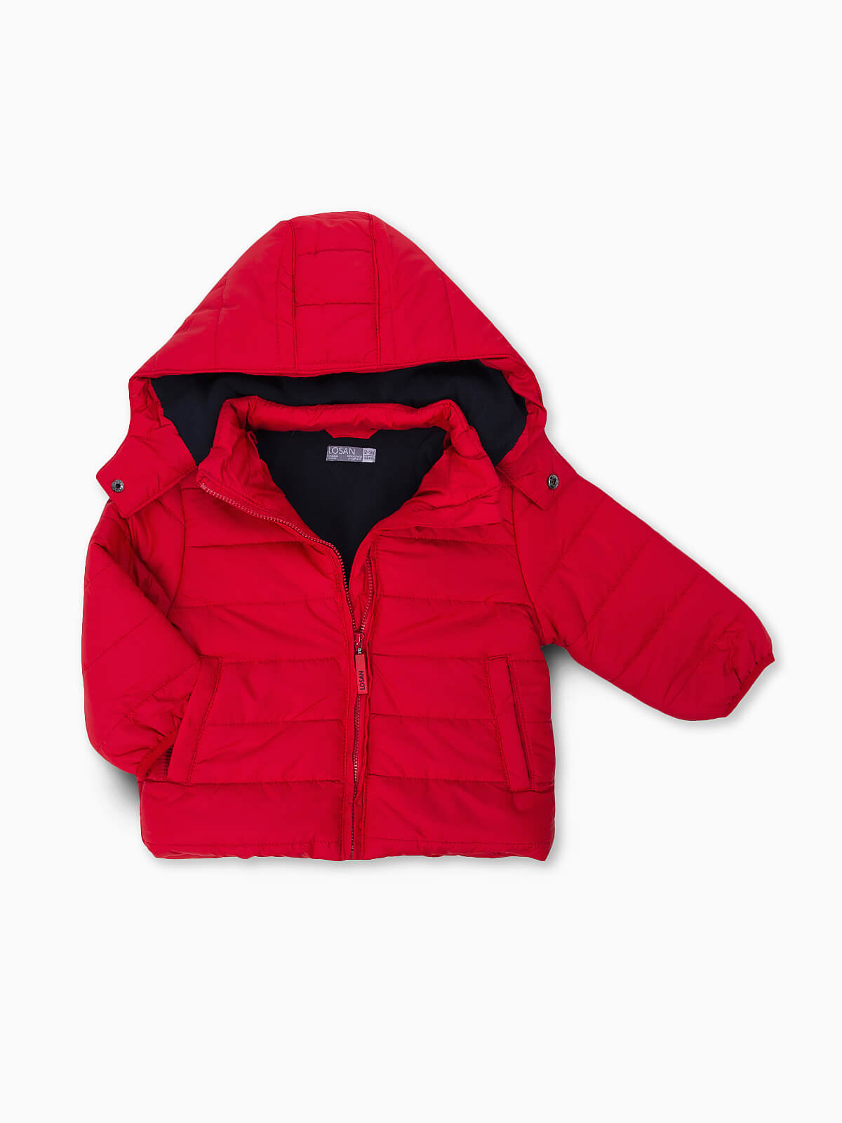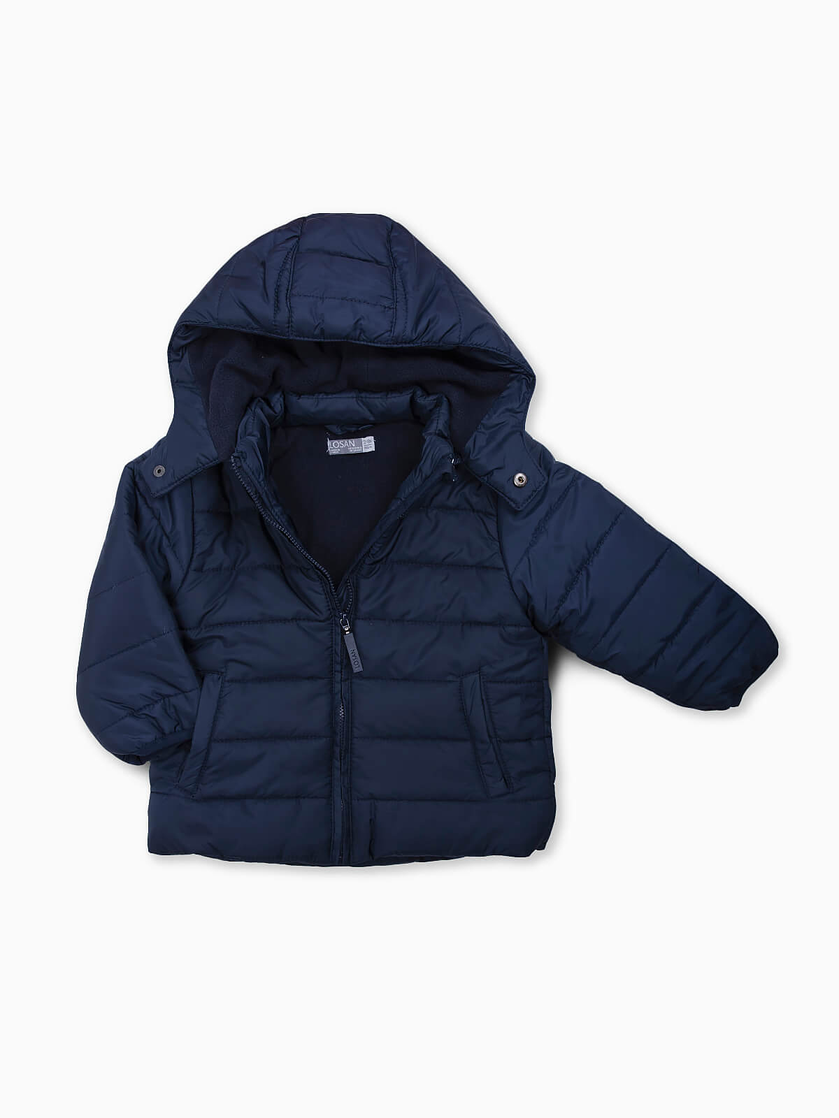 Blusão acolchoado impermeável para bebé menino. Capuz removivél. Forro interior polar. Bolsos de lado. Aperto com fecho éclair.